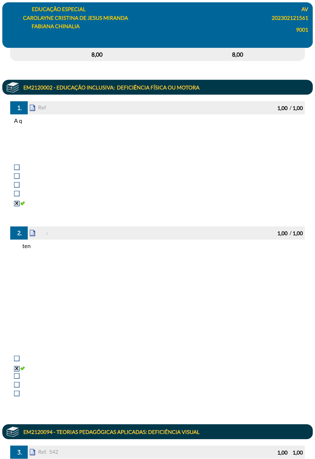 24/11/2023, 09:31 EPS https://simulado.estacio.br/alunos/ 1/4 Disciplina: EDUCAÇÃO ESPECIAL AV Aluno: CAROLAYNE CRISTINA DE JESUS MIRANDA 202302121561 Professor: FABIANA CHINALIA Turma: 9001 DGT0085_AV_202302121561 (AG) 21/11/2023 11:51:11 (F) Avaliação: 8,00 pts Nota SIA: 8,00 pts EM2120002 - EDUCAÇÃO INCLUSIVA: DEFICIÊNCIA FÍSICA OU MOTORA 1. Ref.: 5419516 Pontos: 1,00 / 1,00 A questão arquitetônica na escola é de suma importância para o acesso, cotidiano, relacionamento e interação da pessoa com DF. Um degrau pode di�cultar o acesso de uma criança cadeirante à sala de aula. Aponte uma possível solução para essa questão: Um dos alunos �car responsável para o acesso desse colega. Colocar algum objeto para a criança conseguir entrar com a cadeira. Todos colegas ajudarem no acesso à sala. Revezar a responsabilidade do acesso desse aluno para cada colega. Exigir a construção de uma rampa nivelada para o acesso do aluno. 2. Ref.: 5419585 Pontos: 1,00 / 1,00 Na tentativa e pensamento de incluir a PCD na escola, é fundamental que toda a comunidade escolar tenha plena consciência da melhor forma de lidar com essa situação. Dessa forma, analise estas a�rmativas e marque a opção correta: I - O importante é a escola e o professor terem um entendimento e um conjunto de ações que promovam a participação igualitária do aluno com DF. II - Independentemente da disciplina que será trabalhada com o aluno, é necessário que o professor tenha um pensamento inclusivo. III - Não temos tempo a perder na escola, então deve-se construir ou adaptar rampas e acessórios, mesmo que um pouco inseguros, mas que o aluno com DF consiga chegar à sala. IV - O professor e a escola, criando um ambiente mais acessível entre alunos e todos que circulam no ambiente é de suma importância, para melhora da acessibilidade. Somente são verdadeiras: I e II. Somente são verdadeiras: I, II e IV. Somente são verdadeiras: II, III e IV. Somente são verdadeiras: I e IV. Somente são verdadeiras: III e IV. EM2120094 - TEORIAS PEDAGÓGICAS APLICADAS: DEFICIÊNCIA VISUAL 3. Ref.: 5423789 Pontos: 1,00 / 1,00 javascript:alert('C%C3%B3digo da quest%C3%A3o: 5419516.'); javascript:alert('C%C3%B3digo da quest%C3%A3o: 5419516.'); javascript:alert('C%C3%B3digo da quest%C3%A3o: 5419585.'); javascript:alert('C%C3%B3digo da quest%C3%A3o: 5419585.'); javascript:alert('C%C3%B3digo da quest%C3%A3o: 5423789.'); javascript:alert('C%C3%B3digo da quest%C3%A3o: 5423789.'); 24/11/2023, 09:31 EPS https://simulado.estacio.br/alunos/ 2/4 A audiodescrição é um recurso de tecnologia assistiva comunicacional, que permite o acesso da pessoa de�ciente visual aos conteúdos imagéticos existentes. Porém, para que seja feita uma audiodescrição, recomenda-se a existência de uma equipe. Em relação à composição e às funções dos componentes desta equipe, marque a opção correta: A audiodescrição é obrigatória por lei, apenas em espaços educacionais. O audiodescritor é quem trabalha sozinho na elaboração de roteiro, revisão, consultoria e locução. Todos os pro�ssionais que compõem uma equipe de audiodescrição, necessitam ter a formação em audiodescrição. Não existem leis que obriguem a audiodescrição de �lmes custeados com verba pública. O trabalho do audiodescritor, por lei, é �lantrópico. EM2120254 - TEORIAS PEDAGÓGICAS APLICADAS: SURDEZ /DEFICIÊNCIA AUDITIVA 4. Ref.: 5425691 Pontos: 1,00 / 1,00 Perlin e Strobel (2009, p. 6-29) relatam três técnicas pedagógicas aplicadas ao ensino da pessoa surda: tradicional/moderna, crítica e cultural. Qual das alternativas a seguir se refere a características presentes na teoria cultural? Oralismo como �loso�a que visa à integração da criança surda na comunidade de ouvintes, tendo por foco o desenvolvimento da língua oral. Currículo escolar focado na oralidade e na proibição/ausência da língua de sinais. Artefatos culturais do povo surdo (língua de sinais, história das conquistas e das lutas dos surdos, pedagogia surda, literatura surda, identidades surdas e artes surdas). Comunicação total (mistura de recursos linguísticos e extralinguísticos para a comunicação). Método oral com a meta de fazer o surdo falar. EM2120350 - INCLUSÃO DE TRANSTORNOS GLOBAIS DO DESENVOLVIMENTO NA EDUCAÇÃO 5. Ref.: 5499389 Pontos: 1,00 / 1,00 Considerando as abordagens educacionais para os alunos com TID, marque a a�rmativa INCORRETA. Os sintomas de TID são semelhantes entre si; dessa forma, importa estabelecer um padrão único e uniforme para o ensino dos alunos. As relações família/escola são imprescindíveis para o êxito das atividades acadêmicas, sobretudo quando há a interação com pro�ssionais de saúde. A diversidade conceitual relativa aos TID sugere a necessidade de elaboração de um PEI. Os casos de TID, ante as diversas características apresentadas, requerem atenção pedagógica por parte de todo o quadro pro�ssional da escola e também da comunidade escolar envolvida. A formulação dos objetivos, do conteúdo e da metodologia deve ser considerada na �exibilização do projeto pedagógico para o aluno com TID. 6. Ref.: 6025187 Pontos: 1,00 / 1,00 Indique qual comprometimento NÃO se enquadra do TEA, de acordo com o DSM-5. Síndrome de Asperger Autismo javascript:alert('C%C3%B3digo da quest%C3%A3o: 5425691.'); javascript:alert('C%C3%B3digo da quest%C3%A3o: 5425691.'); javascript:alert('C%C3%B3digo da quest%C3%A3o: 5499389.'); javascript:alert('C%C3%B3digo da quest%C3%A3o: 5499389.'); javascript:alert('C%C3%B3digo da quest%C3%A3o: 6025187.'); javascript:alert('C%C3%B3digo da quest%C3%A3o: 6025187.'); 24/11/2023, 09:31 EPS https://simulado.estacio.br/alunos/ 3/4 Autismo de alto funcionamento TDAH Transtorno Global do Desenvolvimento EM2120676 - EDUCAÇÃO ESPECIAL E INCLUSIVA 7. Ref.: 5391342 Pontos: 1,00 / 1,00 (2019, EPBAZI, Prefeitura São Miguel da Boa Vista, SC) O Decreto nº 3298/99, que 