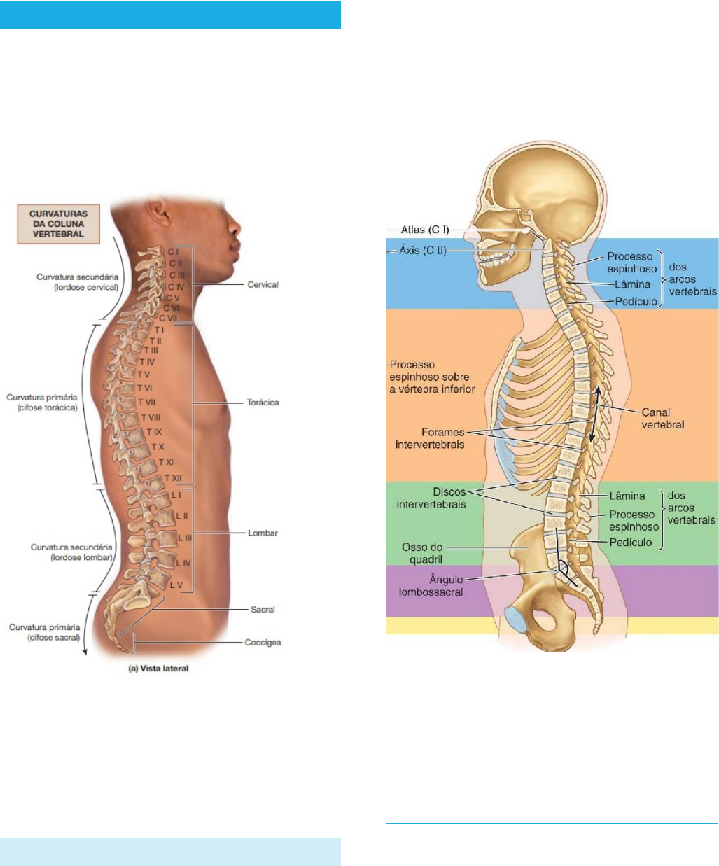 Alice Araújo. ANATOMIA COLUNA VERTEBRAL O conjunto das vértebras e dos discos intervertebrais forma a coluna vertebral > estende-se do crânio até o ápice do cóccix, e é sustentada por numerosos músculos ligados a fortes alavancas (processos transversos e espinhosos). · Protegem a medula espinal e seus nervos; · Auxiliam na manutenção da postura do corpo; · Sustentam o peso da cabeça, pescoço e tronco Vértebras No adulto há 33 vértebras organizadas em regiões: 7 cervicais, 12 torácicas, 5 lombares, 5 sacrais (fundidas > sacro) e 4 coccígeas (após 30 anos formam o sacro) > ângulo lombossacral. As vértebras tornam-se maiores gradualmente, à medida que a coluna vertebral desce até o sacro e, a partir daí, tornam-se progressivamente menores em direção ao ápice do cóccix. OBS: esse aumento de tamanho está relacionado ao fato de as vértebras sucessivas suportarem cada vez mais peso > cíngulo do MI A coluna vertebral é flexível porque é formada por ossos pequenos separados por discos intervertebrais resilientes. As vértebras também se articulam nas articulações dos processos articulares (zigapofisárias) que facilitam a movimentação da coluna vertebral. Vértebra geral O corpo vertebral é a parte anterior do osso, cilíndrica que confere resistência à coluna vertebral e sustenta o peso do corpo > aumenta á medida que desce a coluna. É formado por osso esponjoso/trabecular (trabéculas altas entrecruzadas com trabéculas curtas) vascularizado, revestido por uma camada fina de osso compacto > margem epifisal derivada da epífise anular. O espaço entre as trabéculas está revestido por medula óssea vermelha. As faces superior e inferior são cobertas por discos de cartilagem hialina O arco vertebral está localizado posteriormente ao corpo vertebral e consiste em dois pedículos (liga o corpo vertebral às lâminas) e lâminas (direito e esquerdo) que se unem e formam o processo espinhoso. A sucessão de forames vertebrais forma o canal vertebral que contém a medula espinal e as raízes dos nervos espinais, as meninges, gordura e vasos que os circundam. As incisuras vertebrais são entalhes observados em vistas laterais e, quando articuladas (inferior com superior) formam os forames intervertebrais. Através dos quais os nervos espinais emergem da coluna vertebral, e é o local da raiz dos gânglios sensitivos. · O processo espinhoso mediano projeta-se posteriormente e, em geral, inferiormente. · Os dois processos transversos projetam-se posterolateralmente a partir das junções dos pedículos com as lâminas. · Os quatro processos articulares (2 superiores e 2 inferiores) se originam das junções dos pedículos com as lâminas, cada um apresentando uma face articular. Os processos espinhosos e transversos são locais de fixação dos músculos profundos do dorso e servem como alavancas; os processos articulares estão conectados aos processos correspondentes de vértebras adjacentes (superiores e inferiores) > articulações dos processos articulares. Além de ajudar a manter as vértebras alinhadas, evitando o deslizamento anterior de uma vértebra sobre a outra. OBS: a sustentação de peso pelos processos articulares é apenas temporária, em posição fletida, exceto as inferiores da vértebra LV. Características regionais das vértebras A maioria das vértebras tem aspectos característicos que as identificam como pertencentes a uma das 5 regiões. Vértebras cervicais São as menores (sustentam menos peso) e estão localizadas entre o crânio e as vértebras torácicas e propiciam a maior amplitude e variedade de movimento de todas as regiões cervicais. A presença do forame transversário oval no processo transverso, pelo qual passam as artérias vertebrais e as veias acompanhantes, exceto na C VII, onde passam apenas pequenas veias acessórias, por isso são menores/ausentes. Os processos transversais das vértebras cervicais terminam lateralmente em duas projeções: um tubérculo anterior e um tubérculo posterior > dão fixação aos m. levantadores da escápula e escalenos. Entre os tubérculos há o sulco do nervo espinal por onde os ramos anteriores dos nervos espinais cervicais seguem. A vértebra CI/Atlas não possui corpo, nem processo espinhoso; possui um par de massas laterais que ocupam lugar de um corpo, de onde originam-se os processos transversos. É uma vértebra mais larga. As faces articulares superiores côncavas das massas laterais se articulam com duas grandes protuberâncias cranianas, os côndilos occipitais na lateral do forame magno. Os arcos anterior e posterior possuem um tubérculo no centro da sua face externa e formam o anel completo > O arco posterior tem um largo sulco da artéria vertebral em face superior (o nervo CI também segue nesse sulco). A vértebra CII/áxis é a mais forte das vértebras cervicais, possui duas faces planas de sustentação > faces articulares superiores sobre as quais a atlas gira. A característica que distingue a CII é o dente que se projeta do seu corpo para cima situado anteriormente à medula espinal, o qual é mantido na posição contra a face posterior do arco anterior do atlas pelo ligamento transverso do atlas. A CII tem o processo espinhoso bífido. As vértebras CIII a CVI são as vértebras cervicais típicas: · Grandes forames vertebrais para acomodar a intumescência cervical da medula espinal; · A margem súperolateral elevada é o unco do corpo da vértebra; · Processos espinhosos curtos e bífidos > palpados no sulco nucal. OBS: Os tubérculos anteriores da vértebra C VI são chamados de tubérculos caróticos porque as artérias carótidas comuns podem ser comprimidas nesse local. A vértebra CVII é uma vértebra proeminente caracterizada por um processo espinhoso longo > pode ser palpada inferiormente à protuberância occipital externa. Vértebras torácicas Estão localizadas na parte superior do dorso e nelas fixam-se as costelas > fóveas cost