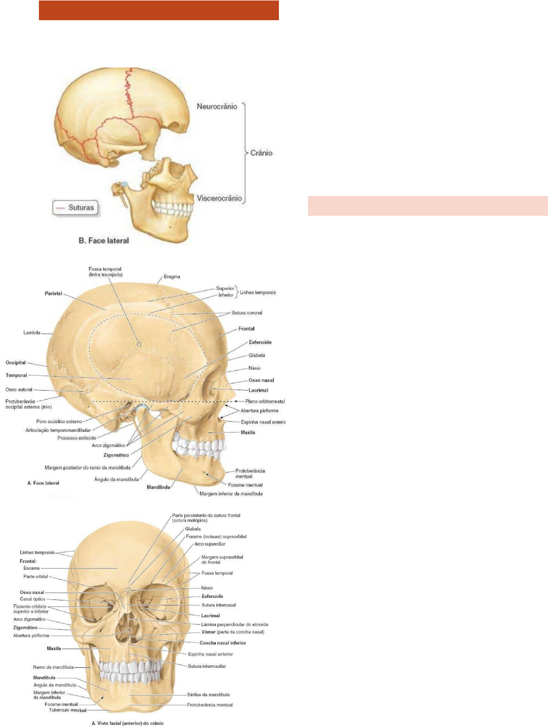 Alice Araújo. ANATOMIA Crânio É constituído por 22 ossos, que se subdividem em duas partes: neurocrânio e viscerocrânio. Vários ossos do crânio- frontal, temporal, esfenoide, etmoide e vômer- são ossos pneumáticos, contendo espaços aéreos (acredita-se que para reduzir seu peso). * O volume total dos espaços aéreos nesses ossos aumenta com a idade. *A margem inferior da órbita e a margem superior do meato acústico externo indicam o plano orbitomeatal horizontal. Neurocrânio Caixa óssea do encéfalo, das membranas que o revestem- as meninges cranianas- e dos nervos e vasos do encéfalo. Em adultos é formado por 8 ossos: · 4 ímpares: frontal, occipital, etmoide e esfenoide (localizados na linha mediana); · 2 pares: parietal e lateral (bilaterais). O plano superior do neurocrânio é abobadado – calvária – formada por ossos planos (frontal, os temporais e os parietais) que foram formados por ossificação intramembranosa do mesênquima da cabeça a partir da crista neural. Os ossos da calvária são unidos por suturas entrelaçadas e fibrosas. Os ossos do assoalho do crânio são irregulares com partes planas formadas por ossificação endocondral (esfenoide e etmoide). * A medula espinal mantém contato com o encéfalo através do forame magno. Viscerocrânio Compreende os ossos da face, formando a parte anterior do crânio e consiste nos ossos que circulam a boca (maxila e mandíbula), cavidade nasal, e a maior parte das órbitas. É formado por 15 ossos irregulares: · 3 ossos ímpares centralizados: mandíbula, etmoide e vômer; · 6 pares de ossos bilaterais: maxilas, canchas nasais inferiores, zigomáticos, palatinos, ossos nasais e lacrimais. A mandíbula é um componente do viscerocrânio – abriga os dentes- que se articula com o restante do crânio pela articulação temporomandibular; o processo coronoide é local de inserção de músculos fortes – mastigação. As maxilas também abrigam os dentes, além de representarem a maior parte do esqueleto facial superior. OSSOS O osso frontal possui uma parte plana – escama- que se articula na parte inferior com o osso nasal e o zigomático. *Em alguns adultos observa-se uma sutura frontal – sutura metópica, que parte da glabela (a sutura frontal divide ossos frontais do crânio fetal). A inserção do osso frontal e nasal é o násio – ponta do nariz. · Arco superciliar; · Margem supraorbital; · Incisura supraorbital Os zigomáticos formam proeminências das bochechas, situam-se nas paredes inferior e lateral das órbitas, apoiado sobre as maxilas. Um pequeno forame zogomaticofacial perfura a lateral de cada osso