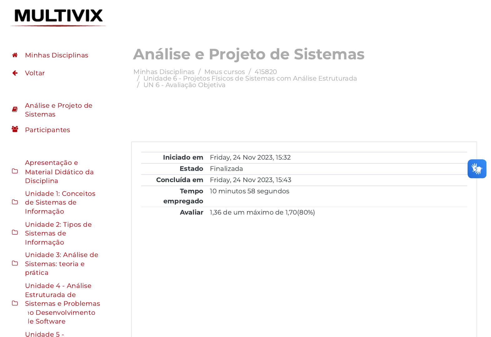 24/11/2023, 15:43 UN 6 - Avaliação Objetiva: Revisão da tentativa https://avap.multivix.edu.br/mod/quiz/review.php?attempt=4489756&cmid=1526658 1/7 Minhas Disciplinas / Meus cursos / 415820 / Unidade 6 - Projetos Físicos de Sistemas com Análise Estruturada / UN 6 - Avaliação Objetiva Análise e Projeto de Sistemas Iniciado em Friday, 24 Nov 2023, 15:32 Estado Finalizada Concluída em Friday, 24 Nov 2023, 15:43 Tempo empregado 10 minutos 58 segundos Avaliar 1,36 de um máximo de 1,70(80%) Minhas Disciplinas Voltar Análise e Projeto de Sistemas Participantes Apresentação e Material Didático da Disciplina Unidade 1: Conceitos de Sistemas de Informação Unidade 2: Tipos de Sistemas de Informação Unidade 3: Análise de Sistemas: teoria e prática Unidade 4 - Análise Estruturada de Sistemas e Problemas no Desenvolvimento de Software Unidade 5 - https://avap.multivix.edu.br/my/ https://avap.multivix.edu.br/course/view.php?id=23732 https://avap.multivix.edu.br/course/view.php?id=23732§ion=7 https://avap.multivix.edu.br/mod/quiz/view.php?id=1526658 https://avap.multivix.edu.br/my/ https://avap.multivix.edu.br/course/view.php?id=23732 https://avap.multivix.edu.br/user/index.php?id=23732 https://avap.multivix.edu.br/course/view.php?id=23732§ion=1 https://avap.multivix.edu.br/course/view.php?id=23732§ion=2 https://avap.multivix.edu.br/course/view.php?id=23732§ion=3 https://avap.multivix.edu.br/course/view.php?id=23732§ion=4 https://avap.multivix.edu.br/course/view.php?id=23732§ion=5 https://avap.multivix.edu.br/course/view.php?id=23732§ion=6 https://avap.multivix.edu.br/ https://avap.multivix.edu.br/ https://avap.multivix.edu.br/ https://avap.multivix.edu.br/ https://avap.multivix.edu.br/ https://avap.multivix.edu.br/ https://avap.multivix.edu.br/ https://avap.multivix.edu.br/ 24/11/2023, 15:43 UN 6 - Avaliação Objetiva: Revisão da tentativa https://avap.multivix.edu.br/mod/quiz/review.php?attempt=4489756&cmid=1526658 2/7 Questão 1 Correto Atingiu 0,34 de 0,34 O projeto físico de uma entrega de software apresenta características essenciais para garantir a integridade e a proteção dos dados. Sobre as possíveis tarefas de um plano de proteção de dados, analise as seguintes a�rmativas: No plano de proteção de dados, deve-se de�nir os arquivos físicos, sem explorar os métodos de acesso de software. No plano de proteção de dados, a de�nição dos procedimentos do plano de segurança da informação devem estar presentes. O plano de proteção de dados deve permitir a criação de per�s de acesso para as principais funcionalidades do sistema. É correto o que se a�rma em: Escolha uma opção: II, apenas. I e II, apenas. I, II e III. I, apenas. II e III, apenas. Minhas Disciplinas Voltar Análise e Projeto de Sistemas Participantes Apresentação e Material Didático da Disciplina Unidade 1: Conceitos de Sistemas de Informação Unidade 2: Tipos de Sistemas de Informação Unidade 3: Análise de Sistemas: teoria e prática Unidade 4 - Análise Estruturada de Sistemas e Problemas no Desenvolvimento de Software Unidade 5 - https://avap.multivix.edu.br/my/ https://avap.multivix.edu.br/course/view.php?id=23732 https://avap.multivix.edu.br/user/index.php?id=23732 https://avap.multivix.edu.br/course/view.php?id=23732§ion=1 https://avap.multivix.edu.br/course/view.php?id=23732§ion=2 https://avap.multivix.edu.br/course/view.php?id=23732§ion=3 https://avap.multivix.edu.br/course/view.php?id=23732§ion=4 https://avap.multivix.edu.br/course/view.php?id=23732§ion=5 https://avap.multivix.edu.br/course/view.php?id=23732§ion=6 https://avap.multivix.edu.br/ https://avap.multivix.edu.br/ https://avap.multivix.edu.br/ https://avap.multivix.edu.br/ https://avap.multivix.edu.br/ https://avap.multivix.edu.br/ https://avap.multivix.edu.br/ https://avap.multivix.edu.br/ 24/11/2023, 15:43 UN 6 - Avaliação Objetiva: Revisão da tentativa https://avap.multivix.edu.br/mod/quiz/review.php?attempt=4489756&cmid=1526658 3/7 Questão 2 Incorreto Atingiu 0,00 de 0,34 Os procedimentos de entrega do software dinamizam o trabalho �nal de uma equipe de desenvolvimento. O projeto físico do desenvolvimento de software se destaca nessa etapa que �naliza todo o processo. É correto a�rmar que o objetivo do projeto físico de software é: Escolha uma opção: apresentar o conjunto de telas e funcionalidades do sistema. avaliar a modelagem e validar o produto a ser elaborado. Selecionar principais diagramas elaborados na análise. Informar os recursos do banco de dados. determinar quais computadores farão parte do projeto dos sistemas a serem entregues. Minhas Disciplinas Voltar Análise e Projeto de Sistemas Participantes Apresentação e Material Didático da Disciplina Unidade 1: Conceitos de Sistemas de Informação Unidade 2: Tipos de Sistemas de Informação Unidade 3: Análise de Sistemas: teoria e prática Unidade 4 - Análise Estruturada de Sistemas e Problemas no Desenvolvimento de Software Unidade 5 - https://avap.multivix.edu.br/my/ https://avap.multivix.edu.br/course/view.php?id=23732 https://avap.multivix.edu.br/user/index.php?id=23732 https://avap.multivix.edu.br/course/view.php?id=23732§ion=1 https://avap.multivix.edu.br/course/view.php?id=23732§ion=2 https://avap.multivix.edu.br/course/view.php?id=23732§ion=3 https://avap.multivix.edu.br/course/view.php?id=23732§ion=4 https://avap.multivix.edu.br/course/view.php?id=23732§ion=5 https://avap.multivix.edu.br/course/view.php?id=23732§ion=6 https://avap.multivix.edu.br/ https://avap.multivix.edu.br/ https://avap.multivix.edu.br/ https://avap.multivix.edu.br/ https://avap.multivix.edu.br/ https://avap.multivix.edu.br/ https://avap.multivix.edu.br/ https://avap.multivix.edu.br/ 24/11/2023, 15:43 UN 6 - Avaliação Objetiva: Revisão da tentativa https://avap.multivix.edu.br/mod/quiz/review.php?attempt=4489756&cmid=1526658 4/7 Questão 3 Correto Atingiu 0,34 de 0,34 O projeto físico de sistemas de informação realiza d