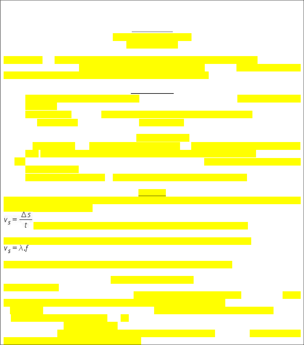 Série: 2° Anos Turma(s): H, N e O. Turno(s): Vespertino e Noturno. Bimestre: 2° Disciplina: Física. Professor: Genival Gonçalves da Costa Santos Considerações Unidade: 3 - Ondas sonoras. Página(s): 38 a 54. Ondas sonoras são vibrações que ao penetrarem no nosso ouvido produzem sensações auditivas. Somos capazes de perceber sons com frequência entre 20 Hz até 20000 Hz. Sons com frequência abaixo de 20 Hz são chamados de infrassom e acima de 20000 Hz chamados de ultrassom. Características · As ondas sonoras são ondas mecânicas, desta forma necessitam de um meio material para se propagarem. · São longitudinais, ou seja, a direção da propagação é a mesma da direção da vibração. · São tridimensionais, pois se propagam em todas as direções. Velocidade do som · O som se propaga nos meios sólidos, líquidos e gasosos. O valor da velocidade do som depende do meio material em que se propaga, sendo maior nos sólidos e menor nos meios gasosos. · A velocidade do som depende também da temperatura do meio. Quanto maior a temperatura, maior será sua velocidade. · No ar, à temperatura de 20 °C, a velocidade do som é de aproximadamente 340 m/s. Fórmulas Para calcular a velocidade do som, conhecendo a distância percorrida em um intervalo de tempo, usamos a fórmula do movimento uniforme: Onde: vs: Velocidade do som. ∆s: Distância percorrida e t: Intervalo de tempo. A velocidade do som pode ainda ser encontrada usando-se a equação fundamental das ondas: Onde: Vs: Velocidade do som ƛ: Comprimento de onda. f: Frequência da onda sonora. Intensidade, Altura e Timbre Intensidade Sonora Relacionada com a amplitude da onda sonora, a intensidade representa o volume do som. Assim sendo, quanto maior for a energia de vibração da fonte que emite a onda, mais intenso será o som. O nível sonoro é uma grandeza física relacionada com a sensação auditiva que a onda sonora provoca. A unidade de medida do nível sonoro é o bel (em homenagem a Graham Bell, inventor do telefone). Sendo mais comum o uso do submúltiplo, decibel. Pessoas expostas a elevado nível sonoro podem apresentar diversos sintomas, tais como: intolerância a sons intensos, tontura, otalgia, zumbido e perda auditiva. Altura A altura do som está relacionada com a sua frequência. O som pode ser grave (baixa frequência) ou agudo (alta frequência). A voz dos homens apresenta uma frequência menor que a voz das mulheres. Por isso, a voz masculina é classificada como grave e a feminina aguda. As notas musicais são caracterizadas pela frequência. Timbre É a característica do som que nos permite distinguir dois sons de mesma altura e intensidade, mas que foram produzidos por fontes diferentes. O som produzido por um instrumento musical é uma composição de várias ondas sonoras, o que dará o timbre característico do instrumento. Reflexão das ondas sonoras O som se propaga em todas as direções. Desta forma, o som que ouvimos é o resultado do som que foi emitido pela fonte sonora e também o que foi refletido pelas diferentes superfícies que nos cercam. (2º Ano: H, N e O – 05/06/2023) A diferença do tempo de chegada do som emitido e do refletido aos nossos ouvidos normalmente é muito pequena. Neste caso, ouvimos apenas um reforço do som. Nosso ouvido é capaz de distinguir dois sons como distintos quando o tempo entre eles é maior que 0,1 s. Assim, quando estamos a uma certa distância de um obstáculo, pode ocorrer o que chamamos de eco. Efeito Doppler É um efeito percebido por um observador quando existe um movimento relativo entre ele e a fonte emissora do som. Quando o observador se aproxima da fonte, o som recebido é mais agudo (maior frequência). Ao se afastar, o som parece mais grave (menor frequência). Um exemplo deste efeito é o som que ouvimos dos carros durante em uma corrida de fórmula 1. Imagem ilustrativa do efeito doppler em repouso (esquerda) e em movimento (direita). O efeito é percebido a partir do movimento. Conforme a fonte de som ou luz se aproxima, a frequência percebida aumenta e ao se afastar do observador, a frequência diminui. Fórmulas do Efeito Doppler É importante perceber que a frequência de propagação da onda não varia. A fórmula é referente à frequência de onda captada pelo observador. Fórmula clássica (som) A fórmula clássica do efeito doppler utilizada para em sua relação com o som é: A frequência percebida também aparece em alguns livros como frequência Doppler (reto f com reto fD subscrito). · Quando fonte e observador se aproximam: + no numerador e - no denominador. · Quando fonte e observador se afastam: - no numerador e + no denominador. Exemplo Efeito Doppler: Suponha uma fonte sonora fixa, que emite um som de frequência de 680 Hz. Um observador se afasta desta fonte com uma velocidade constante de 60 m/s. Determine a frequência percebida pelo observador. A situação pode ser esquematizada como a seguir: A seta vermelha indica a posição e sempre aponta do observador para a fonte. Como a velocidade e o vetor posição possuem sentidos contrários, utilizamos o sinal negativo na fórmula. No caso do som, mais fácil de ser observado, pode-se notar que o som tende a se tornar mais grave à medida que a fonte se afasta do observador. Considerações: · A velocidade da luz no ar é maior que a do som. · A velocidade do som aumenta do ar para a água, já a velocidade da luz diminui. · Os sons audíveis (para o ser humano) têm frequências menores que a da luz. Série: 2° Anos Turma(s): H, N e O. Turno(s): Vespertino e Noturno. Bimestre: 2° Disciplina: Física. Professor: Genival Gonçalves da Costa Santos Unidade: 3 - Ondas sonoras Página(s): 38 a 54. Sala: Página(s): 49 - Exercício(s): 1 e 4 1. (UEMG) Leia o excerto a seguir. Sobre os telhados da noite – no Irã ecoa a voz agônica dos que querem se expressar. Não é a ladainha dos muezins e suas preces monótonas (conformadas) é o canto verde ra