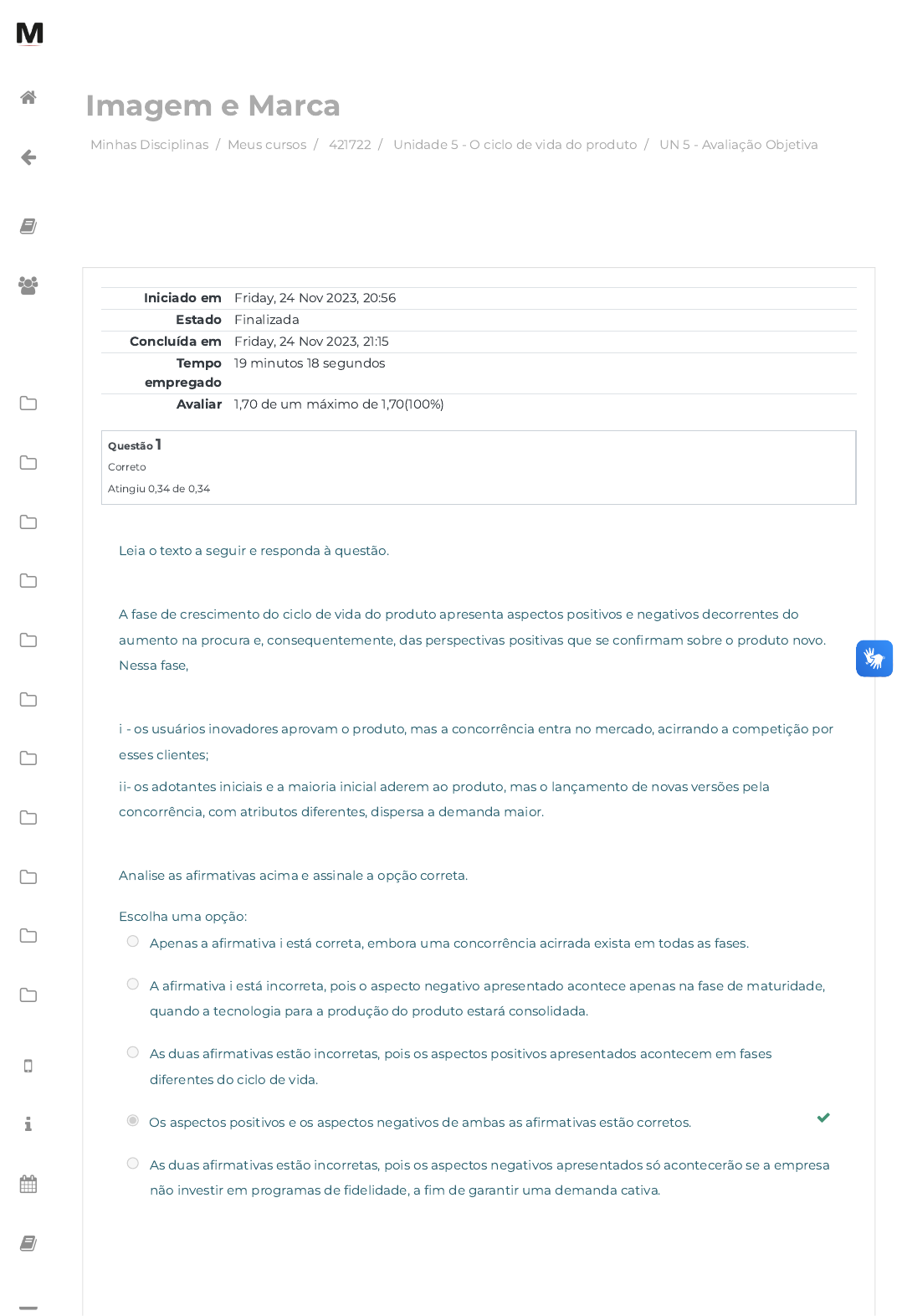 24/11/2023, 21:16 UN 5 - Avaliação Objetiva: Revisão da tentativa https://avap.multivix.edu.br/mod/quiz/review.php?attempt=4494584&cmid=1527833 1/4 Minhas Disciplinas / Meus cursos / 421722 / Unidade 5 - O ciclo de vida do produto / UN 5 - Avaliação Objetiva Imagem e Marca Iniciado em Friday, 24 Nov 2023, 20:56 Estado Finalizada Concluída em Friday, 24 Nov 2023, 21:15 Tempo empregado 19 minutos 18 segundos Avaliar 1,70 de um máximo de 1,70(100%) Questão 1 Correto Atingiu 0,34 de 0,34 Leia o texto a seguir e responda à questão. A fase de crescimento do ciclo de vida do produto apresenta aspectos positivos e negativos decorrentes do aumento na procura e, consequentemente, das perspectivas positivas que se con�rmam sobre o produto novo. Nessa fase, i - os usuários inovadores aprovam o produto, mas a concorrência entra no mercado, acirrando a competição por esses clientes; ii- os adotantes iniciais e a maioria inicial aderem ao produto, mas o lançamento de novas versões pela concorrência, com atributos diferentes, dispersa a demanda maior. Analise as a�rmativas acima e assinale a opção correta. Escolha uma opção: Apenas a a�rmativa i está correta, embora uma concorrência acirrada exista em todas as fases. A a�rmativa i está incorreta, pois o aspecto negativo apresentado acontece apenas na fase de maturidade, quando a tecnologia para a produção do produto estará consolidada. As duas a�rmativas estão incorretas, pois os aspectos positivos apresentados acontecem em fases diferentes do ciclo de vida. Os aspectos positivos e os aspectos negativos de ambas as a�rmativas estão corretos. As duas a�rmativas estão incorretas, pois os aspectos negativos apresentados só acontecerão se a empresa não investir em programas de �delidade, a �m de garantir uma demanda cativa. https://avap.multivix.edu.br/my/ https://avap.multivix.edu.br/course/view.php?id=23867 https://avap.multivix.edu.br/course/view.php?id=23867§ion=6 https://avap.multivix.edu.br/mod/quiz/view.php?id=1527833 https://avap.multivix.edu.br/my/ https://avap.multivix.edu.br/course/view.php?id=23867 https://avap.multivix.edu.br/user/index.php?id=23867 https://avap.multivix.edu.br/course/view.php?id=23867§ion=1 https://avap.multivix.edu.br/course/view.php?id=23867§ion=2 https://avap.multivix.edu.br/course/view.php?id=23867§ion=3 https://avap.multivix.edu.br/course/view.php?id=23867§ion=4 https://avap.multivix.edu.br/course/view.php?id=23867§ion=5 https://avap.multivix.edu.br/course/view.php?id=23867§ion=6 https://avap.multivix.edu.br/course/view.php?id=23867§ion=7 https://avap.multivix.edu.br/course/view.php?id=23867§ion=8 https://avap.multivix.edu.br/course/view.php?id=23867§ion=9 https://avap.multivix.edu.br/course/view.php?id=23867§ion=10 https://avap.multivix.edu.br/course/view.php?id=23867§ion=11 https://avap.multivix.edu.br/hooks/portal/ https://avap.multivix.edu.br/mod/page/view.php?id=1252%2F%22%20target%3D%22_blank https://avap.multivix.edu.br/calendar/view.php/ https://avap.multivix.edu.br/local/staticpage/view.php?page=biblioteca https://multivix.edu.br/office-365/ https://avap.multivix.edu.br/ https://avap.multivix.edu.br/ https://avap.multivix.edu.br/ https://avap.multivix.edu.br/ https://avap.multivix.edu.br/ 24/11/2023, 21:16 UN 5 - Avaliação Objetiva: Revisão da tentativa https://avap.multivix.edu.br/mod/quiz/review.php?attempt=4494584&cmid=1527833 2/4 Questão 2 Correto Atingiu 0,34 de 0,34 Questão 3 Correto Atingiu 0,34 de 0,34 Leia o texto a seguir e responda à questão. Obsolescência programada é uma prática que envolve a decisão de desenvolver produtos cuja usabilidade se extinga em um tempo de�nido, de modo a incentivar a compra de opções inovadoras a serem lançadas. Esse conceito impacta na atratividade do produto, pois Escolha uma opção: sua implementação está relacionada ao desenvolvimento de programas de computador que automatizam a produção. implica modi�car seu processo produtivo, a �m de melhorar seu desempenho por meio de novos atributos. tende a encurtar o seu ciclo de vida, permitindo à empresa programar novos lançamentos que satisfaçam uma demanda já criada pelo modelo anterior. acontece na fase de crescimento, provocando um aumento nas vendas do produto. está diretamente ligado ao fenômeno do estilo, conceito que de�ne os produtos lançados para atender a ondas curtas de interesse do consumidor. Leia o texto a seguir e responda à questão. No estágio da maturidade, i - costuma haver uma diminuição nas taxas de crescimento das vendas; ii - as vendas caem, e os clientes procuram outras opções para satisfazer suas necessidades; e iii - se deve estar consciente de que não é possível entrar em todos os mercados, sendo necessário escolher alguns. Após analisar as a�rmativas acima, aponte a alternativa correta. Escolha uma opção: Todas as a�rmativas estão corretas. As a�rmativas ii e iii se referem a outra fase do ciclo de vida do produto. As alternativas i e ii estão corretas. A alternativa i está correta, mas a a�rmativa ii está errada. A a�rmativa i se refere a outra fase do ciclo de vida, mas a a�rmativa iii está correta. https://avap.multivix.edu.br/my/ https://avap.multivix.edu.br/course/view.php?id=23867 https://avap.multivix.edu.br/user/index.php?id=23867 https://avap.multivix.edu.br/course/view.php?id=23867§ion=1 https://avap.multivix.edu.br/course/view.php?id=23867§ion=2 https://avap.multivix.edu.br/course/view.php?id=23867§ion=3 https://avap.multivix.edu.br/course/view.php?id=23867§ion=4 https://avap.multivix.edu.br/course/view.php?id=23867§ion=5 https://avap.multivix.edu.br/course/view.php?id=23867§ion=6 https://avap.multivix.edu.br/course/view.php?id=23867§ion=7 https://avap.multivix.edu.br/course/view.php?id=23867§ion=8 https://avap.multivix.edu.br/course/view.php?id=23867§ion=9 https://avap.multivix.edu.br/course/view.php?id=23867§ion=10 https://avap.multivix.edu.br/course