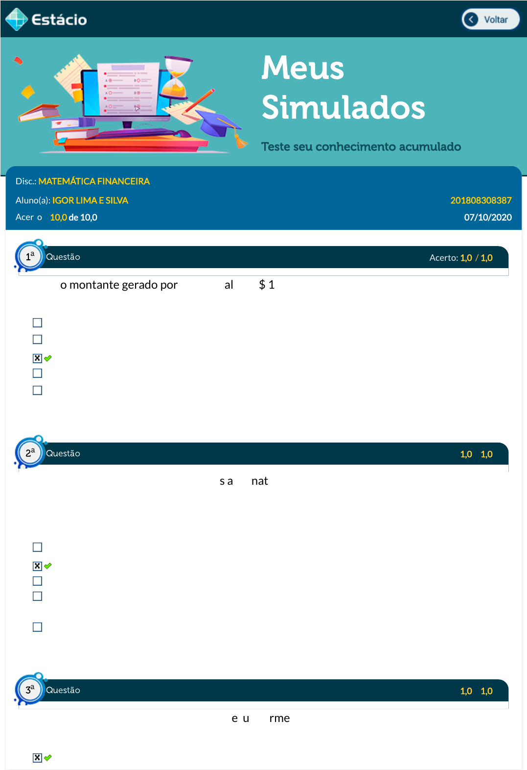 Meus Simulados Teste seu conhecimento acumulado Disc.: MATEMÁTICA FINANCEIRA Aluno(a): IGOR LIMA E SILVA 201808308387 Acertos: 10,0 de 10,0 07/10/2020 Acerto: 1,0 / 1,0 Qual o montante gerado por um capital de R$ 1.000,00 aplicado a uma taxa de 1% a.m. por um ano? R$ 1.115,78 R$ 1.212,56 R$ 1.126,82 R$ 1.210,00 R$ 1.010,00 Respondido em 07/10/2020 12:34:25 Acerto: 1,0 / 1,0 Um banco ofereceu a seu cliente duas alternativas para descontar uma duplicata com valor de face de R$ 1.000,00, três meses antes de seu vencimento: utilizando desconto comercial simples a uma taxa de 5% a.m. ou utilizando desconto racional composto a uma taxa de 4% a.m. Qual a alternativa mais vantajosa para o cliente? Não é possível comparar as duas alternativas, pois as taxas são diferentes. O desconto racional composto de 4% a.m. O desconto comercial simples de 5% a.m Não é possível comparar as duas alternativas, pois estão em regimes de capitalização diferentes. As duas alternativas são equivalentes. Respondido em 07/10/2020 12:39:14 Acerto: 1,0 / 1,0 Qual é o valor presente de uma série uniforme �nita, imediata e antecipada, com 20 pagamentos mensais de 200 reais a uma taxa de juros de 3% a.m.? 3.064,76 Questão1 a Questão2 a Questão3 a https://simulado.estacio.br/alunos/inicio.asp javascript:voltar(); 3.125,48 4.000,00 3.052,20 3.800,00 Respondido em 07/10/2020 12:49:56 Acerto: 1,0 / 1,0 Calcule o valor da primeira prestação mensal de um �nanciamento de 10.000 estruturado no sistema SAC, com prazo de 10 meses, e taxa de juros de 2% a.m. 1.200,00 1.115,78 1.210,00 1.100,00 1.212,56 Respondido em 07/10/2020 12:48:33 Acerto: 1,0 / 1,0 Calcule o valor da TIR do projeto com o �uxo ilustrado na �gura abaixo 3,48% a.a. 2,56% a.a. 4,22% a.a. 3% a.a. 5,78% a.a. Respondido em 07/10/2020 12:47:03 Acerto: 1,0 / 1,0 Qual das alternativas é falsa? Se a TIR > TMA, o projeto deve ser aceito. Se o VPL < 0, o projeto deve ser rejeitado. Se a TMA >TIRM, o projeto deve ser rejeitado. Se o TRC > 0, o projeto deve ser aceito. Questão4 a Questão5 a Questão6 a Se o payback >TMR, o projeto deve ser aceito. Respondido em 07/10/2020 12:47:52 Acerto: 1,0 / 1,0 Após identi�car que dois projetos mutuamente exclusivos eram ambos viáveis, o CFO de uma empresa veri�cou que os projetos tinham o mesmo prazo, mas valores de investimento inicial bastante distintos. Qual método você recomendaria que o CFO utilizasse para escolher o melhor projeto? TIR TIR incremental TIR modi�cada VPLa VPL Respondido em 07/10/2020 12:48:47 Acerto: 1,0 / 1,0 Qual dos critérios abaixo não levaria à escolha do projeto A em detrimento do projeto B.? TIR(B-A)< TMA TIRMA> TIRMB VPLa(A) >VPLa(B) TIRA< TIRB VPLA> VPLB Respondido em 07/10/2020 12:54:25 Acerto: 1,0 / 1,0 Quando a taxa de juros real se torna negativa? Nunca. Quando a in�ação é igual à taxa aparente. Quando o Copom reduz a taxa básica de juros. Quando a in�ação é menor do que a taxa aparente. Quando a in�ação é maior do que a taxa aparente. Respondido em 07/10/2020 12:52:21 Acerto: 1,0 / 1,0 Determine o valor presente líquido de um projeto cujo �uxo inicial é de -40.000 reais e que paga 100 reais por mês inde�nidamente, considerando-se uma taxa mínima de atratividade igual a 0,2% a.m. -45.000 10.000 Questão7 a Questão8 a Questão9 a Questão10 a 2.000 0 -20 Respondido em 07/10/2020 12:52:06