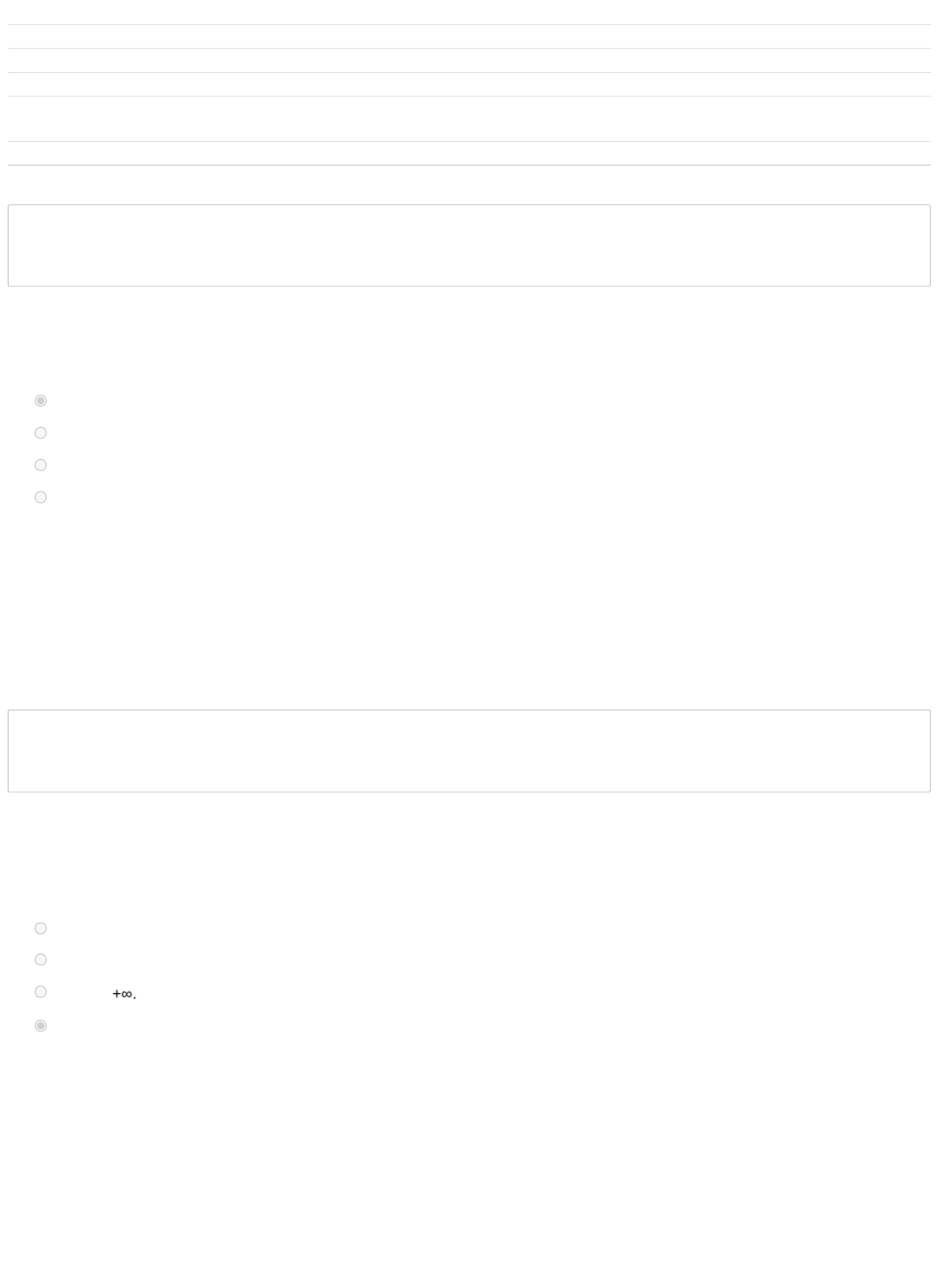 Iniciado em segunda-feira, 20 nov. 2023, 20:14 Estado Finalizada Concluída em segunda-feira, 20 nov. 2023, 20:38 Tempo empregado 23 minutos 53 segundos Notas 7,00/20,00 Avaliar 3,50 de um máximo de 10,00(35%) Questão 1 Incorreto Atingiu 0,00 de 1,00 Questão 2 Correto Atingiu 1,00 de 1,00 Determine a equação da reta tangente à curva y = 2x² + 3 que é paralela à reta 8x - y + 3 = 0. Escolha uma opção: A. 4x - y + 3 = 0 B. 8x - y - 5 = 0 C. - y + 8 = 0 D. 2x² - 7y = 0 Sua resposta está incorreta. Questão 20 - Cálculo I A resposta correta é: 8x - y - 5 = 0 Considere a equação abaixo e determine o conjunto-solução da desigualdade: |x + 4| < 7 Escolha uma opção: A. (3 , 11). B. (11, -3). C. (11, ). D. (-11 , 3). Sua resposta está correta. Questão 9 - CÁLCULO I A resposta correta é: (-11 , 3). Questão 3 Incorreto Atingiu 0,00 de 1,00 Questão 4 Correto Atingiu 1,00 de 1,00 Dada a função abaixo, calcule a sua antiderivada: Escolha uma opção: A. B. C. D. Sua resposta está incorreta. Questão 8 - CALCULO 1 A resposta correta é: A derivada de uma função exponencial é dada por f(x) = ax . ln a, para todo x real (com a > 0 e a 1). Sendo assim, calcule a derivada da seguinte função: f(x) = ex² - 2x + 1 Escolha uma opção: A. f'(x) = (2x - 2) ex²-2x+1 B. f'(x) = 2x . 3x²-4 . ln3 C. f'(x) = ln (x² - 2x + 1) D. f'(x) = ex + 3x . ln 3 Sua resposta está correta. Questão 5 - Cálculo I A resposta correta é: f'(x) = (2x - 2) ex²-2x+1 Questão 5 Incorreto Atingiu 0,00 de 1,00 Questão 6 Incorreto Atingiu 0,00 de 1,00 Observando a equação abaixo, determine todos os valores de x para os quais o número é um valor real: Escolha uma opção: A. B. [ 5/8 , ]. C. [-8/5, 5/8). D. (5/8, -5/8). Sua resposta está incorreta. Questão 8 - CÁLCULO I A resposta correta é: [ 5/8 , ]. Numa cidade calcula-se que o número de habitantes daqui a t anos será N = 50 - milhares de pessoas. Calcule a estimativa do quantitativo populacional daqui a 8 anos: Escolha uma opção: A. 49,6 mil habitantes. B. 48,8 mil habitantes. C. 49,5 mil habitantes. D. 52,4 mil habitantes. Sua resposta está incorreta. Questão 14 - Cálculo I A resposta correta é: 49,6 mil habitantes. Questão 7 Correto Atingiu 1,00 de 1,00 Questão 8 Incorreto Atingiu 0,00 de 1,00 Seja f uma função do tipo f(x) = ax + b. Se f (-2) = -4 e 3f (3) = 18, os valores de a e b, são respectivamente: Escolha uma opção: A. 6, -4 B. 1/2, 2 C. 2, 0 D. -2, ½ Sua resposta está correta. Questão 11 - CÁLCULO I A resposta correta é: 2, 0 Um objeto foi lançado de uma altura de 2.000 m e a função f(t) = 2000 - 10t² indica a altura do objeto em relação ao solo t segundos após ele ser abandonado. Determine quantos metros o objeto percorreu após 5 s e a velocidade deste objeto no dado instante: Escolha uma opção: A. 1750; 150 m/s B. 250 m; 150 m/s C. 50 m; -50 m/s D. 750 m; 50 m/s Sua resposta está incorreta. Questão 2 - Cálculo I A resposta correta é: 250 m; 150 m/s Questão 9 Incorreto Atingiu 0,00 de 1,00 Questão 10 Correto Atingiu 1,00 de 1,00 Se y = f(x) = cos x, determine a derivada de x = f-¹(y) = arccos y, para 0 = x = p. Escolha uma opção: A. Df-1 (y) = B. Df-1 (y) = C. Df-1 (y) = - D. Df-1 (y) = Sua resposta está incorreta. Questão 8 - Cálculo I A resposta correta é: Df-1 (y) = - A função custo de uma determinada empresa é dada por C'(x) = 3x² + 8x + 4 e o custo geral é de R$ 6,00. Determine a função custo total: Escolha uma opção: A. C (x) = 3x² + 8 B. C (x) = 4 x² + 8x C. C (x) = x³ + 4x² + 4x + 6 D. C (x) = 8x² + 4x + 2 Sua resposta está correta. Questão 4 - CALCULO 1 A resposta correta é: C (x) = x³ + 4x² + 4x + 6 Questão 11 Incorreto Atingiu 0,00 de 1,00 Dada a função a seguir, calcule a sua integral: f (x3/2 - x) dx Escolha uma opção: A. B. C. D. Sua resposta está incorreta. Questão 7 - CALCULO 1 A resposta correta é: Questão 12 Correto Atingiu 1,00 de 1,00 Os itens abaixo se referem aos conjuntos numéricos. A partir dessa ideia, analise cada uma das proposições a seguir: I___ {-0,0035, -0,0012, 0, 0,1} pertence ao conjunto dos números irracionais. II___ 3,14159... pode ser classificado como elemento do conjunto de números irracionais. III___ { -5, -3, -1, 0} pertence ao conjunto dos números inteiros. IV___ { -2; -1/5; 0,3; 1} pertence ao conjunto dos números reais. Acerca dos itens abaixo, assinale o item que contém as afirmativas CORRETAS: Escolha uma opção: A. I, II e III B. II, III e IV C. I, III e IV D. I, II, III e IV Sua resposta está correta. Questão 3 - CÁLCULO I A resposta correta é: II, III e IV Questão 13 Incorreto Atingiu 0,00 de 1,00 Questão 14 Incorreto Atingiu 0,00 de 1,00 Observando a função abaixo, determine a sua derivada: Escolha uma opção: A. f'(x) = cossec² x B. f'(x) = C. f'(x) = sen²x . cos²x D. f'(x) = Sua resposta está incorreta. Questão 11 - Cálculo I A resposta correta é: f'(x) = Uma caixa d'água tem base quadrada e não possui tampa. Seu volume é de 10 m³ e o custo do material utilizado para sua construção foi de R$ 100,00 por m². Calcule as dimensões do reservatório que minimizam o custo do material utilizado na construção: Escolha uma opção: A. 2,54 m x 1,45 m. B. 2,71 m x 1,36 m. C. 1,48 m x 2,86 m. D. 3,23 m x 1,04 m. Sua resposta está incorreta. Questão 16 - Cálculo I A resposta correta é: 2,71 m x 1,36 m. Questão 15 Correto Atingiu 1,00 de 1,00 Questão 16 Correto Atingiu 1,00 de 1,00 Resolva a derivada da seguinte função: f(x) = sen (x² - 3x) Escolha uma opção: A. f'(x) = (2x - 3). cos(x² - 3x) B. f'(x) = -cos (x² - 3x) C. f'(x) = sen (2x - 3) D. f'(x) = cos (2x - 3) Sua resposta está correta. Questão 6 - Cálculo I A resposta correta é: f'(x) = (2x - 3). cos(x² - 3x) Uma bola cai do topo do Arco de Nossa Senhora de Fátima (Sobral-Ce) que tem uma altura de 165 m de altura. Quanto tempo irá decorrer até ele atingir o solo e qual a velocidade escalar com que ele chega