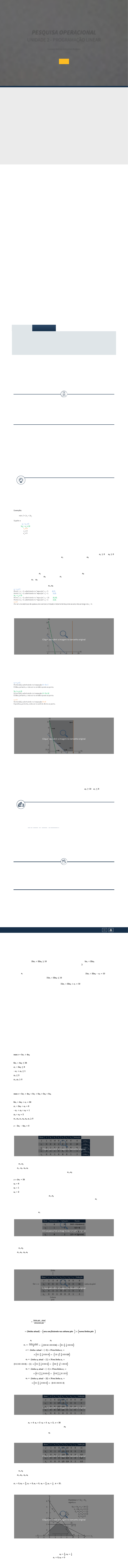 PESQUISA OPERACIONAL UNIDADE 2 - PROGRAMAÇÃO LINEAR Luciano Wallace Gonçalves Barbosa INICIAR Introdução Os ambientes coorporativos vêm sendo cada vez mais pressionados devido ao aumento da competitividade. Com o avanço de mudanças e recursos tecnológicos, a tomada de decisão tem sido um tema que exige cada vez mais atenção e cuidado dos gestores – afinal, a cada dia que passa, surgem mais e mais possibilidades de condução de um negócio, com suas peculiaridades distintas, demandando então a seleção da decisão que retorne o maior lucro possível dentro daquelas que foram selecionadas como candidatas, ou paralelamente, ao menor custo. A Pesquisa Operacional vem ganhando espaço dentro do contexto de tomada de decisão desde a Segunda Guerra Mundial (1939-1945), quando surgiu. Desde então, técnicas vêm sendo desenvolvidas e aprimoradas no sentido de tornar essa ciência cada vez mais viável e promissora. Afinal, quais as técnicas matemáticas que mais auxiliam decisões nos ambientes empresariais? A Programação Linear é uma das mais clássicas técnicas da Pesquisa Operacional. Veremos, nesta unidade, que sua principal função é reduzir o sistema real a um conjunto de equações e/ou inequações de primeiro grau, resolvendo a modelagem por métodos algébricos. Mas como seria feita essa solução, uma vez que um sistema pode ter inúmeras variáveis e restrições? A Programação Linear possui um poderoso algoritmo, denominado simplex, que é capaz de resolver problemas com várias variáveis. Durante esta unidade, veremos seu funcionamento. Como você se sentiria ao saber que existe uma técnica relativamente simples, que pode auxiliar em problemas complexos, chegando à melhor solução possível dentro de todas as candidatas? Pois bem, siga atento a este estudo, pois a Programação Linear, ou PL, tem muito a te surpreender. 1.1 Definição Muitos problemas das realidades das organizações podem ser construídos com a Programação Linear, que é uma das técnicas mais utilizadas para a otimização. O motivo está relacionado à simplicidade dos modelos que são gerados por esse método e pelas várias técnicas, incluindo computacionais, que conseguem encontrar a solução do problema. Um problema é considerado um Problema de Programação Linear (PPL) se, e somente se, for modelado e escrito como um sistema real com função objetivo e restrições, formando um conjunto de equações e/ou inequações lineares, ou seja, as variáveis de decisão sendo polinômios de primeiro grau (WINSTON, 2004). Mas o que são função objetivo, variáveis de decisão e restrições? Bom, o começo da modelagem em PL parte desses três pilares. As variáveis de decisão são o início do problema e são responsáveis por descrever as decisões a serem tomadas. Assim, caso seu problema seja a maximização de custos dentro de um mix de produção, as variáveis de decisão serão responsáveis por retornar à quantidade de cada produto do portfólio a ser produzido. Portanto, se sua carteira de produtos contar com 30 itens, por exemplo, seu modelo terá 30 variáveis de decisão, uma correspondente a cada item, que ao final trará a quantidade exata de cada um que deve ser produzida. Em seguida, deve-se traçar a função objetivo, que está relacionada à meta buscada, sendo possível modelos de minimização, geralmente relacionados a diminuição de custos, e maximização, que são voltados ao aumento dos lucros. Assim, a função objetivo deve ser composta das variáveis de decisão que são acompanhadas pelos respectivos valores correspondentes no tipo da modelagem. Por exemplo, se o problema é de maximização de lucros, a função objetivo será composta pela soma dos 30 itens de seu portfólio, multiplicando cada variável de decisão pelo lucro correspondente de cada item. Assim, ao final do modelo, como as variáveis de decisão correspondem às quantidades de produção de cada item, foram multiplicadas pelo lucro unitário de venda de cada unidade, a função objetivo retorna ao valor que a empresa obterá, caso siga o plano de produção ótimo indicado pela modelagem. Por ser um modelo de maximização, não existe nenhum outro plano que retornará um valor maior do que o estabelecido, cumprindo todas as restrições do sistema. Falando de restrições, estas são as próximas a serem definidas, e isso deve ser feito com muita atenção: elas são responsáveis por trazer para o modelo matemático a realidade total do sistema. Caso alguma limitação do processo não seja traduzida para restrição, o modelo passa a não representar a realidade, comprometendo sua solução. Assim como a função objetivo, as restrições acompanham as variáveis de decisão, porém em forma de equações e inequações, sempre de primeiro grau, para caracterização da linearidade do problema. Dessa forma, a primeira parte da restrição deve apresentar o quanto cada variável de decisão consome de um determinado recurso, e a segunda parte (após os sinais de ≤, = ou ≥), representa a disponibilidade total desse recurso. Portanto, no exemplo seguido, caso cada item do portfólio necessite ser processado por um determinado tempo em uma máquina e a disponibilidade dessa máquina seja de 1000 horas, a restrição dessa tecnologia é definida como a soma da multiplicação da quantidade de tempo que cada item necessita de transformação nessa máquina pela variável de decisão correspondente a esse item, até que sejam somados todos os produtos da carteira. A segunda parte da restrição é composta por “≤ 1000”, o que indica que a soma do tempo dispendido para a fabricação de todos os produtos pela máquina deve ser menor que ou igual à disponibilidade dela. Todas essas restrições são as chamadas restrições tecnológicas. Ainda, os PPLs devem apresentar as restrições de não negatividade, em que todas as variáveis de decisão devem assumir valor i
