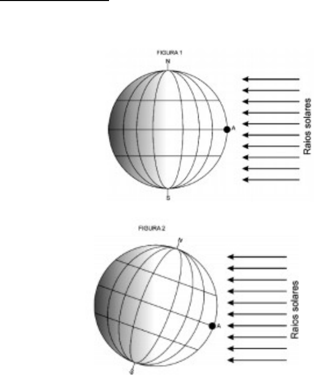ATIVIDADE Geografia Questão 01 Sobre o movimento de rotação, pode-se afirmar que: I. consiste na volta que a terra dá em torno do seu próprio eixo (de si mesma) e é realizado de oeste para leste; II. tem duração de aproximadamente 24 horas e é responsável pela incidência da luz solar por todo o Equador; III. é responsável pela alternância entre os dias e as noites. Assinale a alternativa correta. a) Somente as afirmativas I e III são verdadeiras. b) Somente as afirmativas II e III são verdadeiras. c) Somente as afirmativas I e II são verdadeiras. d) Somente a afirmativa II é verdadeira. e) Todas as afirmativas são verdadeiras. Questão 02 Vários estudantes viajaram para o Hemisfério Norte, mais especificamente para a Europa Ocidental. Passaram alguns meses, em grupo, estudando numa determinada universidade europeia, e constataram que naquela parte do planeta a duração dos dias e das noites era muito diferente da que se observava em Alagoas. O que justifica essa diferença? a) O Hemisfério Norte recebe sempre mais insolação que o Hemisfério Sul. b) O Hemisfério Sul, onde se situa o Estado de Alagoas, possui mais águas do que continentes. c) A Europa tem relevo mais elevado do que as terras do Hemisfério Sul. d) O movimento de translação da Terra e a inclinação do eixo terrestre justificam a desigualdade de duração dos dias e das noites. e) A desigualdade de duração dos dias e das noites é mais pronunciada durante os equinócios; o grupo de estudantes chegou àquele continente numa época equinocial. Questão 03 Observe as figuras a seguir. Os ângulos de incidência dos raios solares sobre a superfície da Terra, demonstrados nas figuras, apresentam duas situações distintas, que caracterizam os solstícios e os equinócios. Em ambas as figuras, o ponto A representa uma cidade sobre a linha do equador, ao meio-dia. A Figura 2 mostra a incidência do sol três meses após a situação ilustrada na Figura 1. A Figura 1 representa o a) equinócio de primavera no hemisfério sul, quando a incidência dos raios solares é oblíqua à superfície da Terra em A. b) equinócio de primavera no hemisfério sul, quando a incidência dos raios solares é perpendicular à superfície da Terra em A. c) equinócio de outono no hemisfério sul, quando a incidência dos raios solares é perpendicular à superfície da Terra em A. d) solstício de verão no hemisfério norte, quando a incidência dos raios solares é oblíqua à superfície da Terra em A. e) solstício de inverno no hemisfério sul, quando a incidência dos raios solares é oblíqua à superfície da Terra em A. Questão 04 À medida que a Terra vai realizando o movimento de translação, ela ocupa diferentes posições, o que faz com que a incidência dos raios solares não seja a mesma na superfície do planeta, no decorrer do ano. Observando a representação do movimento de translação e as estações do ano, na figura ao lado, identifique e relacione os desenhos I e II, respectivamente, às estações do ano, no Hemisfério Sul. a) inverno, primavera b) verão, outono c) outono, primavera d) inverno, outono e) verão, inverno Questão 05 Um transatlântico, navegando pelo Oceano Índico, cruza o Trópico de Capricórnio e segue do Sul para o Norte. Observando a trajetória percorrida, verifica-se que ela é representada por uma reta. O percurso desse transatlântico revela que ele I. estará se aproximando do meridiano de Greenwich. II. estará modificando sua latitude, mas permanecendo sempre na mesma longitude. III. estará se afastando do Círculo Polar Antártico. IV. estará navegando nas águas do hemisfério ocidental. Das afirmativas acima, pode-se dizer que a) apenas I e II estão corretas. b) apenas III está correta. c) apenas II e III estão corretas. d) apenas IV está correta. e) I, II e III estão corretas. Questão 06 Na figura abaixo, observa-se a ilustração de um avião na rota São Paulo (SP) – Maringá (PR) voando, em linha reta sobre o Trópico de Capricórnio. Considerando que o avião está no meio do trajeto às 12h (horário de Brasília) e que a viagem está sendo efetuada em um dia ensolarado, sem nuvens, em pleno solstício de verão no hemisfério norte, é correto afirmar que os raios solares incidirão com ângulo a) oblíquo no lado esquerdo do avião. b) oblíquo no lado direito do avião. c) reto na parte de cima do avião. d) oblíquo na parte dianteira do avião. e) oblíquo na parte traseira do avião. Questão 07 Em Porto Alegre, em nenhum dia do ano é possível ver o Sol no zênite, porque a) a cidade está situada ao sul do Trópico de Capricórnio. b) a cidade está situada na faixa tropical. c) o adensamento urbano dificulta a visualização do Sol ao meio-dia. d) a cidade localiza-se na área mais abaulada do globo terrestre. e) a cidade não possui o seu sítio junto ao Oceano Atlântico. Questão 08 Quando observamos o céu, temos a impressão de que nosso planeta está parado e que os outros astros é que se movem. Entretanto, a Terra realiza diversos movimentos, que afetam nossas vidas. O movimento de translação e a inclinação do eixo terrestre, por exemplo, determinam a desigualdade na distribuição de luminosidade e calor na Terra, conforme os períodos do ano. Assinale a alternativa, no quadro abaixo, que apresenta corretamente os dados do movimento de translação com relação às estações do ano. Questão 09 Observe a figura abaixo. Ela representa a Terra em uma determinada posição em relação ao Sol. No momento em que a Terra se encontra na posição apresentada, verifica-se que, na cidade brasileira identificada na figura pelo ponto A, é a) manhã de um dia de verão. b) anoitecer de um dia de inverno. c) manhã de um dia de inverno. d) entardecer de um dia de primavera. Questão 10 A Astronomia dedica-se ao estudo do cosmo e à análise da composição e do comportamento dos corpos celestes. É a ciência mais antiga e, em 