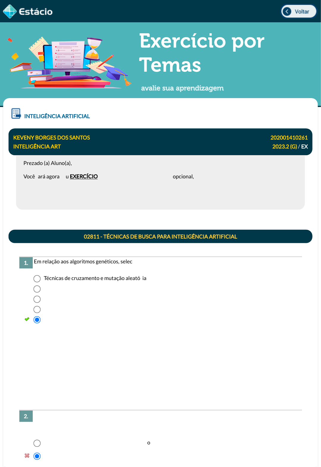 Exercício por Temas avalie sua aprendizagem Em relação aos algoritmos genéticos, selecione a opção correta com as duas principais características deles. Os métodos de busca em espaço de estados fazem parte da Inteligência Arti�cial. Eles podem ser aplicados em áreas como robótica e jogos digitais, por exemplo. Nesse sentido, selecione a opção correta a respeito dos métodos de busca no espaço de estados. INTELIGÊNCIA ARTIFICIAL KEVENY BORGES DOS SANTOS 202001410261 INTELIGÊNCIA ART 2023.2 (G) / EX Prezado (a) Aluno(a), Você fará agora seu EXERCÍCIO! Lembre-se que este exercício é opcional, mas não valerá ponto para sua avaliação. O mesmo será composto de questões de múltipla escolha. Após responde cada questão, você terá acesso ao gabarito comentado e/ou à explicação da mesma. Aproveite para se familiarizar com este modelo de questões que será usado na sua AV e AVS. 02811 - TÉCNICAS DE BUSCA PARA INTELIGÊNCIA ARTIFICIAL 1. Técnicas de cruzamento e mutação aleatória. Mutação aleatória e função de condicionamento físico. Busca direcionada e limitação de profundidade. Indivíduos entre a população e mutação aleatória. Função de �tness e técnicas de cruzamento. Data Resp.: 25/11/2023 18:51:47 Explicação: Os algoritmos genéticos simulam o comportamento da biologia genética, por meio da representação das soluções por vetores, que são chamados de cromossomos, sendo que as posições dentro do vetor são chamadas de genes, um método de cruzamento e uma função de condicionamento chamada de �tness, que é usada para medir a qualidade de uma solução. 2. São métodos exatos e não dependem de como são implementados. A função de utilidade é uma forma de veri�car se o método é útil para resolver problemas para os quais ele foi projetado. javascript:voltar(); javascript:voltar(); javascript:voltar(); javascript:voltar(); Selecione a opção que apresenta a busca que implementa a operação de pilha para buscar os estados. Qual método de pesquisa irá expandir o nó que está mais próximo do objetivo? Existem diversos algoritmos de busca cega. Nesse sentido, selecione a opção correta em que todos os métodos são do tipo busca cega. Devido ao não determinismo, não é possível medir seu desempenho. Esses métodos podem não ser exatos. Além disso, eles são sensíveis ao modo como é feita o mapeamento entre condições, ações e estados. O seu desempenho é medido de forma exata, analisando apenas a estrutura do método. Data Resp.: 25/11/2023 18:53:11 Explicação: Existem métodos exatos para resolver problemas de espaços de estados, no entanto, normalmente, esses algoritmos são lentos para produzir respostas. Ora, o tempo de resposta é fundamental em muitas aplicações, outra coisa a qualidade da resposta, em muitos casos precisa satisfazer algumas condições e não precisa ser, necessariamente, ótima. É por isso que métodos não exatos são utilizados na prática, apesar de serem sensíveis ao mapeamento entre condições, ações e estados. 3. Busca em largura. Busca com profundidade limitada. Busca em largura limitada. Busca pelo melhor primeiro. Busca em profundidade. Data Resp.: 25/11/2023 18:53:53 Explicação: Uma das características do algoritmo de busca em profundidade é o retorno para um estado anterior a �m de explorar outras soluções. Esse processo é conhecido como backtracking, ou seja, a trilha do caminho de retorno. Para implementar esse processo, que, normalmente, é feito por meio de recursividade, o algoritmo utiliza de uma estrutura de dados de pilha. 4. Busca bidirecional. Busca gananciosa pelo melhor primeiro (Greedy best-�rst search). Busca em Profundidade. Busca A*. Busca pelo melhor primeiro (Best First Search). Data Resp.: 25/11/2023 18:54:30 Explicação: O algoritmo de busca gulosa primeiro é caracterizado por fazer escolhas que tenham o potencial de conduzir mais rapidamente à solução alvo. Por se tratar de uma heurística, o método não garante a escolha da solução ótima, mas, como os demais métodos heurísticos, funcionam bem na prática para determinados tipos de problema, como, por exemplo, para traçar rotas. 5. Busca em profundidade primeiro, busca greedy e pesquisa bidirecional. Um dos problemas de otimização mais conhecidos é o do caixeiro viajante. Nesse problema, o caixeiro deve visitar de modo e�ciente um conjunto de cidades e voltar para o ponto inicial. Nesse sentido, selecione a opção correta sobre as estratégias de busca. As estratégias aplicadas aos métodos de busca em espaço de estados devem ser feitas conforme características do problema. Por exemplo, suponha o seguinte caso: ''Um robô pode se locomover por meio de nós que são conectados entre si, de modo que ele possa visitar alguns lugares. Ele começa em um nó e depois vai visitar todos os nós conectados a esse nó e assim por diante''. Nesse sentido, selecione a opção correta a respeito dos métodos de busca no espaço de estados e de suas estratégias para o exemplo apresentado. Busca A*, busca greedy e busca em grafo. Busca em largura primeiro, busca em profundidade primeiro e pesquisa bidirecional. Busca em grafo, busca em largura primeiro e pesquisa bidirecional. Busca em largura, custo uniforme e busca A*. Data Resp.: 25/11/2023 18:55:29 Explicação: Os algoritmos de busca cega - também chamados de busca (ou de pesquisa) não informada - não contêm informações sobre seu domínio. A única coisa que esses algoritmos podem fazer é distinguir entre um estado não objetivo de um estado objetivo (estado alvo). É o caso dos algoritmos de busca em largura primeiro, busca em profundidade primeiro e de pesquisa bidirecional. 6. Esse problema não pode ser resolvido por uma busca local. Esse problema é bastante complexo do ponto de vista computacional e, sob determinadas condições, pode ser resolvido por um algoritmo de busca local. O problema do caixeir