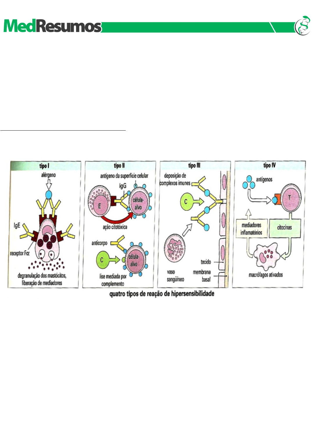 www.medresumos.com.br Arlindo Ugulino Netto ● MEDRESUMOS 2016 ● IMUNOLOGIA HIPERSENSIBILIDADES A resposta fisiológica do sistema imune e suas células contra um eventual antígeno deve ser uma resposta imune adequada e regulada, sendo ela benéfica e, em escalas basais, tem o intuito de promover a saúde do indivíduo. Quando a resposta imune é exacerbada (intensa ativação do sistema imune), a saúde deixa de ser promovida, mas sim, ameaçada, podendo causar doenças. Passaremos a estudar, então, doenças relacionadas com o sistema imune. Hipersensibilidade é uma resposta imunológica exagerada que se desenvolve após a exposição a um determinado antígeno e que ocorre em indivíduos susceptíveis ou previamente sensibilizados. Esta resposta exagerada depende da sensibilidade do indivíduo e da natureza do antígeno. Ocorre principalmente em indivíduos susceptíveis ou previamente sensibilizados. TIPOS DE HIPERSENSIBILIDADE Na década de 1970, dois pesquisadores, P. Gell e R. Coombs, classificaram as reações alérgicas em quatro tipos e deu-se o nome genérico de hipersensibilidade a todas as reações em que ocorre resposta imune exacerbada diante de substâncias geralmente inócuas, presentes no meio ambiente ou células próprias alteradas. Essas reações de hipersensibilidade foram assim classificadas: ● Hipersensibilidade imediata ou tipo I: é debelada e manifestada minutos após o contato. O antígeno, neste tipo de resposta, pode ser designado como alérgeno devido a algumas de suas características próprias, como a capacidade de desencadear alergias, asma e choque anafilático. O alérgeno interage com o anticorpo IgE, que medeia toda resposta do tipo I. Além desta imunoglobulina, as células envolvidas neste mecanismo são os basófilos, eosinófilos e mastócitos que apresentam receptores para a IgE (FcεRI) e que uma vez ativadas pelo complexo IgE-alérgeno, degranulam e causam os efeitos e sintomas da resposta do tipo I. ● Hipersensibilidade citotóxica, mediada por anticorpos ou tipo II: é caracterizada por sintomas que se manifestam mais tardiamente que a hipersensibilidade do tipo I. É mediada por IgG e IgM que reconhecem uma célula estranha (alvo da resposta), e tem a função de causar citotoxicidade e lise das células do sistema imune, como ocorre, por exemplo, no mecanismo de rejeição de transplantes. ● Hipersensibilidade do complexo imune ou tipo III: se manifesta de maneira lenta e é mediada por imunocomplexos por IgG e IgA. Há, portanto, uma exacerbação da resposta que tende à formação de um imunocomplexo (células do sistema imune e antígenos). Este complexo se sedimenta na parede do endotélio, causando lise e desnudamento do revestimento tecidual. ● Hipersensibilidade tardia ou tipo IV: é a mais lenta de todas as respostas, sendo mediada por linfócitos T. 1 Arlindo Ugulino Netto. IMUNOLOGIA 2016 395.533.748-08 www.medresumos.com.br Arlindo Ugulino Netto ● MEDRESUMOS 2016 ● IMUNOLOGIA CARACTERÍSTICAS GERAIS DAS REAÇÕES HIPERSENSIBILIDADE A hipersensibilidade consiste numa resposta imune exacerbada contra substâncias que, para a maioria das pessoas, são inócuas. Nesse caso, o contato com a substância não confere a proteção e, sim, aumento de uma resposta imune patológica. Para um indivíduo se tornar imune a um patógeno, o sistema imune precisa passar, num primeiro contato, por um processo de reconhecimento/ativação que normalmente leva de uma a duas semanas (resposta primária). A partir deste primeiro contato, a pessoa pode apresentar infecções assintomáticas ou mais fracas com o mesmo patógeno ou similares, porque as células de memória respondem rapidamente levando a uma resposta efetiva em 2-3 dias (resposta secundária). O mesmo processo de ativação celular ocorre na hipersensibilidade: para que ocorra esse tipo de reação, o indivíduo precisa ter um primeiro contato com a molécula estranha, agora denominada alérgeno, num processo denominado sensibilização. Esse processo de sensibilização é a fase de resposta primária, que dura entre 1 e 2 semanas. A partir da sensibilização, contatos posteriores (resposta secundária) levam a uma resposta patológica crescente, com sintomas e tempo de expressão que variam de acordo com o tipo de alérgeno e os mecanismos desencadeados: ✔ A hipersensibilidade imediata gera sintomas que surgem 2 a 20 minutos após o segundo contato. As demais ocorrem cerca de 24 horas depois; Na hipersensibilidade imediata presente na asma, rinite, choque anafilático, a imunoglobulina envolvida é a IgE, com a reposta inflamatória caracterizada pela ativação de mastócitos, basófilos e eosinófilos, responsáveis pelas lesões teciduais; ✔ Na hipersensibilidade citotóxica, que ocorre nas reações medicamentosas e reações de transfusão, entre outras, células são eliminadas por mecanismo de lise pelo complemento e opsonizaçao mediados pela IgM e IgG; ✔ A hipersensibilidade do complexo imune ocorre nos casos em que os complexos Ag-Ac pequenos não são eliminados, circulam pelos vasos sanguíneos e são depositados em locais de alta pressão onde desencadeiam respostas inflamatórias caracterizadas pela ativação do sistema complemento e infiltração de neutrófilos e macrófagos. Esse tipo de hipersensibilidade ocorre em casos de infecções persistentes e algumas doenças autoimunes (artrite reumatoide e lúpus, entre outras) com altas concentrações de IgG o IgA; ✔ A hipersensibilidade tardia é a única mediada diretamente por linfócitos T e macrófagos; ocorre em casos de dermatite de contato e em infecções causadas por microrganismos de vida intracelular (como as micobactérias causadoras da tuberculose e da hanseníase). HIPERSENSIBILIDADE IMEDIATA A hipersensibilidade imediata é mediada por anticorpos como o IgE, que reconhecem antígenos denominados alérgenos. Quase todos os alérgenos são proteínas relativamente pequenas (com 