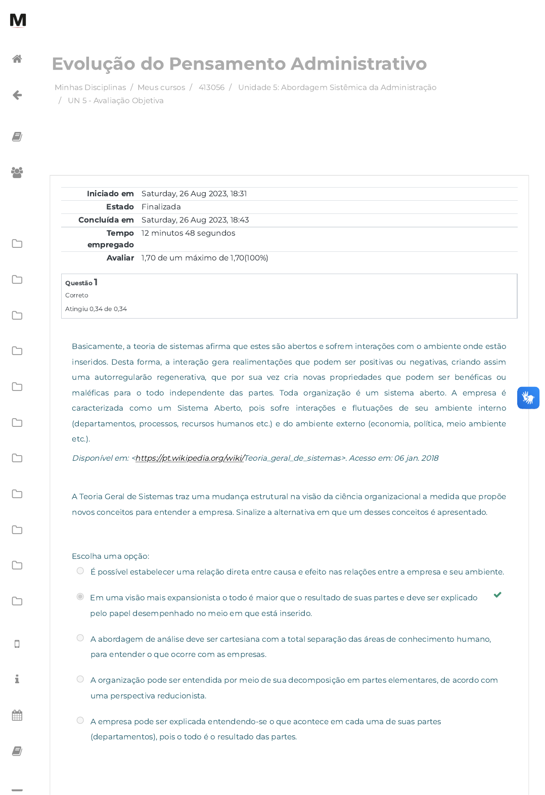 27/11/2023, 11:28 UN 5 - Avaliação Objetiva: Revisão da tentativa https://avap.multivix.edu.br/mod/quiz/review.php?attempt=3676586&cmid=1524554 1/4 Minhas Disciplinas / Meus cursos / 413056 / Unidade 5: Abordagem Sistêmica da Administração / UN 5 - Avaliação Objetiva Evolução do Pensamento Administrativo Iniciado em Saturday, 26 Aug 2023, 18:31 Estado Finalizada Concluída em Saturday, 26 Aug 2023, 18:43 Tempo empregado 12 minutos 48 segundos Avaliar 1,70 de um máximo de 1,70(100%) Questão 1 Correto Atingiu 0,34 de 0,34 Basicamente, a teoria de sistemas a�rma que estes são abertos e sofrem interações com o ambiente onde estão inseridos. Desta forma, a interação gera realimentações que podem ser positivas ou negativas, criando assim uma autorregularão regenerativa, que por sua vez cria novas propriedades que podem ser bené�cas ou malé�cas para o todo independente das partes. Toda organização é um sistema aberto. A empresa é caracterizada como um Sistema Aberto, pois sofre interações e �utuações de seu ambiente interno (departamentos, processos, recursos humanos etc.) e do ambiente externo (economia, política, meio ambiente etc.). Disponível em: <https://pt.wikipedia.org/wiki/Teoria_geral_de_sistemas>. Acesso em: 06 jan. 2018 A Teoria Geral de Sistemas traz uma mudança estrutural na visão da ciência organizacional a medida que propõe novos conceitos para entender a empresa. Sinalize a alternativa em que um desses conceitos é apresentado. Escolha uma opção: É possível estabelecer uma relação direta entre causa e efeito nas relações entre a empresa e seu ambiente. Em uma visão mais expansionista o todo é maior que o resultado de suas partes e deve ser explicado pelo papel desempenhado no meio em que está inserido. A abordagem de análise deve ser cartesiana com a total separação das áreas de conhecimento humano, para entender o que ocorre com as empresas. A organização pode ser entendida por meio de sua decomposição em partes elementares, de acordo com uma perspectiva reducionista. A empresa pode ser explicada entendendo-se o que acontece em cada uma de suas partes (departamentos), pois o todo é o resultado das partes. https://avap.multivix.edu.br/my/ https://avap.multivix.edu.br/course/view.php?id=23533 https://avap.multivix.edu.br/course/view.php?id=23533§ion=6 https://avap.multivix.edu.br/mod/quiz/view.php?id=1524554 https://pt.wikipedia.org/wiki/ https://avap.multivix.edu.br/my/ https://avap.multivix.edu.br/course/view.php?id=23533 https://avap.multivix.edu.br/user/index.php?id=23533 https://avap.multivix.edu.br/course/view.php?id=23533§ion=1 https://avap.multivix.edu.br/course/view.php?id=23533§ion=2 https://avap.multivix.edu.br/course/view.php?id=23533§ion=3 https://avap.multivix.edu.br/course/view.php?id=23533§ion=4 https://avap.multivix.edu.br/course/view.php?id=23533§ion=5 https://avap.multivix.edu.br/course/view.php?id=23533§ion=6 https://avap.multivix.edu.br/course/view.php?id=23533§ion=7 https://avap.multivix.edu.br/course/view.php?id=23533§ion=8 https://avap.multivix.edu.br/course/view.php?id=23533§ion=9 https://avap.multivix.edu.br/course/view.php?id=23533§ion=10 https://avap.multivix.edu.br/course/view.php?id=23533§ion=11 https://avap.multivix.edu.br/hooks/portal/ https://avap.multivix.edu.br/mod/page/view.php?id=1252%2F%22%20target%3D%22_blank https://avap.multivix.edu.br/calendar/view.php/ https://avap.multivix.edu.br/local/staticpage/view.php?page=biblioteca https://multivix.edu.br/office-365/ https://avap.multivix.edu.br/ https://avap.multivix.edu.br/ https://avap.multivix.edu.br/ https://avap.multivix.edu.br/ https://avap.multivix.edu.br/ 27/11/2023, 11:28 UN 5 - Avaliação Objetiva: Revisão da tentativa https://avap.multivix.edu.br/mod/quiz/review.php?attempt=3676586&cmid=1524554 2/4 Questão 2 Correto Atingiu 0,34 de 0,34 Questão 3 Correto Atingiu 0,34 de 0,34 Dentro dos conceitos da administração, o feedback representa um processo de informar um indivíduo ou unidade organizacional sobre os resultados de uma ação realizada. Esse procedimento ocorre com o objetivo de auxiliar quem recebe essa informação na busca por melhorias nos processos desempenhados. De acordo com abordagem sistêmica das organizações, analise as alternativas abaixo e marque a que representa o parâmetro feedback. Escolha uma opção: Está presente em processos de avaliação de desempenho, em que o líder repassa aos seus subordinados a avaliação de seus resultados e discute com os mesmos formas de melhorar seu desempenho. Dentro de um processo de planejamento estratégico, em que os gestores de�nem objetivos e metas a serem alcançados pela organização. A adoção de tecnologias que permitam a transformação dos insumos em produtos e serviços a serem ofertados ao mercado. Os processos de engenharia para o desenvolvimento de um novo produto, com base em pesquisa de mercado que avaliaram a percepção dos consumidores. A obtenção de recursos materiais, humanos, �nanceiros e informacionais para iniciar os processos organizacionais. A Teoria dos Sistemas rompeu com os paradigmas das teorias administrativas anteriores e trouxe uma nova forma de interpretação das organizações. Assinale a opção que indica uma inovação proposta pela Teoria dos Sistemas. Escolha uma opção: A hierarquia de comando da organização deve ser separada entre as funções. As organizações interagem continuamente com o ambiente externo. Os processos internos são su�cientes para o sucesso competitivo. O núcleo técnico deve estar ajustado ao núcleo estratégico. Os funcionários podem ser substituídos por máquinas para a otimização de tarefas especí�cas. https://avap.multivix.edu.br/my/ https://avap.multivix.edu.br/course/view.php?id=23533 https://avap.multivix.edu.br/user/index.php?id=23533 https://avap.multivix.edu.br/course/view.php?id=23533§ion=1 https://avap.multivix.edu.br/course/view.php?id=23533§io