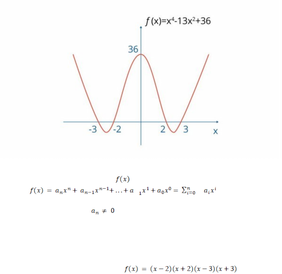 Resposta correta. A alternativa está correta, pois os valores de {-3, -2, 3, 2} são tais que f(x) = 0 e, portanto, correspondem às raízes da função. Então, dado {x i} as raízes de uma função de grau 4 essa pode ser expressa