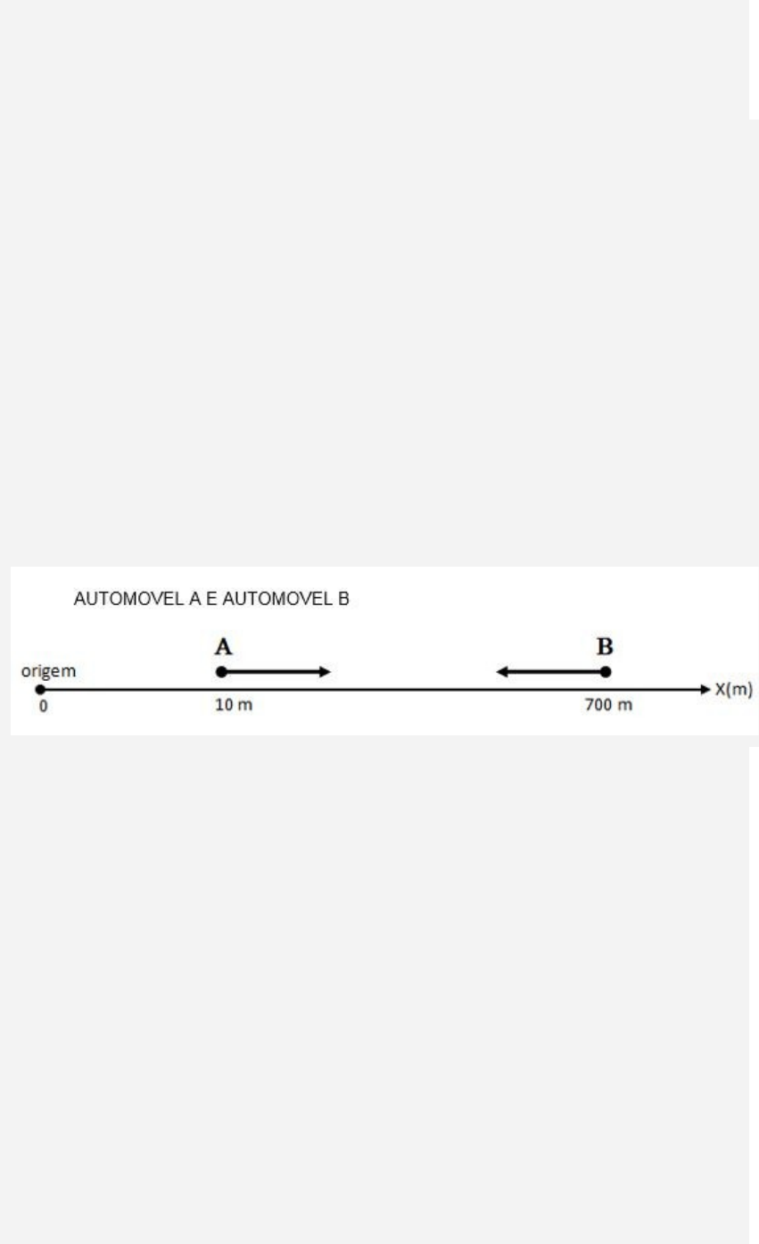1. Uma partícula está na posição 3,5 m quando começamos a observar o seu movimento, e possui uma velocidade de 6,5 m/s, se afastando da origem. Qual alternativa apresenta a função horária da posição para essa partícula. A) X = 6,5 - 3,5 t B) X = 6,5 + 3,5 t C) X = 3,5 + 6,5 t D) X = - 3,5 + 6,5 t 2. Dois automóveis, A e B, se deslocam numa mesma trajetória, A possui uma velocidade de 50 m/s e está em movimento progressivo e B tem uma velocidade de 30 m/s e está em movimento retrógrado. Suas posições iniciais estão indicadas na figura abaixo. Determine o instante e a posição de encontro dos dois. A) 8,625 s B) 0,625 s C) 6,825 s D) 8,000 s 3. Determine a posição inicial, a velocidade inicial e a aceleração da função X = - 2 - 5t + 4t2. E diga se o movimento é acelerado ou retardado. A) x0 = - 2, v = - 5 m/s, a = 4 m/s2 : Retardado B) x0 = 2, v = - 5 m/s, a = - 4 m/s2 : Acelerado C) x0 = 2, v = - 5 m/s, a = - 4 m/s2 : Retardado D) x0 = - 2, v = - 5 m/s, a = 8 m/s² - Acelerado 4. Uma pedra, partindo do repouso, cai de uma altura de 10,0 m do chão. (a) Com que velocidade ela possui na iminência da colisão com o chão? (b) Quanto tempo passou até que ela tocasse o chão? Assinale a alternativa que atende aos dois cálculos: A) 1,34 m/s; 1,343s B) 14,3 m/s; 14s C) 14 m/s; 1,43s D) 1,43 m/s; 14,3s 5. Assinale a alternativa que apresenta a posição inicial e a velocidade da função X = 3 – 5t. A) x0 = 3 m, v = – 2 m/s B) x0 = 3 m, v = – 5 m/s C) x0 = -5 m, v = 3 m/s D) x0 = - 3 , v = 5 t