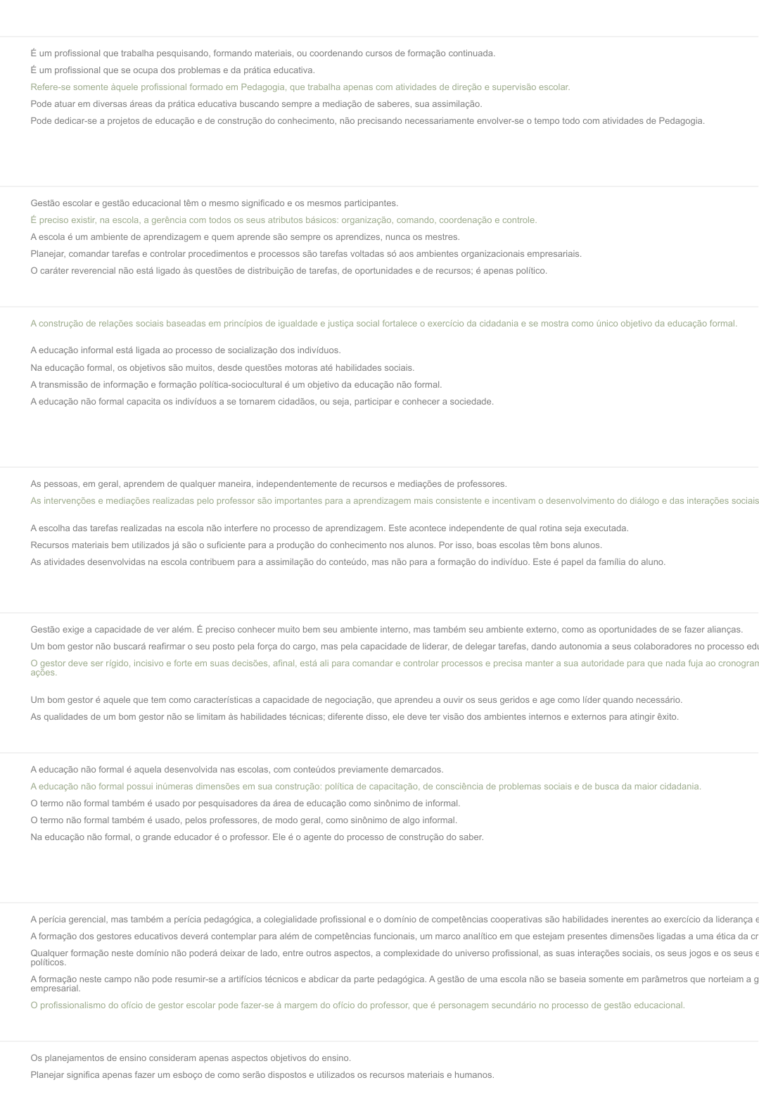 1. Com relação ao exercício profissional do pedagogo, suas atribuições e sua caracterização, NÃO se pode dizer que o pedagogo: 2. Ao pensar a organização escolar de forma gerencial, tendo em vista a hierarquia, as relações entre gestores e aqueles que são geridos, os indivíduos tornam-se sujeitos mais comprometidos e expostos. Este é o caráter reverencial da gestão. A alternativa CORRETA e que melhor dialoga com o trecho acima é: 3. Sobre a finalidade ou objetivos de cada um dos campos de educação abaixo, pode-se considerar INCORRETA a alternativa: 4. É certo que a educação e a aprendizagem se constroem tanto de maneira formal quanto informal. Isso quer dizer que nem sempre aquilo que se aprende é de responsabilidade da escola, das disciplinas clássicas estudadas dentro de suas paredes. Assinale a alternativa que se relaciona CORRETAMENTE à aprendizagem formal: 5. A perspectiva crítica da gestão educacional traz como motivação a desestabilização do discurso autoritativo, criticando a centralização e o poder coercivo. Sobre o papel do gestor, de acordo com esta teoria, está INCORRETO o que se afirma em: 6. Sobre a educação não formal e seu papel no processo educativo mais geral, pode-se considerar CORRETO o que se afirma em: 7. Pensando a abrangência do conceito de gestão em educação, há grande discussão acerca dos atributos necessários à formação do profissional para atuar nesta área. A respeito das características que compõem melhor o perfil para um ocupante deste cargo, relacionando-as com as complexas exigências do cargo, a alternativa que mais se distancia daquilo que é necessário para este profissional é aquela apresentada na alternativa: 8. Pensando a ação do docente em sala de aula e relacionando-a ao planejamento de ensino, pode-se considerar CORRETO: (Alternativa correta) É um profissional que trabalha pesquisando, formando materiais, ou coordenando cursos de formação continuada. É um profissional que se ocupa dos problemas e da prática educativa. Refere-se somente àquele profissional formado em Pedagogia, que trabalha apenas com atividades de direção e supervisão escolar. Pode atuar em diversas áreas da prática educativa buscando sempre a mediação de saberes, sua assimilação. Pode dedicar-se a projetos de educação e de construção do conhecimento, não precisando necessariamente envolver-se o tempo todo com atividades de Pedagogia. (Alternativa correta) Gestão escolar e gestão educacional têm o mesmo significado e os mesmos participantes. É preciso existir, na escola, a gerência com todos os seus atributos básicos: organização, comando, coordenação e controle. A escola é um ambiente de aprendizagem e quem aprende são sempre os aprendizes, nunca os mestres. Planejar, comandar tarefas e controlar procedimentos e processos são tarefas voltadas só aos ambientes organizacionais empresariais. O caráter reverencial não está ligado às questões de distribuição de tarefas, de oportunidades e de recursos; é apenas político. (Alte correta) A construção de relações sociais baseadas em princípios de igualdade e justiça social fortalece o exercício da cidadania e se mostra como único objetivo da educação formal. A educação informal está ligada ao processo de socialização dos indivíduos. Na educação formal, os objetivos são muitos, desde questões motoras até habilidades sociais. A transmissão de informação e formação política-sociocultural é um objetivo da educação não formal. A educação não formal capacita os indivíduos a se tornarem cidadãos, ou seja, participar e conhecer a sociedade. (Alternativa correta) As pessoas, em geral, aprendem de qualquer maneira, independentemente de recursos e mediações de professores. As intervenções e mediações realizadas pelo professor são importantes para a aprendizagem mais consistente e incentivam o desenvolvimento do diálogo e das interações sociais A escolha das tarefas realizadas na escola não interfere no processo de aprendizagem. Este acontece independente de qual rotina seja executada. Recursos materiais bem utilizados já são o suficiente para a produção do conhecimento nos alunos. Por isso, boas escolas têm bons alunos. As atividades desenvolvidas na escola contribuem para a assimilação do conteúdo, mas não para a formação do indivíduo. Este é papel da família do aluno. (Alternativa correta) Gestão exige a capacidade de ver além. É preciso conhecer muito bem seu ambiente interno, mas também seu ambiente externo, como as oportunidades de se fazer alianças. Um bom gestor não buscará reafirmar o seu posto pela força do cargo, mas pela capacidade de liderar, de delegar tarefas, dando autonomia a seus colaboradores no processo edu O gestor deve ser rígido, incisivo e forte em suas decisões, afinal, está ali para comandar e controlar processos e precisa manter a sua autoridade para que nada fuja ao cronogram ações. Um bom gestor é aquele que tem como características a capacidade de negociação, que aprendeu a ouvir os seus geridos e age como líder quando necessário. As qualidades de um bom gestor não se limitam às habilidades técnicas; diferente disso, ele deve ter visão dos ambientes internos e externos para atingir êxito. (Alternativa c A educação não formal é aquela desenvolvida nas escolas, com conteúdos previamente demarcados. A educação não formal possui inúmeras dimensões em sua construção: política de capacitação, de consciência de problemas sociais e de busca da maior cidadania. O termo não formal também é usado por pesquisadores da área de educação como sinônimo de informal. O termo não formal também é usado, pelos professores, de modo geral, como sinônimo de algo informal. Na educação não formal, o grande educador é o professor. Ele é o agente do processo de construção do saber. (Alternativa corre A perícia gerencial, mas também a