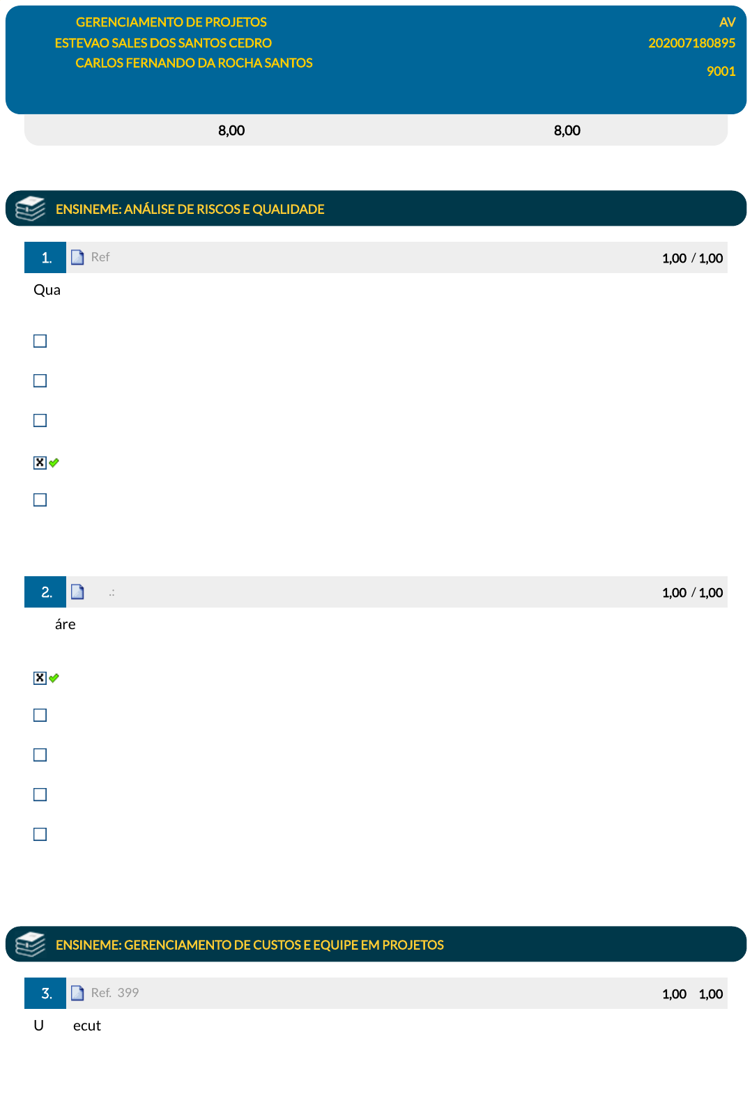 28/11/2023, 12:56 EPS https://simulado.estacio.br/alunos/ 1/4 Disciplina: GERENCIAMENTO DE PROJETOS AV Aluno: ESTEVAO SALES DOS SANTOS CEDRO 202007180895 Professor: CARLOS FERNANDO DA ROCHA SANTOS Turma: 9001 ARA1358_AV_202007180895 (AG) 27/10/2023 07:12:04 (F) Avaliação: 8,00 pts Nota SIA: 8,00 pts ENSINEME: ANÁLISE DE RISCOS E QUALIDADE 1. Ref.: 3990496 Pontos: 1,00 / 1,00 Quando falamos da Qualidade em Projetos, que já sabemos ser um processo que se estende até a conclusão, é correto dizer que: Cada Pacote de trabalho deve conter as estimativas de custo e prazo, ao passo que outros requisitos, tais como os da Qualidade já estão detalhados no Contrato. Premissas são hipóteses que podem ser não veri�cadas na prática, por isto deve haver uma Contingência a ser usada caso não se mostrem como verdadeiras. O Processo da Qualidade deve ser iniciado logo após a assinatura do Contrato, pois somente a partir deste evento será con�gurada uma relação formal entre as partes. Restrições são limitadores, podendo ser associadas, entre outros, à Qualidade, aos Custos ou ao Prazo do Projeto. Uma vez que o desdobramento do escopo nos entregáveis é sempre de responsabilidade total do Cliente, não há motivo para uma con�rmação por deste. 2. Ref.: 3990492 Pontos: 1,00 / 1,00 Na área da Qualidade, há conceitos importantes tais como Não Conformidade, Ação Preventiva e Ação Corretiva, então com base no que foi apresentado, é correto dizer que: A Não Conformidade é exatamente o não atendimento a um requisito estabelecido por especi�cação, norma, regulamento ou outro que regule a atividade. Ações Corretivas e Preventivas só devem ser aplicadas caso haja a reprovação de um item pelo Cliente. Do contrário, não há necessidade, pois erros fazem parte da rotina de execução. Uma Não Conformidade deve ser sempre tratada por meio de uma Ação Corretiva pois assim será eliminado o Risco de que venha a se materializar. As ações preventivas tratam de problemas reais, que podem trazer prejuízo ao projeto, por isto é importante identi�car as suas causas raízes. As Não conformidades, em geral, são apontadas indevidamente com base em uma interpretação equivocada por parte do Cliente. ENSINEME: GERENCIAMENTO DE CUSTOS E EQUIPE EM PROJETOS 3. Ref.: 3991057 Pontos: 1,00 / 1,00 Um executivo da sua empresa liga para o gerente de projetos e diz da sua preocupação com o projeto ABC, pois ele acha que o projeto já deveria estar na faze de implantação. Você, gerente de projetos, informa ao executivo que ele recebe o relatório de desempenho do projeto que produz a real situação do projeto. O javascript:alert('C%C3%B3digo da quest%C3%A3o: 3990496.'); javascript:alert('C%C3%B3digo da quest%C3%A3o: 3990496.'); javascript:alert('C%C3%B3digo da quest%C3%A3o: 3990492.'); javascript:alert('C%C3%B3digo da quest%C3%A3o: 3990492.'); javascript:alert('C%C3%B3digo da quest%C3%A3o: 3991057.'); javascript:alert('C%C3%B3digo da quest%C3%A3o: 3991057.'); 28/11/2023, 12:56 EPS https://simulado.estacio.br/alunos/ 2/4 executivo diz que não olha nenhuma papelada do projeto e que sempre preferiu ter a informação de forma verbal. Qual processo do Gerenciamento das Comunicações está falho? Gerenciar as comunicações. Monitorar as comunicações. Gerenciar as partes interessadas. Gerenciar a qualidade. Planejar o gerenciamento das comunicações. 4. Ref.: 3991052 Pontos: 1,00 / 1,00 Qual dos processos do Gerenciamento de Recursos, é responsável pela elaboração da documentação de funções, responsabilidades e habilidades dos recursos? Adquirir Recursos. Estimar os Recursos das Atividades. Desenvolver a Equipe. Gerenciar a Equipe. Planejar o Gerenciamento dos Recursos. ENSINEME: ORGANIZANDO O PROJETO NO TEMPO 5. Ref.: 7909921 Pontos: 1,00 / 1,00 A construção de um cronograma é uma etapa fundamental em qualquer projeto, pois permite a organização e o acompanhamento das atividades ao longo do tempo. Um cronograma bem elaborado contribui para o planejamento e�ciente e o cumprimento dos prazos estabelecidos. Nesse contexto, é importante compreender os conceitos e as técnicas utilizadas na construção do cronograma. Marque a alternativa que descreve corretamente o cronograma de projeto. O cronograma de projeto representa as atividades que não podem ser atrasadas sem impactar o prazo �nal do projeto. O cronograma de projeto é a linha que conecta as atividades mais importantes do projeto. O cronograma de projeto consiste nas atividades que possuem a menor folga em relação ao prazo estabelecido. O cronograma de projeto é a sequência de atividades com a maior duração total. O cronograma de projeto refere-se às atividades que devem ser realizadas em paralelo para otimizar o tempo. 6. Ref.: 7909917 Pontos: 0,00 / 1,00 Um gerente de projeto é responsável pela construção de um edifício. Durante o planejamento, o gerente percebe a importância de criar um cronograma para garantir que todas as etapas do projeto sejam concluídas no prazo. Marque a alternativa correta sobre a de�nição de cronograma em um projeto. Um documento que descreve os recursos necessários para cada atividade. Uma lista de tarefas a serem executadas no projeto. Um plano de ação para enfrentar eventuais imprevistos durante o projeto. Um grá�co que representa visualmente as dependências entre as atividades. Uma ferramenta para medir o progresso do projeto em relação ao tempo. javascript:alert('C%C3%B3digo da quest%C3%A3o: 3991052.'); javascript:alert('C%C3%B3digo da quest%C3%A3o: 3991052.'); javascript:alert('C%C3%B3digo da quest%C3%A3o: 7909921.'); javascript:alert('C%C3%B3digo da quest%C3%A3o: 7909921.'); javascript:alert('C%C3%B3digo da quest%C3%A3o: 7909917.'); javascript:alert('C%C3%B3digo da quest%C3%A3o: 7909917.'); 28/11/2023, 12:56 EPS https://simulado.estacio.br/alunos/ 3/4 ENSINEME: PROJETO ÁGIL 7. Ref.: 3990984 Pontos: 1,00 / 1,00 Assinale o item abaixo que p