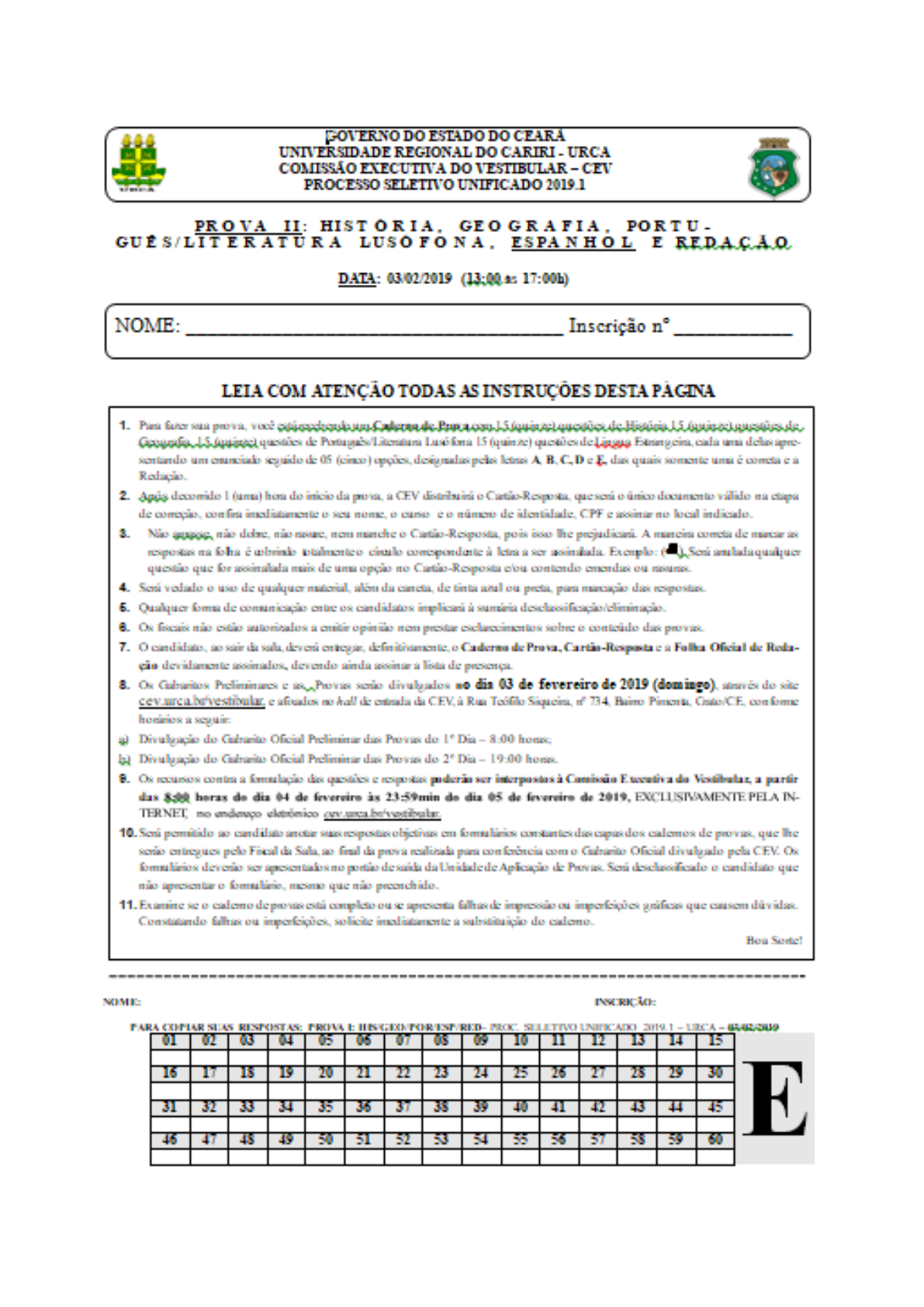 GOVERNO DO ESTADO DO CEARÁ UNIVERSIDADE REGIONAL DO CARIRI - URCA COMISSÃO EXECUTIVA DO VESTIBULAR – CEV PROCESSO SELETIVO UNIFICADO 2019.1 PROVA II: História, Geografia, Português/Literatura Lusófona, Língua Estrangeira e Redação – 03/02/2019 2 PROVA DE HISTÓRIA (QUESTÕES - 01 A 15) 01. (URCA/2019.1) “Alguém que circulasse pelas ruas do Rio de Janeiro no último quartel do século passado não precisaria ser um arguto observador para perceber que um dos mais graves problemas assolavam a cidade na ocasião era o da insalubridade. Centro nervoso do país, o Rio de Janeiro desfrutava à época da condição privilegiada de capital comercial, financeira, política, administrativa e cultural do Brasil. Esta condição, entretanto, se assegurava, por um lado, o direito da cidade proclamar-se vitrina das virtudes nacionais, impunha-lhe, por outro, o epíteto de um dos maiores focos de epidemias do mundo. Na primeira metade dos anos 1890, num cômputo com outros dezenove centros urbanos, o Rio de Janeiro ocupava a incômoda posição de sétima cidade mais insalubre.” (PECHMAN, Sérgio e FRITSCH, Lilian. A Reforma Urbana e o seu avesso: Algumas considerações a propósito da modernização do Distrito Federal na virada do Século. Revista Brasileira de História, S. Paulo, v. 5, n° 8q9, p. 140, set.1984/abr. 1985). Considerando o texto acima e os seus conhecimentos sobre as doenças e as reformas urbanas, o controle social e as disputas de poder no Brasil e na Europa do final do século XIX, assinale a alternativa correta: A) Doenças como a febre amarela e a varíola, entre outras enfermidades que matavam os habitantes do Rio de Janeiro do final do século passado, reduziram sua capacidade de ceifar vidas com o advento da República, pois já na primeira década do novo regime estas doenças tinham sido controladas; B) O adensamento populacional e a aglomeração humana geravam como subproduto as enfermidades de massa e as epidemias no Rio de Janeiro, o que não ocorria em outros centros do País, visto que os demais núcleos urbanos seguiam um lento crescimento, ao contrário do Distrito Federal; C) Algumas enfermidades que grassavam na Europa, como o tifo e a tuberculose, elegiam como alvo os organismos mais debilitados pelas más condições de trabalho e moradia, enquanto, no Brasil, doenças como a cólera não escolhiam suas vítimas, atacando, também, os setores sociais da elite, exigindo maior atenção da administração pública; D) A higienização das cidades da época exigia a adoção de medidas amplas em seu tecido urbanístico, no entanto, para dar cabo das epidemias era suficiente apenas o uso dos conhecimentos dos médicos sanitaristas, o que dispensava os conhecimentos de outros profissionais; E) O debate sobre a urbanização se esgotava nas opções apresentadas pelos princípios do capitalismo liberal, uma vez que os valores do socialismo foram suplantados à época pelos liberais ortodoxos com a Proclamação da República. 02. (URCA/2019.1) “Dizem os índios da aldeia da Ibiapaba... que por eles serem muitos, e cada vez se lhes agregam mais tapuias, que já hoje passam de quatrocentos, e por constarem as terras que lhes foram demarcadas de muitas penedias, e quebradas inúteis, e as poucas que eram capazes de plantas já estarem cansadas, não acham já a onde possam plantar... de que nasce haver na aldeia uma contínua fome, e se não fora a caridade de seus missionários de cem viúvas desamparadas, e muitos meninos órgãos estranhos em serviço dos moradores, morriam de fome: de que como eles suplicantes não têm GOVERNO DO ESTADO DO CEARÁ UNIVERSIDADE REGIONAL DO CARIRI - URCA COMISSÃO EXECUTIVA DO VESTIBULAR – CEV PROCESSO SELETIVO UNIFICADO 2019.1 PROVA II: História, Geografia, Português/Literatura Lusófona, Língua Estrangeira e Redação – 03/02/2019 3 mantimentos para si, não poder om eles remediar a outros.” (solicitação de Carta de Sesmaria – Documento do Conselho Ultramarino, 12 de out. 1720, APUD PINHEIRO, Francisco José. Mundos em confronto: povos nativos e europeus na disputa pelo território. IN: SOUZA, Simone (org.). Uma nova história do Ceará. Fortaleza: Edições Demócrito Rocha, 2000, p. 24). Considerando o texto acima, assinale a alternativa correta sobre o processo inicial de invasão europeia e os conflitos gerados no território hoje denominado de Ceará. A) A terra, para os povos indígenas, não era vista como um meio de produção na perspectiva mercantil, ao contrário, deveria ser um espaço da liberdade e de possiblidade de viver sem serem constrangidos pelo branco colonizador; B) Os lusos-brasileiros justificavam o uso das terras pelas necessidades coletivas sem preocupação com o lucro, referenciando os pedidos de sesmarias na ancestralidade de presença territorial; C) Para os povos indígenas, o que assegurava a posse da terra era ela estar devoluta e torná-la produtiva para a possibilitar lucros à Fazenda Real, na perspectiva mercantil; D) Os conquistadores, tanto colonos como missionários, procuravam pelos mais diversos meios se aliar aos povos indígenas, para tanto se submetiam aos modos de vida dos nativos; E) Para os povos indígenas, a terra era fundamentalmente um meio de produzir mercadorias; enquanto que, para os europeus, o território era fator de indispensável à sua integridade física e sociocultural; 03. (URCA/2019.1) “De todas as perguntas não respondidas sobre nossa época, talvez a mais importante seja: ‘o que é fascismo?’. Uma das organizações americanas de pesquisa fez recentemente pergunta a 100 pessoas diferentes e obteve respostas que foram desde ‘democracia pura’ até ‘demonismo puro’. Neste país, se se pedir a uma pessoa medianamente esclarecida que defina o fascismo, ela em geral responderá apontando os regimes alemão e italiano. Mas isso é muito insatisfatório, porque mesmo os grandes Estados fascistas diferem em boa medida um do outro 