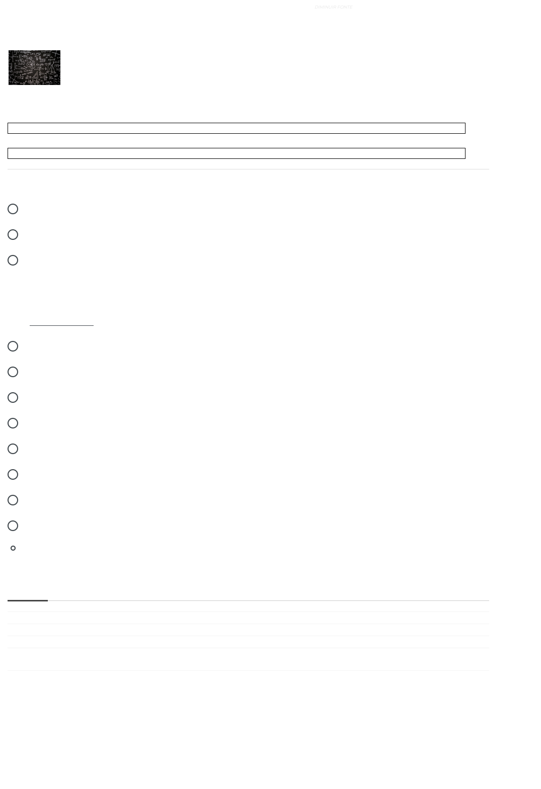 Matemática % % Andamento Geral Andamento do Tópico MEU DESEMPENHO MENU PÁGINA INICIAL / MEUS CURSOS / MATEMÁTICA / ATIVIDADE AVALIATIVA / QUESTÕES DE AVALIAÇÃO Iniciado em domingo, 24 set 2023, 16:20 Estado Finalizada Concluída em domingo, 24 set 2023, 16:29 Tempo empregado 8 minutos 30 segundos Avaliar 10,00 de um máximo de 10,00(100%) Questões de Avaliação Orientações Estatística Escala, porcentagem e juro Questões de Fixação Atividade Avaliativa Escala, Porcentagem e Juro Lógica e Métodos Dedutivos Sucessões e Progressões Potenciação, Radiciação e Funções Conjuntos e Funções Logaritmos e Trigonometria Geometria Analítica I Geometria Analítica II Propriedades Figuras Planas Minhas Mensagens Avaliação de aula Minhas Notas Contatos do curso Prova digital [ 1 ] IR PARA O CONTEÚDO [ 2 ] IR PARA O MENU SOBRE A ACESSIBILIDADE ALTO-CONTRASTE AUMENTAR FONTE DIMINUIR FONTE https://www.avaeduc.com.br/ https://www.avaeduc.com.br/ https://www.avaeduc.com.br/course/view.php?id=7137 https://www.avaeduc.com.br/mod/quiz/view.php?id=499398 https://www.avaeduc.com.br/course/view.php?id=7137&topic=114981 https://www.avaeduc.com.br/course/view.php?id=7137&topic=114985 https://www.avaeduc.com.br/course/view.php?id=7137&topic=114986 https://www.avaeduc.com.br/course/view.php?id=7137&topic=114987 https://www.avaeduc.com.br/local/mail/view.php?t=inbox javascript:void(0); javascript:void(0); javascript:void(0); javascript:void(0); https://www.avaeduc.com.br/mod/page/view.php?id=1 https://www.avaeduc.com.br/mod/page/view.php?id=1 a. 210 segundos. b. 60 segundos. c. 100 segundos. d. 36 segundos. e. 80 segundos. a. 150 b. 110 c. 140 d. 130 e. 120 a. 14.000.000 b. 140.000 c. 14.000 d. 1.400.000 e. 1.400 Questão 1 Correto Atingiu 1,00 de 1,00 Duas lâmpadas com defeito piscam com intervalos de tempo constantes. A primeira pisca a cada 16 segundos e a segunda pisca a cada 20 segundos. Se num determinado instante elas piscarem juntas, quanto tempo se passará para que pisquem juntas novamente? Escolha uma: Questão 2 Correto Atingiu 1,00 de 1,00 Desejo revestir o chão da minha sala usando apenas pisos quadrados de mesmo tamanho. A sala possui dimensões 6,30 m e 3,36 m. Qual a quantidade de pisos que devo comprar, sabendo que o chão foi dividido em um número mínimo de quadrados? Escolha uma: Questão 3 Correto Atingiu 1,00 de 1,00 O quadro apresenta informações da área aproximada de cada bioma brasileiro. Disponível em: www.ibge.gov.br. Acesso em: 10 jul. 2009 (adaptado). É comum em conversas informais, ou mesmo em noticiários, o uso de múltiplos da área de um campo de futebol (com as medidas de 120 m x 90 m) para auxiliar a visualização de áreas consideradas extensas. Nesse caso, qual é o número de campos de futebol correspondente à área aproximada do bioma Pantanal? Escolha uma: [ 1 ] IR PARA O CONTEÚDO [ 2 ] IR PARA O MENU SOBRE A ACESSIBILIDADE ALTO-CONTRASTE AUMENTAR FONTE DIMINUIR FONTE https://www.avaeduc.com.br/mod/page/view.php?id=1 https://www.avaeduc.com.br/mod/page/view.php?id=1 a. R$ 302,40. b. R$ 350,20. c. R$ 290,30. d. R$ 294,60. e. R$ 504,00. a. 32 b. 9 c. 11 d. 17 e. 21 a. 0 b. 1 c. 2 d. 3 e. 4 a. no conjunto dos inteiros não negativos. b. em um conjunto de números primos. c. em um conjunto de números ímpares. d. em um conjunto de múltiplos de 2. e. em um conjunto de múltiplos de 3. Questão 4 Correto Atingiu 1,00 de 1,00 Hoje de manhã recebi um comunicado de que meu plano de saúde sofreria um reajuste de 140% devido à de minha faixa etária. Fui ao PROCON e, após análise, concluiu-se que houve aumento abusivo e determinou-se que fosse reduzido 40% do valor que seria cobrado. Qual o valor da mensalidade após o reajuste, sabendo que hoje (sem aumento) pago R$ 210,00? Escolha uma: Questão 5 Correto Atingiu 1,00 de 1,00 Numa pista de treino, três ciclistas partem juntos da linha de largada e começam o treino. Eles completam a volta em 1,4 min, 1,8 min e 2,1 min. Quantas voltas completas são dadas pelo ciclista mais veloz quando se encontram pela primeira vez na linha de largada? Escolha uma: Questão 6 Correto Atingiu 1,00 de 1,00 O resto da divisão de um número natural por 3, 4, 7 ou 11 é igual a 1. Qual é o resto da divisão deste mesmo número por 5? Escolha uma: Questão 7 Correto Atingiu 1,00 de 1,00 O conjunto de todas as somas de um número inteiro positivo com o seu quadrado necessariamente resulta Escolha uma: [ 1 ] IR PARA O CONTEÚDO [ 2 ] IR PARA O MENU SOBRE A ACESSIBILIDADE ALTO-CONTRASTE AUMENTAR FONTE DIMINUIR FONTE https://www.avaeduc.com.br/mod/page/view.php?id=1 a. As frações tenham resultados distintos. b. Somente se conheça três números entre as duas frações. c. As duas frações sejam formadas somente por números pares. d. As duas frações sejam proporcionais e se conheçam três números. e. Se conheça somente um dos números entre as duas frações. a. 35 mil. b. 39 mil. c. 21 mil. d. 9 mil. e. 4 mil. a. A subtração entre os numeradores é zero. b. Os resultados de suas divisões são iguais ao número um. c. A multiplicação entre numerador e o denominador da mesma fração tem como resultado o número um. d. Os resultados de suas divisões são iguais. e. Os numeradores são números pares. Questão 8 Correto Atingiu 1,00 de 1,00 A regra de três se aplica somente entre frações que possuem o mesmo resultado. Para se aplicar a regra de três, é necessário que: Escolha uma: Questão 9 Correto Atingiu 1,00 de 1,00 Nos últimos cinco anos, 32 mil mulheres de 20 a 24 anos foram internadas nos hospitais do SUS por causa de AVC. Entre os homens da mesma faixa etária, houve 28 mil internações pelo mesmo motivo. Época. 26 abr. 2010 (adaptado). Suponha que, nos próximos cinco anos, haja um acréscimo de 8 mil internações de mulheres e que o acréscimo de internações de homens por AVC ocorra na mesma proporção. De acordo com as informações dadas, o número de homens que seriam intern
