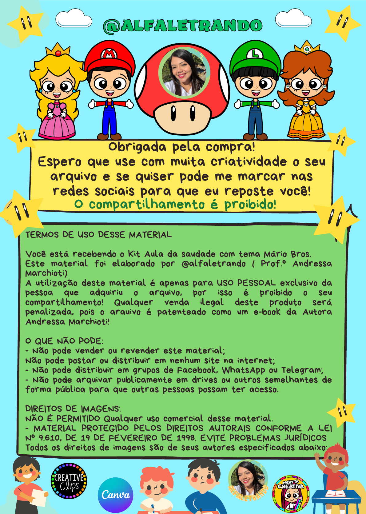 TERMOS DE USO DESSE MATERIAL Você está recebendo o Kit Aula da saudade com tema Mário Bros. Este material foi elaborado por @alfaletrando ( Prof.º Andressa Marchioti) A utilização deste material é apenas para USO PESSOAL exclusivo da pessoa que adquiriu o arquivo, por isso é proibido o seu compartilhamento! Qualquer venda ilegal deste produto será penalizada, pois o arauivo é patenteado como um e-book da Autora Andressa Marchioti! O QUE NÃO PODE: - Não pode vender ou revender este material; Não pode postar ou distribuir em nenhum site na internet; - Não pode distribuir em grupos de Facebook, WhatsApp ou Telegram; - Não pode arquivar publicamente em drives ou outros semelhantes de forma pública para que outras pessoas possam ter acesso. DIREITOS DE IMAGENS: NÃO É PERMITIDO Qualquer uso comercial desse material. - MATERIAL PROTEGIDO PELOS DIREITOS AUTORAIS CONFORME A LEI Nº 9.610, DE 19 DE FEVEREIRO DE 1998. EVITE PROBLEMAS JURÍDICOS Todos os direitos de imagens são de seus autores especificados abaixo: @ALFALETRANDO@ALFALETRANDO Obrigada pela compra! Espero que use com muita criatividade o seu arquivo e se quiser pode me marcar nas redes sociais para que eu reposte você! O compartilhamento é proibido! Licenciado Sarandreia, sarandreia@hotmail.com você está convidado(A) para a nossa aula da saudade! Dia e horário: você está convidado(A) para a nossa aula da saudade! você está convidado(A) para a nossa aula da saudade! você está convidado(A) para a nossa aula da saudade! você está convidado(A) para a nossa aula da saudade! Dia e horário: Dia e horário: Dia e horário: Dia e horário: @ A LF A LE TR A N D O @ A LF A LE TR A N D O @ A LF A LE TR A N D O @ A LF A LE TR A N D O @ A LF A LE TR A N D O Licenciado Sarandreia, sarandreia@hotmail.com P A R T IU F e R IA S ! P A R T IU F e R IA S ! -- @ A LF A LE TR A N D O Licenciado Sarandreia, sarandreia@hotmail.com P A R T IU F e R IA S ! P A R T IU F e R IA S ! -- @ A LF A LE TR A N D O Licenciado Sarandreia, sarandreia@hotmail.com P A R T IU F e R IA S ! P A R T IU F e R IA S ! -- Licenciado Sarandreia, sarandreia@hotmail.com P A R T IU F e R IA S ! P A R T IU F e R IA S ! -- Licenciado Sarandreia, sarandreia@hotmail.com P A R T IU F e R IA S ! P A R T IU F e R IA S ! P A R T IU F e R IA S ! P A R T IU F e R IA S ! -- -- @ALFALETRANDO@ALFALETRANDO Embalagem para Pipoca Licenciado Sarandreia, sarandreia@hotmail.com ?? ?? @ALFALETRANDO @ALFALETRANDO Embalagem para doces Licenciado Sarandreia, sarandreia@hotmail.com Powered by TCPDF (www.tcpdf.org) http://www.tcpdf.org
