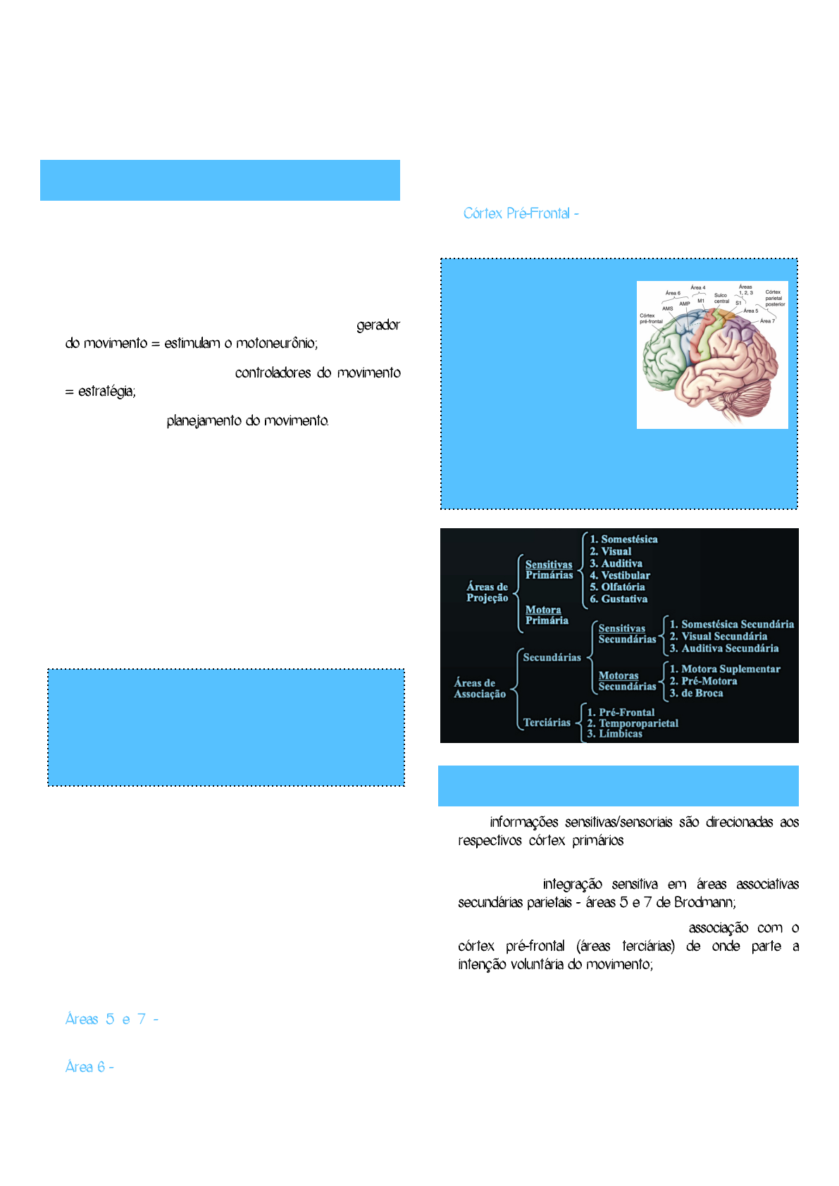 Universidade Nove de Julho Maria Lívia Introdução: Organização Geral do Siema Motor: ✓ Músculos; ✓ Element Neurais: • Medula espinal, tronco encefálico, córtex motor - gerador do movimento = estimulam o motoneurônio; • Cerebelo, núcleos da base - controladores do movimento = estratégia; • Córtex cerebral - planejamento do movimento. ✓ Moviment Voluntári - estudos demonstram que 1,5s antes da execução de um movimento voluntário há um planejamento gerando um potencial lento no córtex. Áreas do Planejamento - Áreas de Projeção: ✓ Áreas 1, 2 e 3 (S1) - informações sensoriais primárias (onde chega); ✓ Área 4 (M1) - informações motoras primárias (onde sai todo o movimento); Áreas de Aociação: ✓ Essas áreas não se relacionam diretamente com a motricidade ou com a sensibilidade; ✓ Áreas Secundárias - Unimodais: • Estão indiretamente relacionadas com uma determinada modalidade sensorial ou com a motricidade; • Conectam-se com as áreas primárias de mesma função; • Áreas 5 e 7 - córtex parietal posterior = informações sensitivas; • Área 6 - AMS e AMP = informações motoras. ✓ Áreas Terciárias - Supramodais: • Não se ocupam do processamento motor ou sensitivo; • Possuem atividades psíquicas superiores - memória, processos simbólicos, pensamento abstrato, etc; • Córtex Pré-Frontal - de onde se constrói o pensamento, a ideia para iniciar um movimento. O planejamento motor: ✓ 1. As informações sensitivas/sensoriais são direcionadas aos respectivos córtex primários - olfatório, auditivo, gustativo, visual, somatossensorial e proprioceptivo (cerebelo); ✓ 2. Ocorre a integração sensitiva em áreas associativas secundárias parietais - áreas 5 e 7 de Brodmann; ✓ 3. Dessas áreas interativas ocorre a associação com o córtex pré-frontal (áreas terciárias) de onde parte a intenção voluntária do movimento; • O córtex pré-frontal se associa com a área 6, com os núcleos da base e com a formação reticular para informar o planejamento da ação; • Área 6 informa também a formação reticular e área 4 motora; • Os núcleos da base juntamente com o cerebelo enviam eferências para a área 4 e 6 motoras para o inicio e sequenciamento dos movimentos. Planejamento motorPlanejamento Motor As áreas de projeção que são as áreas primárias recebem ou dão origem a fibras relacionadas diretamente com a sensibilidade e com a motricidade. M1 - córtex motor primário: movimentos simples; AMS - área motora suplementar: movimentos complexos de músculos distais; AMP - área pré-motora: movimentos complexos de músculos proximais (conecta-se principalmente com neurônios reticulospinais). Universidade Nove de Julho Maria Lívia ✓ 4. A área motora primária (4) inicia à execução dos movimentos por meio dos tratos descendentes agem diretamente nos motoneurônios inferiores alfa e gama medulares e estes enviam sinais para contração muscular. Córtex Motor Primário - M1: ✓ Aferências: • Áreas corticais - áreas 6 e 1, 2 e 3; • Tálamo. ✓ Eferências - camada V: • Medula espinal; • Tronco encefálico - colaterais. Córtex Cerebral - Área Motora Primária: ✓ Localizado no giro pré-central; ✓ Responsável pela motricidade voluntária contralateral; ✓ Possui conexõ aferent: • Tálamo - informações oriundas do cerebelo; • Área somestésica; • Áreas pré-motora e motora suplementar - AMP e AMS. ✓ Fibras eferent - tratos córtico-espinal e corticonuclear; ✓ Somatotopia - homúnculo motor. Córtex Cerebral - Áreas Motoras Secundárias: ✓ Área Pré-Motora - AMP: • Localizada no lobo frontal, adiante da área motora 1ª; • Possui conexões eferentes - formação reticular; - Trato reticulospinal (via córtico-reticulo-espinal): controle motor da musculatura axial e proximal dos membros (postura). • Possui conexões aferentes - cerebelo e outras áreas de associação; • Relacionado com a postura e movimentos guiados por estímulos sensoriais externos. ✓ Área Motora Suplementar - AMS: • Localizada na face média do giro frontal superior; • Possui conexões com o corpo estriado e com a área motora primária; • Responsável pela concepção/planejamento de sequências complexas de movimentos - envolvendo por exemplo, os dedos.. Motricidade Volutária: ✓ Se baseia através de uma decisão tomada pelo córtex aociativo terciário - enviará as informações para as áreas de planejamento motor; • O planejamento ativará os circuitos de controle (núcleos da base e cerebelo) enviando sinais para área motora 1ª; • Na área motora 1ª, as vias motoras descendentes (neurônio motor superior) vão enviar informações para os neurônios motores inferiores até os músculos esqueléticos. Controle do Movimento - a Unidade: ✓ Para que haja controle do movimento é necessário uma integração entre o neurônio sensorial e o neurônio motor; ✓ Movimento - produzido por padrões espaciais e temporais de contrações musculares desencadeados pelo encéfalo e pela medula espinal. Motoneurôni Alfa e Gama: ✓ Unidade Motora ou de Comando - cada neurônio motor se ramifica para inervar um número de fibras musculares; • Quando o motoneurônio é ativado todas estas fibras musculares se contraem - motoneurônio + todas fibras por ele inervadas. ✓ Regulação da Força Muscular: • Tipo de unidade motoras recrutadas; • Frequência de potenciais gerados pelo motoneurônio; • Somação e tetania. ✓ Contração Muscular Graduada - o músculo esquelético pode contrair-se em graus distintos; • Recrutamento - aumentando o nº de unidades motoras ativas aumentará a força da contração muscular; • Somação das unidades motoras - uma contração se sobrepõem à outra. Tip de Moviment Gerad: ✓ Reflexo - simples, rápidos, projeção e integrados na medula ou tronco encefálico; ✓ Rítmico - padronizado e cíclicos (mastigação e m