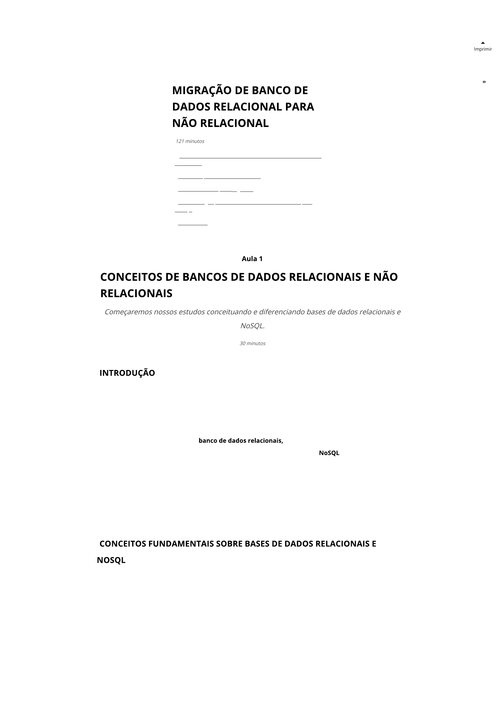 Começaremos nossos estudos conceituando e diferenciando bases de dados relacionais e NoSQL. Veremos que, além de diferenças em suas estruturas, também temos atualmente diversos tipos de bancos de dados disponíveis. Nos sistemas de gerenciamento de veremos que os dados são armazenados de forma estruturada, porém possuem limitações como a escalabilidade. Já o trabalha com dados não estruturados e sem esquema e, desta forma, podem ser armazenados em várias coleções e nós. A transferência de dados, por �m, é o processo no qual os dados são transferidos entre sistemas. Diversos motivos, como problemas de custo, melhores recursos e serviços rápidos, podem fazer com que uma empresa trans�ra dados de uma plataforma para outra. As organizações, de um modo geral, utilizam um volume grande de ativos, por exemplo, imóveis. No entanto, talvez o ativo mais valioso seja a informação, os dados. Logo, os dados são a espinha dorsal de todos os projetos que envolvem tecnologia. Geralmente temos os dados armazenados em um Sistema de Gerenciamento de Banco de Dados (SGBD), cuja interação e comunicação com o SGBD, é realizada a partir do uso de uma determinada linguagem que ele entenda, desse modo foi criada uma linguagem que é utilizada para interagir com os sistemas de banco de dados, que chamamos de Structured Query Language (SQL) (METWALLI, 2022). Começaremos nossos estudos conceituando e diferenciando bases de dados relacionais e NoSQL. 30 minutos Aula 1 - Conceitos de bancos de dados relacionais e não relacionais Aula 2 - Tipos de bases de dados Aula 3 - Introdução a Big Data Aula 4 - Migração de bases de dados relacionais para NoSQL Referências 121 minutos Imprimir V er a n o ta çõ es https://conteudo.colaboraread.com.br/202202/EAD/BANCO_DE_DADOS_NAO_RELACIONAIS/LIVRO_DIGITAL/U4/index.html#aula1 https://conteudo.colaboraread.com.br/202202/EAD/BANCO_DE_DADOS_NAO_RELACIONAIS/LIVRO_DIGITAL/U4/index.html#aula1 https://conteudo.colaboraread.com.br/202202/EAD/BANCO_DE_DADOS_NAO_RELACIONAIS/LIVRO_DIGITAL/U4/index.html#aula1 https://conteudo.colaboraread.com.br/202202/EAD/BANCO_DE_DADOS_NAO_RELACIONAIS/LIVRO_DIGITAL/U4/index.html#aula1 https://conteudo.colaboraread.com.br/202202/EAD/BANCO_DE_DADOS_NAO_RELACIONAIS/LIVRO_DIGITAL/U4/index.html#aula1 https://conteudo.colaboraread.com.br/202202/EAD/BANCO_DE_DADOS_NAO_RELACIONAIS/LIVRO_DIGITAL/U4/index.html#aula1 https://conteudo.colaboraread.com.br/202202/EAD/BANCO_DE_DADOS_NAO_RELACIONAIS/LIVRO_DIGITAL/U4/index.html#aula1 https://conteudo.colaboraread.com.br/202202/EAD/BANCO_DE_DADOS_NAO_RELACIONAIS/LIVRO_DIGITAL/U4/index.html#aula2 https://conteudo.colaboraread.com.br/202202/EAD/BANCO_DE_DADOS_NAO_RELACIONAIS/LIVRO_DIGITAL/U4/index.html#aula2 https://conteudo.colaboraread.com.br/202202/EAD/BANCO_DE_DADOS_NAO_RELACIONAIS/LIVRO_DIGITAL/U4/index.html#aula2 https://conteudo.colaboraread.com.br/202202/EAD/BANCO_DE_DADOS_NAO_RELACIONAIS/LIVRO_DIGITAL/U4/index.html#aula2 https://conteudo.colaboraread.com.br/202202/EAD/BANCO_DE_DADOS_NAO_RELACIONAIS/LIVRO_DIGITAL/U4/index.html#aula3 https://conteudo.colaboraread.com.br/202202/EAD/BANCO_DE_DADOS_NAO_RELACIONAIS/LIVRO_DIGITAL/U4/index.html#aula3 https://conteudo.colaboraread.com.br/202202/EAD/BANCO_DE_DADOS_NAO_RELACIONAIS/LIVRO_DIGITAL/U4/index.html#aula3 https://conteudo.colaboraread.com.br/202202/EAD/BANCO_DE_DADOS_NAO_RELACIONAIS/LIVRO_DIGITAL/U4/index.html#aula3 https://conteudo.colaboraread.com.br/202202/EAD/BANCO_DE_DADOS_NAO_RELACIONAIS/LIVRO_DIGITAL/U4/index.html#aula3 https://conteudo.colaboraread.com.br/202202/EAD/BANCO_DE_DADOS_NAO_RELACIONAIS/LIVRO_DIGITAL/U4/index.html#aula3 https://conteudo.colaboraread.com.br/202202/EAD/BANCO_DE_DADOS_NAO_RELACIONAIS/LIVRO_DIGITAL/U4/index.html#aula4 https://conteudo.colaboraread.com.br/202202/EAD/BANCO_DE_DADOS_NAO_RELACIONAIS/LIVRO_DIGITAL/U4/index.html#aula4 https://conteudo.colaboraread.com.br/202202/EAD/BANCO_DE_DADOS_NAO_RELACIONAIS/LIVRO_DIGITAL/U4/index.html#aula4 https://conteudo.colaboraread.com.br/202202/EAD/BANCO_DE_DADOS_NAO_RELACIONAIS/LIVRO_DIGITAL/U4/index.html#aula4 https://conteudo.colaboraread.com.br/202202/EAD/BANCO_DE_DADOS_NAO_RELACIONAIS/LIVRO_DIGITAL/U4/index.html#aula4 https://conteudo.colaboraread.com.br/202202/EAD/BANCO_DE_DADOS_NAO_RELACIONAIS/LIVRO_DIGITAL/U4/index.html#aula4 https://conteudo.colaboraread.com.br/202202/EAD/BANCO_DE_DADOS_NAO_RELACIONAIS/LIVRO_DIGITAL/U4/index.html#aula4 https://conteudo.colaboraread.com.br/202202/EAD/BANCO_DE_DADOS_NAO_RELACIONAIS/LIVRO_DIGITAL/U4/index.html#referencias https://conteudo.colaboraread.com.br/202202/EAD/BANCO_DE_DADOS_NAO_RELACIONAIS/LIVRO_DIGITAL/U4/index.html#referencias Porém, nas últimas décadas, tanto o volume como a velocidade dos dados cresceram exponencialmente, e tivemos como consequência, uma grande diversidade de tecnologias de banco de dados que passaram a serem desenvolvidas a �m de atender a grande demanda do mercado. Esses bancos de dados possuem normalmente implementações distribuídas, pois o volume de dados que são gerenciados excede muito a capacidade de armazenamento de um único nó (PLOETZ et al., 2018). E, assim, surgiu o banco de dados não relacional. E o NoSQL é a linguagem utilizada para interagir com bancos de dados não relacionais. Como mencionado, hoje possuímos diversos tipos de bancos de dados disponíveis, alguns com mais popularidade. No SQL, temos: MySQL, Oracle, Microsoft SQL Server e o PostgreSQL. Já no NoSQL, temos o MongoDB e Cassandra e muitos outros, porém menos populares no mercado (PLOETZ et al., 2018). Esses bancos de dados são amplamente implantados nas organizações, e possuem diferentes modelos de dados, que vão desde o modelo de documento do MongoDB, ou modelo coluna-família do Cassandra. A nos estudos de um banco de dados diz respeito à con�abilidade do desempenho de suas funções. Logo, um sistema dito consistente realiza determinadas leituras obtendo como retorno o valor da última 