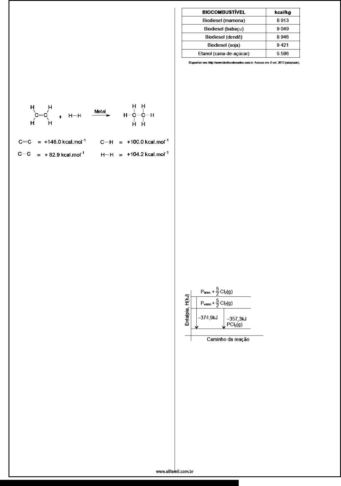 203 d) a variação da entalpia é maior que zero. e) a variação da entalpia é nula. 8- A formação e a quebra das ligações químicas é de grande importância para prever a estabilidade dos produtos que serão formados no curso de uma reação química. Portanto, a partir do conhecimento das energias de ligação presentes nos reagentes e produtos, pode-se estimar a variação de energia total envolvida na reação química. Um exemplo é a reação de hidrogenação do eteno, cuja equação química e cujas energias de ligação são apresentadas a seguir. Considerando-se as informações apresentadas, pode-se concluir que a variação da energia envolvida na reação em kcal.mol-1 é, aproximadamente: a) 167 b) 33 c) 60 d) 433 9- O nitrato de amônio, um dos fertilizantes nitrogenados mais importantes para a agricultura, é obtido pela reação entre amônia e ácido nítrico, de acordo com a equação: NH3 (g) + HNO3 (aq) → NH4NO3 (aq) ΔH = – 86 kJ/mol É correto afirmar que essa reação é a) exotérmica, e libera 86 kJ/mol de nitrato de amônio. b) endotérmica, e absorve 86 kJ/mol de amônia. c) endotérmica, e libera 86 kJ/mol de nitrato de amônio. d) exotérmica, e absorve 86 kJ/mol de amônia. e) isotérmica, e libera 86 kJ/mol de ácido nítrico. 10- Considera-se combustível aquele material que, quando em combustão, consegue gerar energia. No caso dos biocombustíveis, suas principais vantagens de uso são a de serem oriundos de fontes renováveis e a de serem menos poluentes que os derivados de combustíveis fósseis. Por isso, no Brasil, tem-se estimulado o plantio e a industrialização de sementes oleaginosas para produção de biocombustíveis. No quadro, estão os valores referentes à energia produzida pela combustão de alguns biocombustíveis: Entre os diversos tipos de biocombustíveis apresentados no quadro, aquele que apresenta melhor rendimento energético em massa é proveniente a) da soja. b) do dendê. c) do babaçu. d) da mamona. e) da cana-de-açúcar. 11- Uma compressa de água fria usada para luxações é constituída de duas bolsas: uma contém água e a outra, nitrato de amônio. Quando pressionada, a bolsa de água se rompe dissolvendo o nitrato de amônio e produzindo um frio instantâneo que pode durar até quarenta minutos. A explicação coerente para o fenômeno é que a) ocorre, no caso, uma reação química de adição. b) o nitrato de amônio se ioniza na presença de água. c) o nitrato de amônio é uma substância termoscópica. d) a dissolução do nitrato de amônio é um processo endotérmico. 12- O diagrama representa a entalpia de formação do pentacloreto de fósforo a partir de duas variedades alotrópicas de fósforo, o fósforo branco e o fósforo vermelho. A partir da análise desse diagrama, é correto afirmar: a) A variedade alotrópica de fósforo vermelho é menos estável que a de fósforo branco. b) A entalpia de formação do fósforo vermelho é −17,6kJ. c) A variação de entalpia de uma reação química independe do estado alotrópico de seus reagentes. d) A energia liberada durante a formação de pentacloreto de fósforo, a partir de fósforo branco, é maior que a liberada na mesma reação com o fósforo vermelho. http://www.elitemil.com.br/ 204 e) A forma geométrica da molécula de pentacloreto de fósforo é tetraédrica. 13- Na reação de combustão completa da glicose, os produtos têm ________ energia armazenada do que os reagentes, portanto, essa reação é ________ e o sinal de seu ΔH é ________. As lacunas desse texto são preenchidas, correta e respectivamente, por a) menos – exotérmica – positivo. b) menos – endotérmica – positivo. c) mais – endotérmica – negativo. d) menos – exotérmica – negativo. e) mais – exotérmica – negativo. 14- Durante um processo físico, a informação mais importante é a relativa à variação da entropia, e não a do seu valor absoluto. No século XIX, Clausius determinou que a variação da entropia de um sistema, em um processo reversível e à temperatura T, em Kelvin, é dada por ΔS = ΔQ/T, em que ΔI é a quantidade de calor adicionado. Com relação a esse conceito, considere a situação em que 30 g de gelo, inicialmente a 0 ºC, transforma-se em água a 0 ºC. Considere, ainda, que o calor latente de fusão do gelo seja 80 cal/g. Com base nessas informações, julgue o próximo item. Como a fusão do gelo é um processo irreversível, o módulo da variação de entropia da vizinhança é igual ao da variação da entropia do sistema. a) CERTO b) ERRADO 15- Quando a mistura de um mol de H2(g) e um mol de I2(g) é aquecida a 500K, o produto resultante da reação é HI(g). Para essa reação, a 500K, a variação na entalpia encontrada foi -10,8 kJ mol-1 e a variação da entropia, 17,7 J K-1 mol-1. Com relação à reação, é correto afirmar: a) A reação é exotérmica e a entropia do sistema diminui. b) A reação é endotérmica e um aumento na pressão sobre o sistema provoca um deslocamento da reação para o lado dos reagentes. c) A reação apresenta um aumento de entropia e ocorre espontaneamente. d) Valores da entalpia e da entropia do sistema indicam que a reação não ocorre espontaneamente. e) A reação ocorre com um aumento de entropia e é endotérmica. 16- A gota é uma doença das articulações, causada pela concentração elevada de ácido úrico no sangue e nos tecidos. As articulações tornam-se inflamadas, doloridas e artríticas devido à deposição anormal de cristais de urato de sódio. A gota pode ser tratada de maneira eficiente por uma combinação de terapias nutricionais e farmacológicas. Um grande alívio dos sintomas pode ser obtido pela administração de alopurinol, uma substância indicada para a redução do urato. O alopurinol inibe a enzima que catalisa a conversão de purinas em ácido úrico. Nesse processo oxidativo, o alopurinol é convertido em oxipurinol, conforme descrito