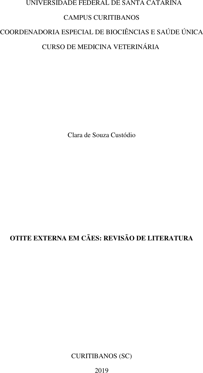 UNIVERSIDADE FEDERAL DE SANTA CATARINA CAMPUS CURITIBANOS COORDENADORIA ESPECIAL DE BIOCIÊNCIAS E SAÚDE ÚNICA CURSO DE MEDICINA VETERINÁRIA Clara de Souza Custódio OTITE EXTERNA EM CÃES: REVISÃO DE LITERATURA CURITIBANOS (SC) 2019 CLARA DE SOUZA CUSTÓDIO OTITE EXTERNA EM CÃES: REVISÃO DE LITERATURA Trabalho de Conclusão do Curso de Graduação em Medicina Veterinária do Centro de Ciências Rurais da Universidade Federal de Santa Catarina como requisito parcial para a obtenção do Título de Médico Veterinário. Orientadora: Profª. Drª. Rosane Maria Guimarães da Silva Curitibanos (SC) 2019 Ficha de identificação da obra elaborada pelo autor através do Programa de Geração Automática da Biblioteca da Universitária da UFSC. CLARA DE SOUZA CUSTÓDIO OTITE EXTERNA EM CÃES: REVISÃO DE LITERATURA Este Trabalho Conclusão de Curso foi julgado adequado para obtenção do Título de bacharelado em Medicina Veterinária e aprovado em sua forma final pela seguinte banca: Curitibanos, 02 de 12 de 2019. ________________________ Prof. Dr. Alexandre Oliveira Tavela, Coordenador do Curso Banca Examinadora: ________________________ Prof.ª Drª. Rosane Maria Guimarães da Silva, Orientadora Universidade Federal de Santa Catarina ________________________ Prof. Dr. Alexandre Oliveira Tavela, Universidade Federal de Santa Catarina ________________________ Prof. Dr. Álvaro Menin, Universidade Federal de Santa Catarina AGRADECIMENTOS Agradeço aos meus pais Márcia e Osnildo por todo amor recebido, por sempre me proporcionarem educação de qualidade, por estarem ao meu lado nos momentos mais difíceis, pelo incentivo a minha carreira de Médica Veterinária, e aos meus irmãos, por todos os conselhos necessários durante a graduação. Agradeço aos meus amigos da faculdade, especialmente à minha amiga Tainã Kuwer Jacobsen, sem vocês o caminho até aqui teria sido muito mais difícil, tenho certeza que depois de anos a amizade continuará a mesma, obrigada por todo apoio e momentos de descontração. Agradeço aos meus mestres que tanto me ensinaram com seus conhecimentos nas diversas áreas da Medicina Veterinária, em especial a professora e Dra. Rosane Maria Guimarães da Silva pelo tempo investido para a orientação do meu TCC. Agradecimentos também vão aos médicos veterinários das clínicas estagiadas durante todo o percurso da graduação. Obrigada pela oportunidade incrível fornecida e ensinamentos compartilhados. RESUMO: A otite externa é uma doença dermatológica de grande importância na clínica médica de pequenos animais. Consiste na inflamação do epitélio da orelha externa e ocorre em várias espécies, sendo particularmente frequente em cães. Os sinais clínicos comumente observados são eritema, edema, otalgia, otorréia e prurido evidenciado por meneios cefálicos. Anamnese detalhada, e exames físicos e complementares completos, são essenciais para identificar os fatores predisponentes, primários, secundários e perpetuadores presentes em cada animal, para assim assegurar um tratamento eficaz. Esse trabalho é uma revisão bibliográfica que tem por objetivo o estudo da otite externa em cães. Palavras-chave: otite externa; cães; sinais clínicos. ABSTRACT: External otitis is a dermatological disease of great importance in the medical clinic of small animals. It consists of inflammation of the outer ear epithelium and occurs in several species, being particularly common in dogs. The commonly observed clinical signs are erythema, edema, otalgia, otorrhea and pruritus evidenced by headache. Detailed history, and complete physical and complementary exams, are essential to identify the predisposing, primary, secondary and perpetuating factors present in each animal to ensure effective treatment. This paper is a literature review that aims to study otitis externa in dogs. Keywords: external otitis; dogs; clinical signs. LISTA DE FIGURAS Figura 1 - Desenho ilustrativo da divisão da orelha de um cão ........................................... 13 Figura 2 - Otite externa em um cão com dermatite atópica ................................................. 19 Figura 3 - Foto de Otodectes cynotis fêmea adulto.............................................................. 20 Figura 4 - Tufos de pelo emergindo do canal auditivo horizontal ....................................... 22 Figura 5 - Exsudado do canal auditivo externo de cão com presença de cocos ................. 25 Figura 6 - Exsudado do canal auditivo externo de cão. Cocos fagocitados por um neutrófilo. ............................................................................................................................. 25 Figura 7 - Malassezia spp. observada microscopicamente, no aumento de 1000x. ............ 27 Figura 8 - Hiperplasia do canal auditivo de cão com otite externa ...................................... 28 Figura 9 - Orelha de cão com otite externa, observa-se a presença de eritema e edema ..... 29 Figura 10 - Teste de elevação dorsal do pavilhão auricular. ................................................ 30 Figura 11 - Teste da pressão no trago .................................................................................. 30 Figura 12 - Exame otoscópico em cão da raça Whippet ...................................................... 31 Figura 13 - Coleta de material para citologia auricular. ...................................................... 32 Figura 14 - Coloração de lâmina pelo método de panótico rápido ...................................... 33 Figura 15 - Cerúmen amarelado nas proximidades do tímpano. ......................................... 34 Figura 16 – Cerúmen marrom irregular aderido nas paredes do meato acústico externo .... 34 LISTA DE ABREVIATURAS E SIGLAS % Por cento ºC Graus Celsius cm Centímetros et al. “e outros” IgA Imunoglobulinas A IgE Imunoglobulinas E IgG Imunoglobulinas G IgM Imunoglobulinas M Kg Quilogramas Mg Miligra