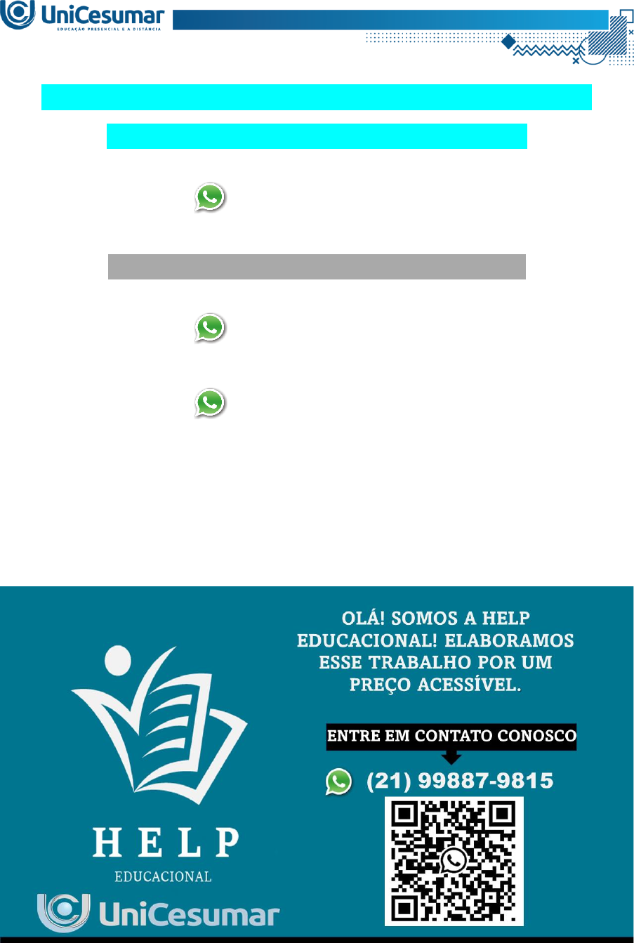 ATIVIDADE 3 – FAR - ATENÇÃO FARMACÊUTICA E SERVIÇOS FARMACÊUTICOS - 54/2023 (21) 99887-9815 ASSESSORIA NOS SEUS TRABALHOS (21) 99887-9815 (21) 99887-9815 "A efetividade da farmacoterapia é a expressão dos efeitos benéficos do tratamento sobre o paciente. A eficácia consiste na capacidade do medicamento em produzir um efeito farmacológico no paciente sob condições ideais de uso, isto é, comprovada por ensaios clínicos. A farmacoterapia é considerada efetiva quando conduz ao alcance das metas terapêuticas previamente estabelecidas." Fonte: DOBLINSKI, P. M. F. Atenção farmacêutica e serviços farmacêuticos. Indaial: Arqué, 2023. p. 125 LISTE cinco condições clínicas e para cada uma delas CITE as metas/objetivos terapêuticos esperadas para a farmacoterapia, com base nos sinais e sintomas do paciente ou nos exames laboratoriais alterados associados a uma enfermidade OLÁ! SOMOS A HELP EDUCACIONAL! ELABORAMOS ESSE TRABALHO POR UM PREÇO ACESSÍVEL. ENTRE EM CONTATO CONOSCO (21) 99887-9815
