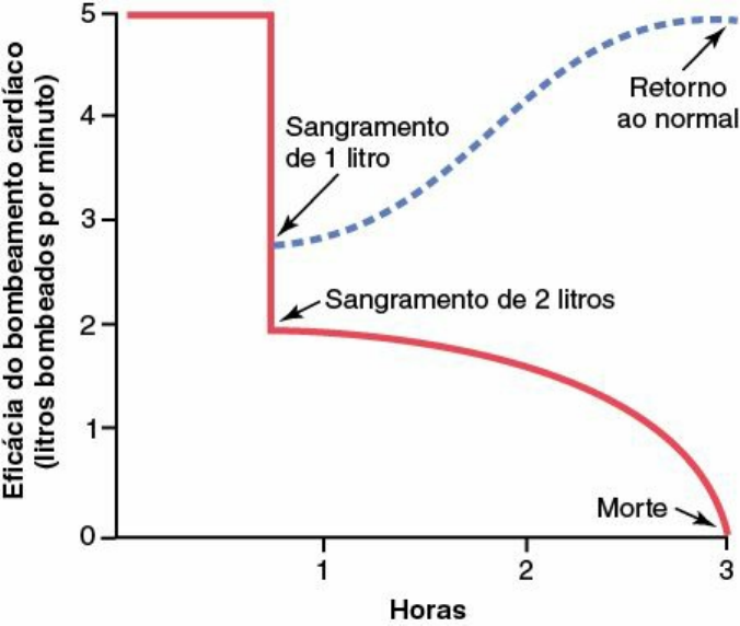Figura 1-4. Recuperação do bombeamento cardíaco causado por feedback negativo após remoção de 1 litro de sangue da circulação. A morte é causada por feedback positivo quando 2 litros de sangue são removidos. O Feedback Positivo Pode, Às Vezes, Ser Útil. Em alguns casos, o corpo usa o feedback positivo em seu favor. A coagulação sanguínea é exemplo de uso útil do feedback positivo. Quando um vaso sanguíneo se rompe e começa a se formar um coágulo, múltiplas enzimas, chamadas fatores de coagulação, são ativadas no interior do próprio coágulo. Algumas dessas enzimas agem sobre outras enzimas inativas no sangue imediatamente adjacente, causando, assim, mais coagulação sanguínea. Esse processo continua até que o orifício no vaso seja fechado, e o sangramento cesse. Ocasionalmente, esse mecanismo pode sair do controle e causar a formação de coágulos indesejados. Na verdade, é isso que inicia a maioria dos ataques cardíacos agudos, que podem ser causados por coágulo que começa na superfície interna de placa aterosclerótica em artéria coronária e cresce até a obstrução dessa artéria.