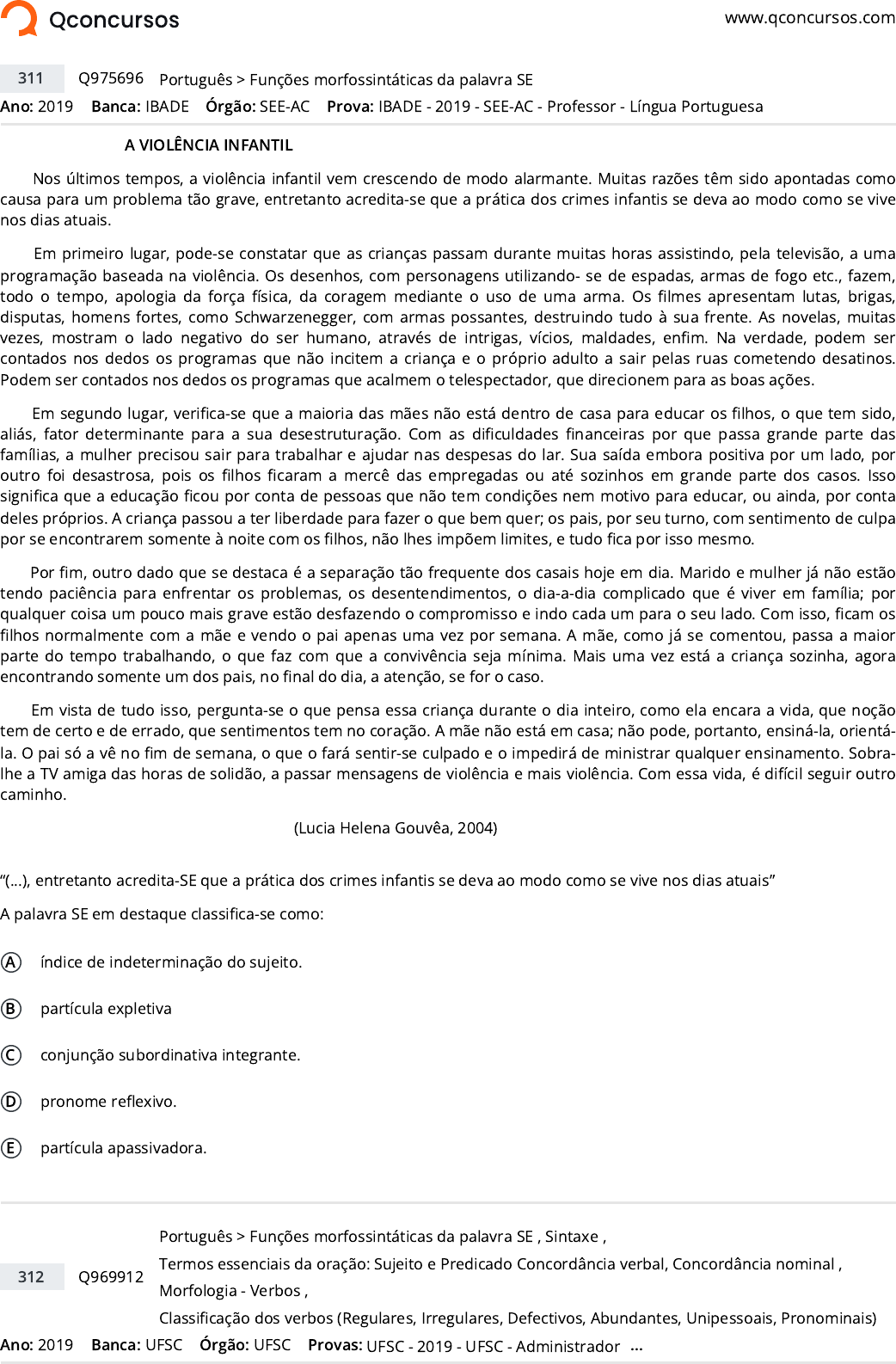 www.qconcursos.com Ano: 2019 Banca: IBADE Órgão: SEE-AC A VIOLÊNCIA INFANTIL Nos últimos tempos, a violência infantil vem crescendo de modo alarmante. Muitas razões têm sido apontadas como causa para um problema tão grave, entretanto acredita-se que a prática dos crimes infantis se deva ao modo como se vive nos dias atuais. Em primeiro lugar, pode-se constatar que as crianças passam durante muitas horas assistindo, pela televisão, a uma programação baseada na violência. Os desenhos, com personagens utilizando- se de espadas, armas de fogo etc., fazem, todo o tempo, apologia da força física, da coragem mediante o uso de uma arma. Os �lmes apresentam lutas, brigas, disputas, homens fortes, como Schwarzenegger, com armas possantes, destruindo tudo à sua frente. As novelas, muitas vezes, mostram o lado negativo do ser humano, através de intrigas, vícios, maldades, en�m. Na verdade, podem ser contados nos dedos os programas que não incitem a criança e o próprio adulto a sair pelas ruas cometendo desatinos. Podem ser contados nos dedos os programas que acalmem o telespectador, que direcionem para as boas ações. Em segundo lugar, veri�ca-se que a maioria das mães não está dentro de casa para educar os �lhos, o que tem sido, aliás, fator determinante para a sua desestruturação. Com as di�culdades �nanceiras por que passa grande parte das famílias, a mulher precisou sair para trabalhar e ajudar nas despesas do lar. Sua saída embora positiva por um lado, por outro foi desastrosa, pois os �lhos �caram a mercê das empregadas ou até sozinhos em grande parte dos casos. Isso signi�ca que a educação �cou por conta de pessoas que não tem condições nem motivo para educar, ou ainda, por conta deles próprios. A criança passou a ter liberdade para fazer o que bem quer; os pais, por seu turno, com sentimento de culpa por se encontrarem somente à noite com os �lhos, não lhes impõem limites, e tudo �ca por isso mesmo. Por �m, outro dado que se destaca é a separação tão frequente dos casais hoje em dia. Marido e mulher já não estão tendo paciência para enfrentar os problemas, os desentendimentos, o dia-a-dia complicado que é viver em família; por qualquer coisa um pouco mais grave estão desfazendo o compromisso e indo cada um para o seu lado. Com isso, �cam os �lhos normalmente com a mãe e vendo o pai apenas uma vez por semana. A mãe, como já se comentou, passa a maior parte do tempo trabalhando, o que faz com que a convivência seja mínima. Mais uma vez está a criança sozinha, agora encontrando somente um dos pais, no �nal do dia, a atenção, se for o caso. Em vista de tudo isso, pergunta-se o que pensa essa criança durante o dia inteiro, como ela encara a vida, que noção tem de certo e de errado, que sentimentos tem no coração. A mãe não está em casa; não pode, portanto, ensiná-la, orientá- la. O pai só a vê no �m de semana, o que o fará sentir-se culpado e o impedirá de ministrar qualquer ensinamento. Sobra- lhe a TV amiga das horas de solidão, a passar mensagens de violência e mais violência. Com essa vida, é difícil seguir outro caminho. (Lucia Helena Gouvêa, 2004) “(...), entretanto acredita-SE que a prática dos crimes infantis se deva ao modo como se vive nos dias atuais” A palavra SE em destaque classi�ca-se como: A índice de indeterminação do sujeito. B partícula expletiva C conjunção subordinativa integrante. D pronome re�exivo. E partícula apassivadora. Ano: 2019 Banca: UFSC Órgão: UFSC 311 Q975696 >Português Funções morfossintáticas da palavra SE Prova: IBADE - 2019 - SEE-AC - Professor - Língua Portuguesa 312 Q969912 >Português Funções morfossintáticas da palavra SE , Sintaxe , Termos essenciais da oração: Sujeito e Predicado Concordância verbal, Concordância nominal , Morfologia - Verbos , Classi�cação dos verbos (Regulares, Irregulares, Defectivos, Abundantes, Unipessoais, Pronominais) Provas: UFSC - 2019 - UFSC - Administrador ... https://www.qconcursos.com/ https://www.qconcursos.com/questoes-de-concursos/bancas/ibade https://www.qconcursos.com/questoes-de-concursos/institutos/see-ac https://www.qconcursos.com/questoes-de-concursos/bancas/ufsc https://www.qconcursos.com/questoes-de-concursos/institutos/ufsc https://www.qconcursos.com/questoes-de-concursos/questoes/cb6779e4-4f https://www.qconcursos.com/questoes-de-concursos/disciplinas/letras-portugues https://www.qconcursos.com/questoes-de-concursos/disciplinas/letras-portugues/funcoes-morfossintaticas-da-palavra-se https://www.qconcursos.com/questoes-de-concursos/provas/ibade-2019-see-ac-professor-lingua-portuguesa https://www.qconcursos.com/questoes-de-concursos/questoes/ad264ff3-3a https://www.qconcursos.com/questoes-de-concursos/disciplinas/letras-portugues https://www.qconcursos.com/questoes-de-concursos/disciplinas/letras-portugues/funcoes-morfossintaticas-da-palavra-se https://www.qconcursos.com/questoes-de-concursos/disciplinas/letras-portugues/sintaxe https://www.qconcursos.com/questoes-de-concursos/disciplinas/letras-portugues/termos-essenciais-da-oracao-sujeito-e-predicado https://www.qconcursos.com/questoes-de-concursos/disciplinas/letras-portugues/concordancia-verbal-concordancia-nominal https://www.qconcursos.com/questoes-de-concursos/disciplinas/letras-portugues/morfologia-verbos https://www.qconcursos.com/questoes-de-concursos/disciplinas/letras-portugues/classificacao-dos-verbos-regulares-irregulares-defectivos-abundantes-unipessoais-pronominais https://www.qconcursos.com/questoes-de-concursos/provas/ufsc-2019-ufsc-administrador De acordo com o texto 3 e com a norma padrão escrita, é correto a�rmar que: A o verbo ‘dizer’ em “Digo-te que você...” (linha 7) está empregado como impessoal. B a forma verbal ‘disseram’ (linha 1) está �exionada na terceira pessoa do plural, marcando o sujeito como indeterminado. C na sentença “Se você prefere falar errado...”