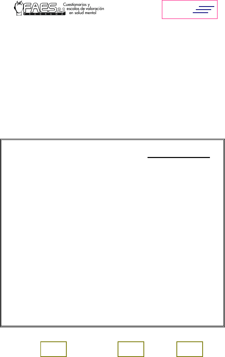 BAI Identificación .................................................................................. Fecha ..................... Indique para cada uno de los siguientes síntomas el grado en que se ha visto afectado por cada uno de ellos durante la última semana y en el momento actual. Elija de entre las siguientes opciones la que mejor se corresponda: 0 = en absoluto 1 = Levemente, no me molesta mucho 2 = Moderadamente, fue muy desagradable, pero podía soportarlo 3 = Severamente, casi no podía soportarlo 0 1 2 3 1. Hormigueo o entumecimiento ................................... ! ! ! ! 2. Sensación de calor ..................................................... ! ! ! ! 3. Temblor de piernas .................................................... ! ! ! ! 4. Incapacidad de relajarse ............................................ ! ! ! ! 5. Miedo a que suceda lo peor ....................................... ! ! ! ! 6. Mareo o aturdimiento ................................................ ! ! ! ! 7. Palpitaciones o taquicardia ........................................ ! ! ! ! 8. Sensación de inestabilidad e inseguridad física ......... ! ! ! ! 9. Terrores ...................................................................... ! ! ! ! 10. Nerviosismo ............................................................. ! ! ! ! 11. Sensación de ahogo .................................................. ! ! ! ! 12.Temblores de manos ................................................. ! ! ! ! 13. Temblor generalizado o estremecimiento ............... ! ! ! ! 14. Miedo a perder el control ........................................ ! ! ! ! 15. Dificultad para respirar ........................................... ! ! ! ! 16. Miedo a morirse ...................................................... ! ! ! ! 17. Sobresaltos .............................................................. ! ! ! ! 18. Molestias digestivas o abdominales ........................ ! ! ! ! 19. Palidez ..................................................................... ! ! ! ! 20. Rubor facial ............................................................. ! ! ! ! 21. Sudoración (no debida al calor) .............................. ! ! ! ! TOTAL: A.F. A.S.