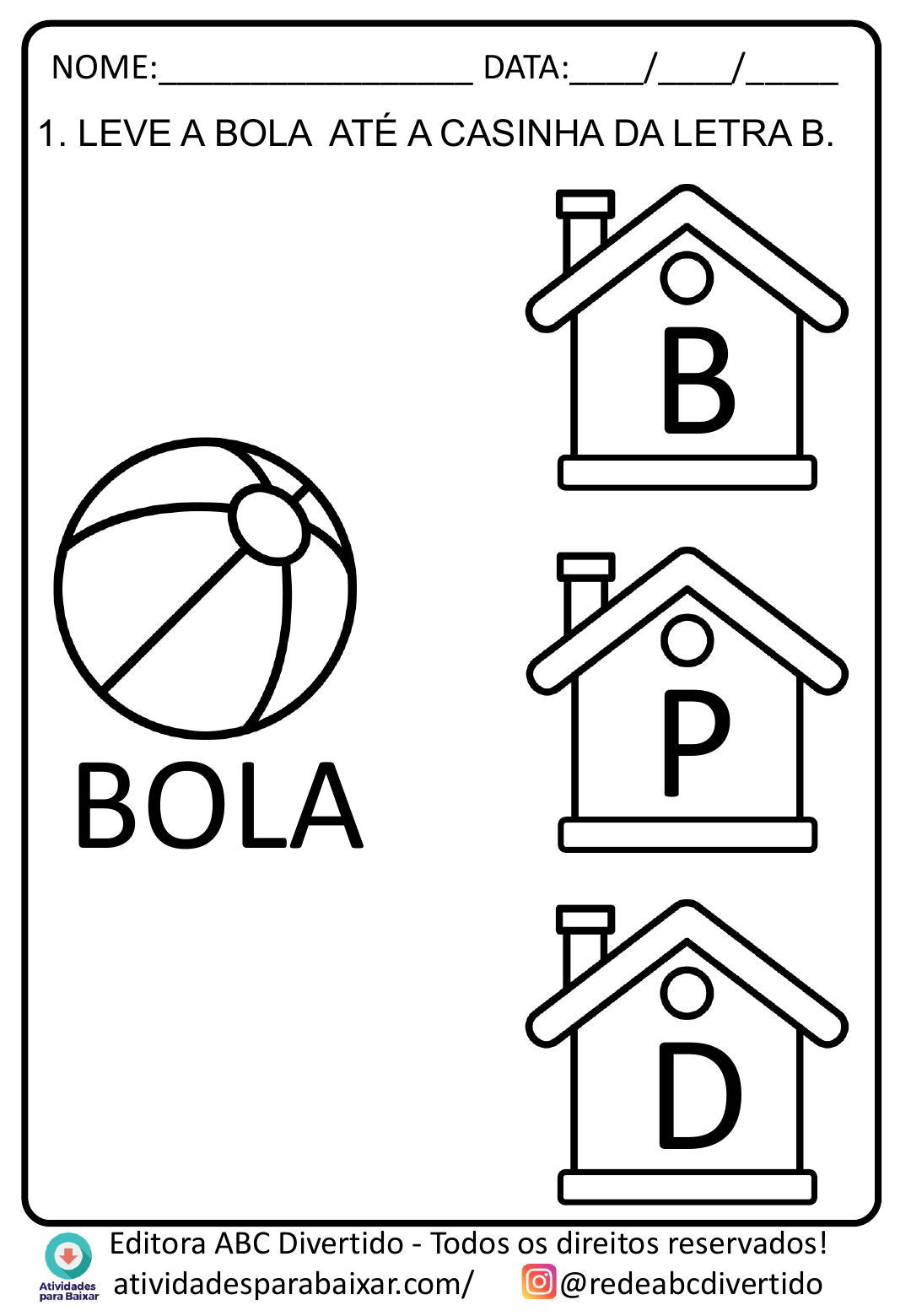 1. LEVE A BOLA ATÉ A CASINHA DA LETRA B. NOME:_________________ DATA:____/____/_____ B P D Editora ABC Divertido - Todos os direitos reservados! atividadesparabaixar.com/ @redeabcdivertido BOLA 2 https://www.abcdivertido.com/atividades-interativas Slide 2