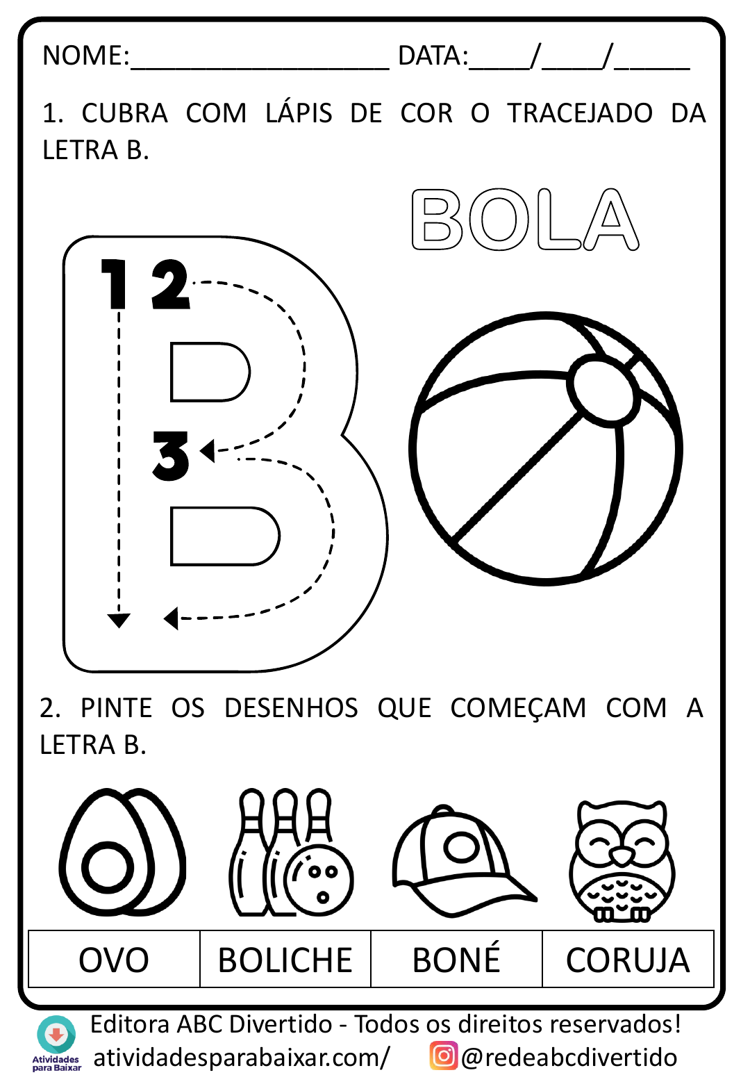 1. CUBRA COM LÁPIS DE COR O TRACEJADO DA LETRA B. 2. PINTE OS DESENHOS QUE COMEÇAM COM A LETRA B. NOME:_________________ DATA:____/____/_____ OVO BOLICHE BONÉ CORUJA Editora ABC Divertido - Todos os direitos reservados! atividadesparabaixar.com/ @redeabcdivertido 3 https://www.abcdivertido.com/atividades-interativas Slide 3