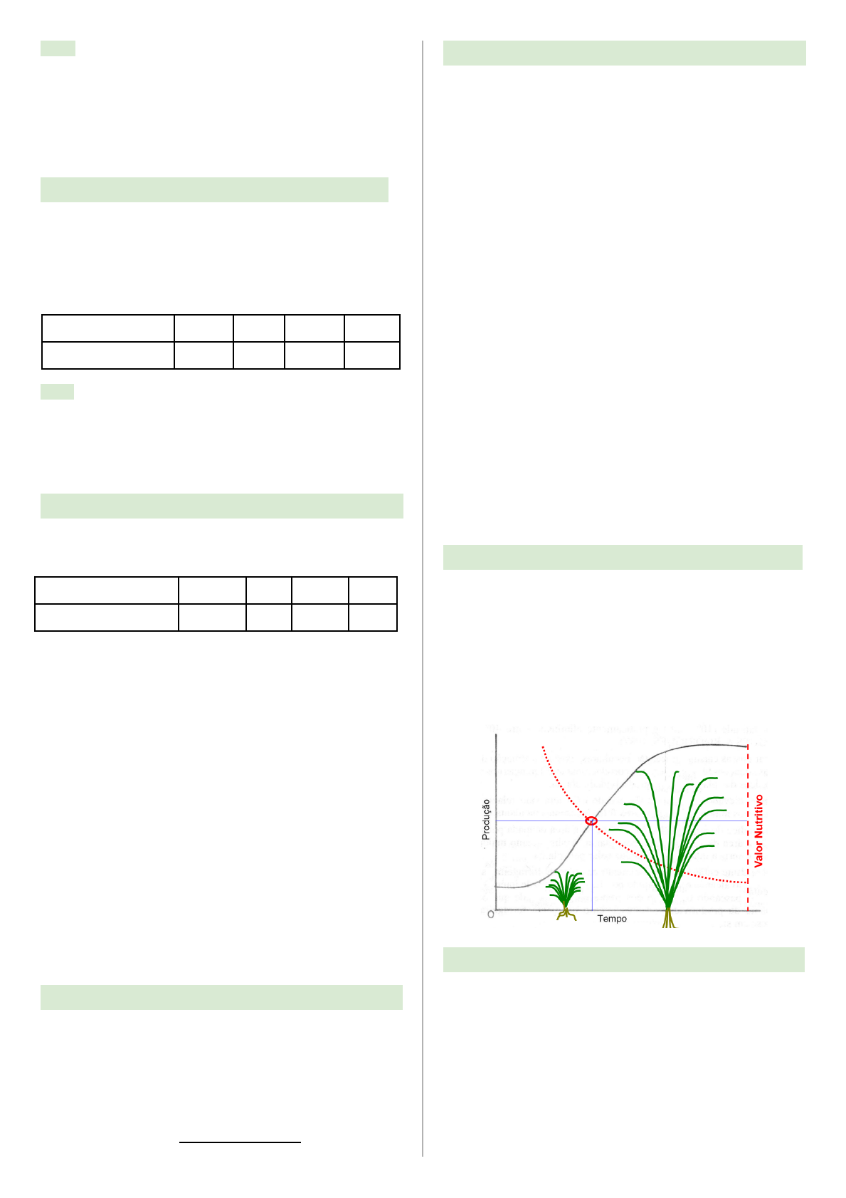 OBS: o Cynodon coast cross, tifton e a estrela tem alto rendimento, mas tem propagação por mudas. É preferível a semente, pois a muda é mais cara e demanda mais trabalho ◼ Tifton: melhor forragem para cavalo, pois não causa problemas, mas como é muda, nem sempre é oferecido PENNISCEFUM . ► Capim-elefante e Capiaçu ◼ Hábito de crescimento: ereto e cespitoso ◼ Produtividade: alta, mas exige adubação ◼ Forma de propagação: muda ◼ Inflorescência: panícula Obs: o Capim-Elefante é mais utilizado para capineiras, isso é, quando o animal está doente, é necessário cortar e triturar a forragem antes de oferecer para o animal. Ele é mais utilizada, pois o seu tamanho facilita o corte PASPALUM . ► Andropogon gayanus Ideal para solos pedregosos 2. Métodos de Implantação de Pastagem Para ter uma pastagem satisfatória, devemos nos atentar com a espécie, manejo e clima. ◼ Espécie inadequada: pastagens de baixa qualidade nutricional e baixa resistência as condições adversas, como clima e solo ◼ Mau manejo: diminui a produtividade da planta, como exemplo temos excesso de pastejo, falta de adubação ou ausência de rotação de pastagens. ◼ Ausência de correções do solo: a falta de calagem e adubação compromete a fertilidade e limita o crescimento das plantas forrageiras. ◼ Ataque de pragas e doenças ◼ Implantação mal feita: falta de umidade adequada, sementes de baixa qualidade ou densidade de semeadura inadequada. QUALIDADE DA SEMENTE . Verificar a procedência dos fornecedores. A qualidade é descrita pelo Valor Cultural, onde a pureza se refere ao percentual de sementes e a germinação ao percentual de sementes puras que germinam. 𝑉𝐶 = % 𝐺𝑒𝑟𝑚𝑖𝑛𝑎çã𝑜 . % 𝑃𝑢𝑟𝑒𝑧𝑎100 ÉPOCA DE PLANTIO . A época de plantio de pastagens é bastante ampla, ela varia entre setembro e março, porém alguns fatores que levam os produtores a plantarem em diferentes épocas. O importante é estabelecer o maior número de plantas por m2 para diminuir invasoras e erosão do solo ◼ Preparo de solo: necessário cerca de 6 meses para preparo do solo, mas muitos não preparam o solo no tempo hábil e fazem plantios tardios ◼ Falta de sementes na época adequada ◼ Falta de mão-de-obra e equipamentos: está ligado a outras atividades da fazenda, muitos produtores se dedicam a agricultura, além da criação de boi, e utilizam o mesmo maquinário para plantio da lavoura e da pastagem. ◼ Limitações financeiras ◼ Temperatura e luz - fotoperíodo C4: o ideal é manter a forragem em 21 °C e com fotoperíodo adequado, por isso, cresce mais no verão. As forragens possuem metabolismo mais acelerado no calor e mais lento no frio, abaixo de 10º o metabolismo é quase nulo e acima de 30º também há declínio de crescimento, lembrando que precisa ocorrer em um período longo para prejudicar. PONTO ÓTIMO . O ponto ótimo para corte é quando as plantas atingem uma altura que garante a qualidade nutricional e a produtividade. O gado deve ser inserido para pastejar ou corte ◼ Coast cross: 17-20 dias ◼ Braquiarão: 20-25 dias ◼ Tanzânia: 25-27 dias MÉTODO DE PLANTIO . ➤ Convencional ◼ Aração: utiliza-se um trator equipado com um arado de discos pesados que revira e quebra o solo, a fim de facilitar a penetração das raízes das plantas. ◼ Gradagem: grade de dentes nivela e desfaz torrões de terra, deixando o solo mais uniforme e fofo. Forrageira FP PR CS MD Capim-Elefante Muda Alta Regular Ruim Forrageira FP PR CS MD Andropogon gayanus Semente Alta Regular Ruim
