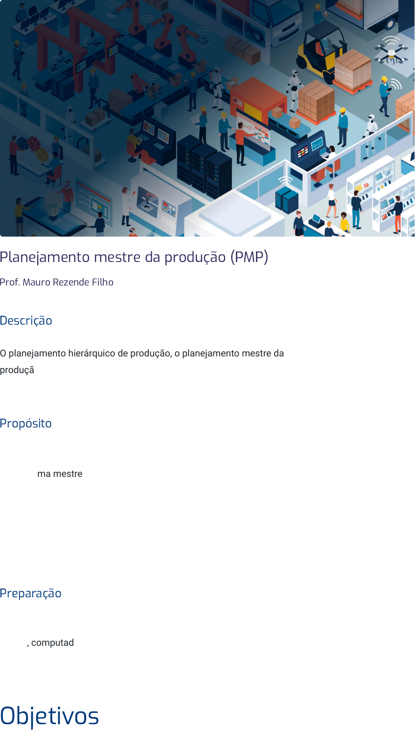 Planejamento mestre da produção (PMP) Prof. Mauro Rezende Filho Descrição O planejamento hierárquico de produção, o planejamento mestre da produção (PMP) e as políticas e restrições de produção e estoque no PMP. Propósito Conhecer o processo de planejamento mestre de produção (PMP) ou cronograma mestre de produção (MPS) é de extrema importância para o profissional, pois permite construir uma declaração dos planos produtivos da empresa. Com isso, é feito um contrato entre o departamento de vendas e o departamento de fabricação que equilibra oferta e demanda, definindo as quantidades necessárias para produzir e os prazos de produção. Preparação Antes de iniciar seus estudos, certifique-se de ter à sua disposição papel e lápis, computador com o software Excel, de modo que possa replicar o conteúdo e o exercício que serão apresentados. Objetivos Módulo 1 Planejamento hierárquico de produção Reconhecer o processo de planejamento hierárquico de produção. Módulo 2 De�nição do planejamento mestre da produção (PMP) Reconhecer o processo de planejamento mestre da produção (PMP). Módulo 3 Políticas e restrições de produção e estoque no PMP Identificar as políticas e restrições de produção e estoque no PMP. Introdução Para começar seus estudos, assista ao vídeo a seguir e conheça os aspectos fundamentais do planejamento mestre da produção. 1 - Planejamento hierárquico de produção Ao �nal deste módulo, você será capaz de reconhecer o processo de planejamento hierárquico de produção. Vamos começar! Reconhecendo o processo de planejamento hierárquico da produção Assista o vídeo a seguir e conheça alguns conceitos iniciais sobre o planejamento hierárquico da produção. Uma abordagem geral de desagregação No ambiente de produção, o planejamento operacional hierárquico é denominado “planejamento hierárquico da produção (HPP)”. Caracteriza-se pelo uso da metodologia de planejamento agregado, um processo que define os níveis de capacidade, produção, subcontratação, estoque, falta e até preço em determinado período. Seu objetivo é atender à demanda e maximizar os lucros. Assim, o processo de tomada de decisão é separado em intervalos de tempo e um responsável é designado para cada intervalo de tempo. No entanto, essa simplificação é afetada por fatores humanos, uma vez que os indivíduos não necessariamente tomam decisões estritamente racionais. Dependendo do contexto, eles fazem julgamentos tendenciosos na tentativa de encurtar o processo de tomada de decisão. O planejamento da produção pode ser definido simplesmente como a determinação das necessidades de capacidade de acordo com as estimativas da demanda e dos gargalos existentes. Uma visão mais detalhada propõe a divisão das decisões de produção em três dimensões: Planejamento de operações produtivas, relacionadas a previsões, localização e dimensionamento da planta, planejamento e projeto de produto, planejamento e projeto d l j Dentre essas três dimensões, a organização das operações produtivas e a direção e controle das operações produtivas são as que mais se relacionam com as definições de planejamento e programação da produção. No contexto do planejamento hierárquico da produção, a questão da estabilidade é uma abordagem de desagregação em dois níveis em ambiente de manufatura discreta. São elas: S&OP (Sales and Operation Planning – planejamento de vendas e operações) É aquele que determina os volumes das famílias por macroperíodos em vários planos correspondentes a itens acabados por macroperíodos. de processo, planejamento e projeto de planta e planejamento e projeto de trabalho. Organização das operações produtivas, intimamente associadas à programação das operações e logística. Gestão e controle das operações produtivas, que se relacionam com o estabelecimento de metas de qualidade e custos. MPS (mestre de produção) É aquele que é abordado com uma heurística simples para suavizar as quantidades de itens de produção dentro dos microperíodos. Conheça-os melhor a seguir. Planejamento de vendas e operações (S&OP) O planejamento de vendas e operações (Sales and Operation Planning - S&OP) é um processo para combinar melhor a oferta de um fabricante com a demanda, fazendo com que o departamento de vendas colabore com as operações para criar um plano de produção único. O objetivo mais amplo é alinhar as operações diárias com a estratégia corporativa. Comentário Na prática, outros departamentos intimamente envolvidos nos lados da demanda e oferta da equação normalmente participam do S&OP, incluindo marketing, compras, fabricação, transporte e finanças. O S&OP consiste em várias etapas, geralmente realizadas em reuniões mensais. Os nomes e números das etapas do processo de planejamento de cada empresa variam, mas todas têm o seguinte em comum, na ordem: Coleta de dados Coleta de previsões existentes e informações sobre variáveis- chave, como estoque, vendas recentes e dinheiro em caixa. Planejamento de demanda Processos para analisar, prever e influenciar a demanda, incluindo detecção de demanda e modelagem de demanda. Além de melhorar a precisão das previsões, o S&OP pode reduzir os custos de estoque, o que, por sua vez, pode aumentar o capital de giro ao comprometer menos dinheiro no estoque. O S&OP também pode aumentar a receita e a participação de mercado, melhorando a eficácia de novos produtos e iniciativas de marketing. Atenção! As melhores taxas de entrega no prazo possibilitadas pelo S&OP podem levar ao aumento da satisfação do cliente e aos benefícios adicionais que daí advêm, como vendas mais altas. Melhor visibilidade dos dados de vendas, marketing, operações e finanças é outro benefício divulgado pelos proponentes do S&OP. Além disso, o uso de software especializado de S&OP para automatizar o proc