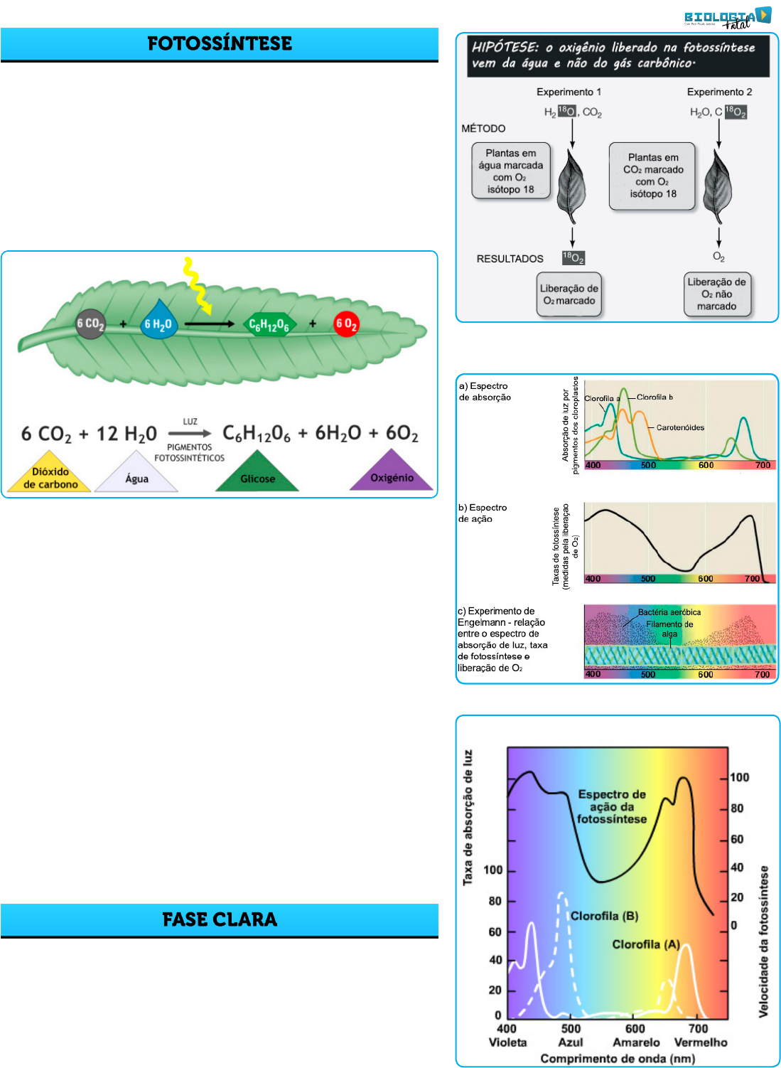 38 O Sol é a fonte de toda energia da biosfera. A fotossíntese é o processo pelo qual a energia luminosa é captada e convertida em energia química. A fotossíntese pode ser realizada tanto por organismos procariontes, como por eucariontes. Mais da metade de toda a fotossíntese da biosfera ocorre nos seres unicelulares, particularmente nas algas, que formam o fitoplâncton. Todos os seres fotossintetizantes, exceto algumas bactérias, utilizam a água como fonte de hidrogênio para produção de glicose. A equação geral para o processo é: Esta equação indica que o organismo fotossintetizante utiliza o CO2 (gás carbônico) e a H2O (água), absorve energia luminosa por meio da clorofila (pigmento fotossintetizante) e produz glicose (açúcar) e O2 (gás oxigênio). Na fotossíntese dos vegetais e das algas, a água (H2O) é a fonte de hidrogênio e do gás oxigênio; e na fotossíntese das bactérias, a fonte de hidrogênio é o H2S (gás sulfídrico), mas neste caso não ocorre liberação de oxigênio, e sim de sulfeto (S2), por isso essas bactérias são chamadas de sulfobactérias Experimentos utilizando água (H2O) e gás carbônico (CO2), marcados com oxigênio isótopo 18 demonstram que a origem do gás oxigênio é a molécula de água e não o gás carbônico (CO2). PIGMENTOS FOTOSSINTETIZANTES Os pigmentos são substâncias que absorvem luz. A cor de um pigmento depende das faixas do espectro da luz visível que ele absorve ou reflete. A clorofila é verde; além das clorofilas, os carotenóides são pigmentos que absorvem luz em comprimentos de onda diferentes da clorofila. Estes pigmentos transferem energia luminosa para a clorofila. Além da clorofila e dos carotenóides, outros pigmentos podem também participar do processo de fotossíntese, como a xantofila (amarelo), a eritrofila (vermelho) e outros. A etapa fotoquímica também é chamada de fase clara da fotossíntese, uma vez que dependente da luz para que as reações ocorram. Nesta etapa, as moléculas de clorofila, iluminadas, perdem elétrons, pois estes absorvem a energia luminosa do sol. O destino dos elétrons perdidos e a ocupação dos “vazios” nas moléculas de clorofila obedecem a dois mecanismos: Bioquímica Experiência com planta aquática e isotopo radioativo do oxigênio. Com base no experimento acima sabe-se que o oxigênio liberado na fotossíntese vem da água e não do gás carbônico. Experiência que revelou em que espectros da luz funcionam a fotossíntese. O Espectro de Absorção de Luz pela Clorofila As clorofilas “a” e “b” apresentam espectros diferentes da absorção de luz, sendo a absorção maior nas faixas do violeta-azul e alaranjado-vermelho e menor na faixa do verde. 39 A etapa química também é conhecida por fase escura da fotossíntese, pois não é dependente da energia da luz. A energia necessária às reações de escuro provém das moléculas de ATP produzidas na fase de claro e do hidrogênio recolhidos pelo NADPH2. Pode, é claro, ocorrer na presença da luz. A energia assimilada na fase clara é empregada para incorporar átomos de carbono em moléculas orgânicas (como a glicose), produzindo substâncias mais apropriadas para o consumo, o armazenamento e o transporte. A incorporação do carbono ocorre em uma seqüência cíclica de reações, o ciclo de Calvin ou ciclo das pentoses. As reações da fase escura se processam no estroma dos cloroplastos. Ao longo da evolução dos vegetais terrestres, surgiram 3 comportamentos diferentes que os mesmos apresentaram em relação ao modo de fixação de carbono e à perda de água, um recurso importantíssimo. Esses 3 tipos de vegetais são chamados de C3, C4 e CAM. A intensidade com a qual uma célula executa a fotossíntese pode ser avaliada por certos parâmetros que, variando, fazem variar a intensidade do processo. São os fatores limitantes da fotossíntese. O “princípio de Blackman” afirma que “quando um processo metabólico é influenciado por vários fatores, que atuam isoladamente, a velocidade do processo é limitada pelo fator de menor intensidade”. A. Fatores limitantes internos – dizem respeito à estrutura da planta: 1) Disponibilidade de pigmentos fotossintetizantes: como a clorofila é a responsável pela captação da energia luminosa, a sua falta restringe a intensidade da fotossíntese. 2) Disponibilidade de enzimas e de co-fatores: todas as reações fotossintéticas envolvem a participação de enzimas ou de co-fatores transportadores de elétrons, que devem existir em quantidade suficiente. 3) Os cloroplastos: são as organelas onde ocorrem as reações da fotossíntese. Quanto maior o número de cloroplastos, maior a eficiência do processo. Na respiração, as mitocôndrias são quem comandam. Já na fotossíntese o protagonismo fica por conta dos cloroplastos. Nos tilacoides acontece a etapa fotoquímica e no estroma do cloroplasto a fase química. Os fotossistemas II (P680) e I (P700) recebem a luz e transferem os elétrons através da membrana do tilacoide. A fotofosforilação cíclica acontece somente com a participação do fotossistema I (P700). Já a fotofosforilação acíclica funciona como representado na figura. Ciclo de Calvin e a produção de glicose em um cloroplasto. Fotossíntese 40 B. Fatores limitantes externos – dizem respeito às condições do ambiente: 1) Concentração de CO2 no ar: o dióxido de carbono é o substrato da etapa química da fotossíntese. Conforme aumenta a quantidade de gás carbônico disponível, aumenta a velocidade das reações. A elevação não é ilimitada, pois quando todo o sistema enzimático existente já tiver substrato (CO2) suficiente para agir, a concentração de CO2 deixa de ser fator limitante. 2) Temperatura: na etapa química, todas as reações são catalisadas por enzimas, e estas têm sua atividade influenciada pela temperatura. Em temperaturas elevadas, começa a ocorrer desnaturação enzimática e perd