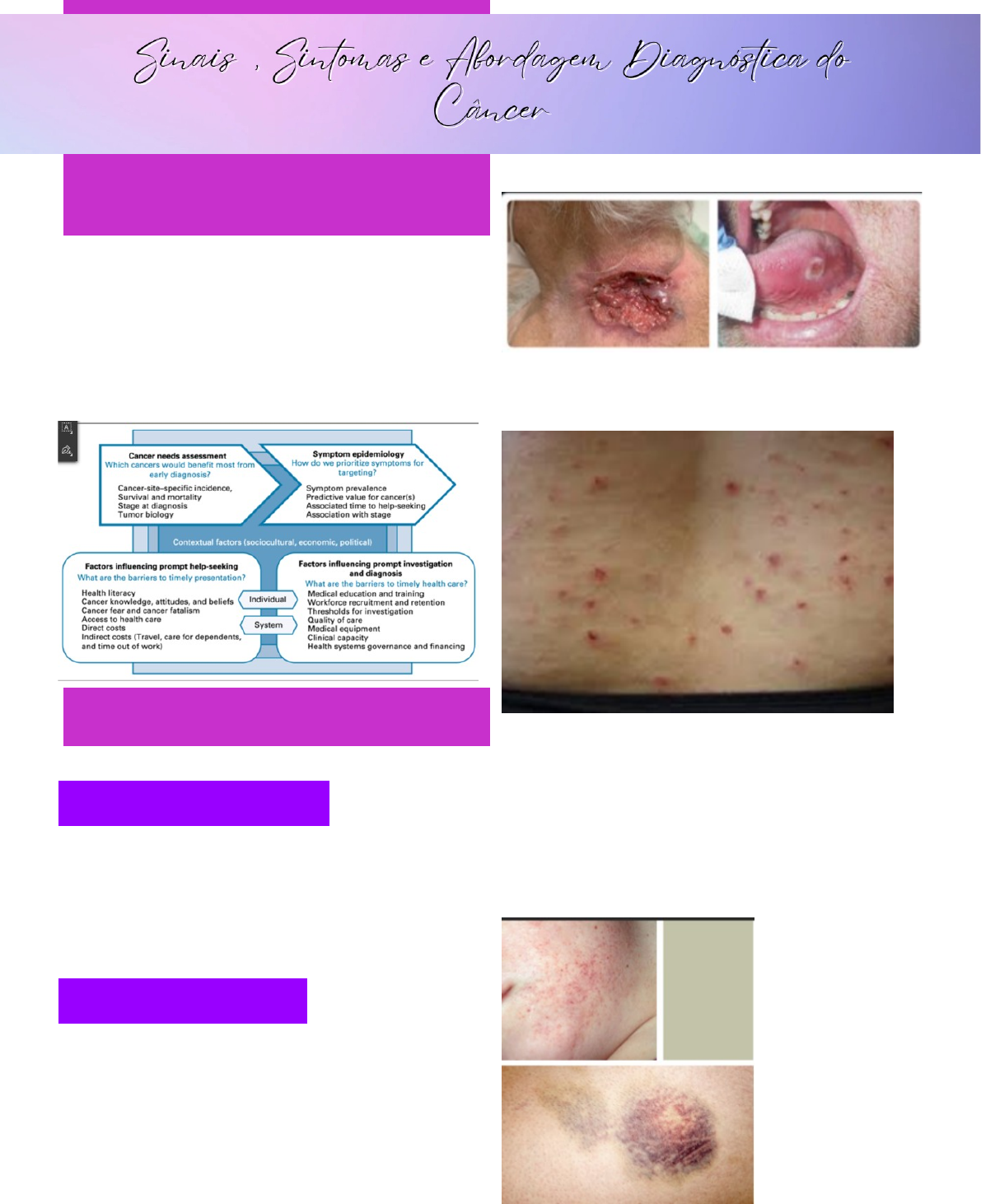 Sandy Vanessa Med 08 - UFPE-CAA Introdução · O diagnóstico sintomático precoce do câncer é uma estratégia custo-efetiva e com impacto na melhora do prognóstico da doença e da experiência do paciente · Os programas de diagnóstico precoce consistem em garantir uma rápida entrada do paciente com suspeita da doença no sistema de saúde, garantindo acesso ao diagnóstico e tto oportunos Sinais e Sintomas Constitucionais · Diminuição do apetite · Perda de peso ñ intencional · Fadiga persistente · Sudorese noturna profusa · Palidez (anemia) Pele e mucosas · Equimoses inexplicadas · Palidez · Principalmente nas sólidas e que sangram muito → TGU, TGI · Úlceras que não cicatrizam ao longo de 3 semanas · Mucosa oral · Carcinoma basically → aspecto perolado →comportamento benigno → fez cirurgia tá tudo certo! · Prurido → difícil manejo · Repercute muito na qualidade de vida do pct · Linfoma de hodgkin → continuo e generalizado · Nevos · Manobra de zilerim p/diferir de pitiríase vesicolor · Petéquias e púrpuras espontâneas · Plaquetopenia → infiltração de medula óssea · Metástase → próstata, pulmão de pequenas células · Fazer biópsia, mielograma · ABCDE dos tumores de pele e das lesões elementares · Quanto mais profundo mais chance de acometimento linfonodal → >/= de 1mm · Alterações ungueais · Acantose nigricans → Sd paraneoplásica!!! · Surgimento recente, sem DM ou obesidade → questionar se não é neoplasia · Pulmão e TGI · Eritema garatum → Sd paraneoplásica → muita relação com tumores de pulmão · Pênfigo → neoplasia hematológica · Dermatopolimiosite → Neoplasia de pulmão, intestino, mama · Só faço os rastreios se o paciente tem sintomas ou está em idade propícia Cabeça e pescoço · Rouquidão · Nódulos de crescimento progressivo · Linfonodomegalia indolor, aderidas aos planos profundos · Nariz → epistaxe recorrente, sem sinusite ou outras explicações como ma formações arteriovenosas · Úlceras que não cicatrizam após 3 semanas · Diplopia por acometimento de par craniano SNC · Cefaleia progressiva/matinal · Piora com tosse · Déficits neurológicos focais, progressivos e subagudos · Crises convulsivas Sistema respiratório · Tosse persistente · Dispneia · Dor torácica · Rouquidão · Hemoptise · Infecções respiratórias de repetição · Linfadenopatia cervical e supraclavicular · Baqueteamento digital → unhas em dedo de relógio · Síndrome de Horner → destruição do plexo simpático cervical · Patologia torácica que comprimiu o gânglio simpático paravertebral · Miose/anisocoria, ptose e anidrose facial Sistema digestório · Sintomas pouco específicos que geralmente estão associados a doenças benignas · Aumento de volume abdominal → ascite, massas, obstrução intestinal · Icterícia · Hematêmese · Hematoquezia, melena · Dor abdominal · Hepato/esplenomegalia · Disfagia · Dispepsia · Náuseas e vômitos · Alterações do trânsito intestinal · Anemia TGU · Dor em francos ou pelve · Hematospermia · Sangramento genital · Úlceras que não cicatrizam · Hematúria · ITU de repetição · Urgência urinária · Redução do jato urinário/esforço miccional · Vegetações/ massas genitais Sistema musculoesquelético · Dor óssea que piora ao repouso ou com valsalva · Tumores · Fraturas patológicas Sistema hematopoiético · Hepatoesplenomegalia · Sangramentos · Equimoses · Hipertrofia gengival por infiltração por células leucêmicas · Adenomegalias · Palidez e fadiga · Petéquias · Proptose · Dor óssea Necessidade de Referência O que fazer no caso de suspeita de neoplasia? · Muito urgente → até 48h → leucemias, tumores grandes de SNC, hematológicas em geral · Urgente → até 15 dias→ Pulso, dispneia leve anemia crônica · Tempo ideal em diagnóstico e tto → 30 dias · Lembrar da lei dos 60 dias!!!!