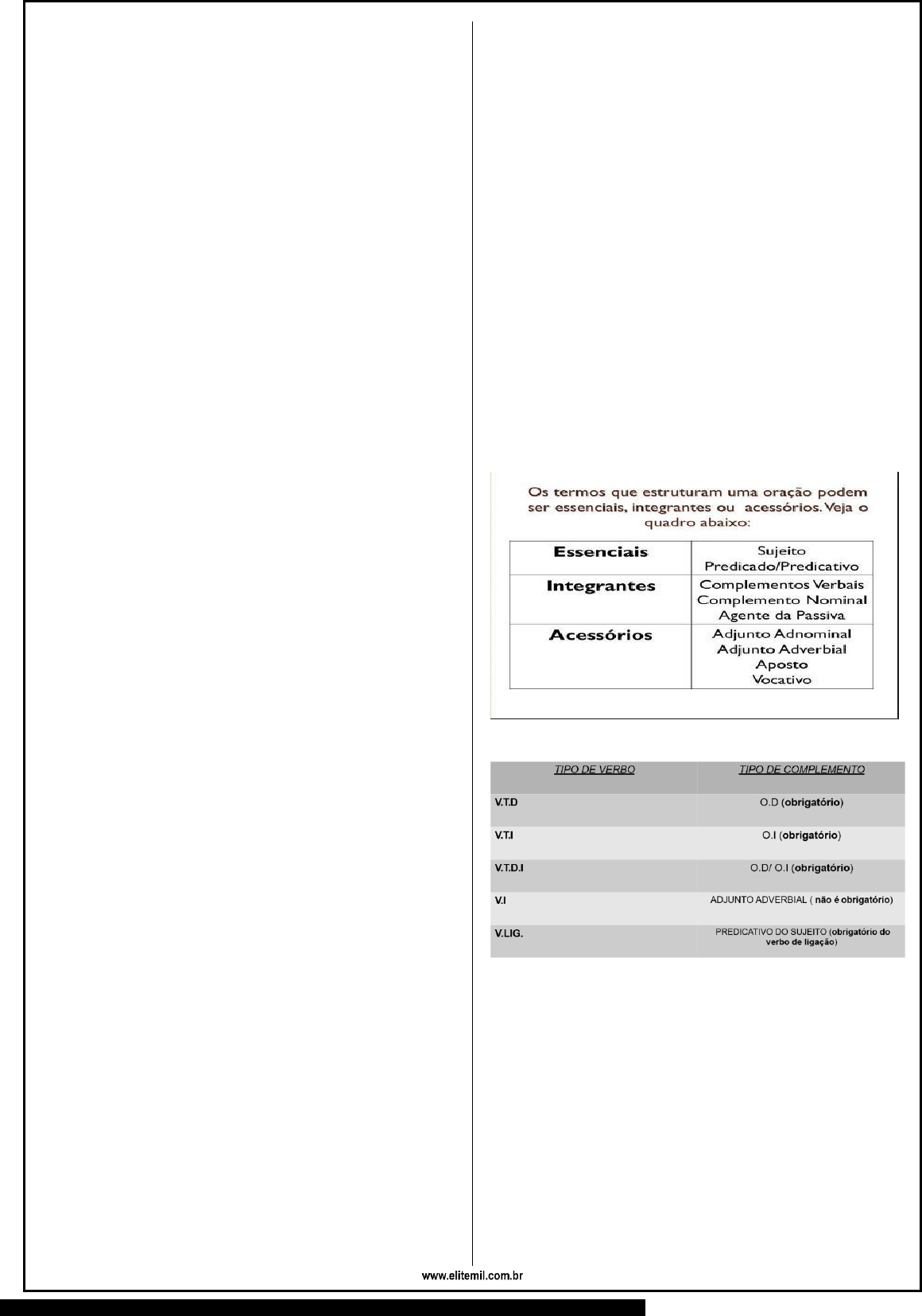 115 > Não é saudável, embora seja delicioso, comer frituras todos os dias. > Viu-se que ela tem grande potencial na música. Urge que se papire contantemente, combatentes! Análise sintática 5. TOPZERAS IMPORTANTES: A posição dos sujeitos; ouviram do Ipiranga as margens plácidas de um povo heroico o brado retumbante... Ordem direta: Quando o sujeito aparece antes do predicado.\ Exemplo: > Os aspiras capinavam despreocupados. Sujeito Predicado Ordem inversa: Quando o sujeito aparece depois do predicado. Exemplo: > Capinavam despreocupados os aspiras. Predicado Sujeito Sujeito no interior do predicado: Quando o sujeito aparece entre o predicado. Exemplo: > Despreocupados, os aspiras capinavam. Predicado Sujeito Predicado Os tipos de sujeitos: Não confundir - Sujeito desinencial com sujeito indeterminados; - Sujeito indeterminado com oração sem sujeito; A transitividade verbal; A transitividade verbal; O centro de atuação, operação e análise sintática perpassa por aqui. - Tipos de sujeito; - Tipos de predicado; - Tipos de objetos; - Necessita-se de operários. - Vive-se bem aqui. - Aqui se é mui feliz, filhotes! OS TIPOS DE PREDICADOS: NOMINAL: HÁ, NESSE TIPO DE PREDICADO, UM VERBO DE LIGAÇÃO E UM NÚCLEO NOMINAL, ISTO É, UMA CARACTERÍSTICA DO SUJEITO (PREDICATIVO DO SUJEITO). - A casinha é bonitinha! - O pato é amarelo! - O prof. Cleyton é um arregaçador! VERBAL: HÁ, NESSE TIPO DE PREDICADO, UM VERBO SIGNIFICATIVO/ NOCIONAL E UM OBJETO (DIRETO OU INDIRETO) APENAS ISSO E NADA MAIS. - Os carros colidiram. - Todos sabemos o motivo. - Os filhotes de cadete compraram um iphone para professor. - Os filhotes de sargento fizeram algo melhor. VERBO-NOMINAL: HÁ, NESSE TIPO DE PREDICADO, UM VERBO SIGNIFICATIVO, UM OBJETO E UM PREDICATIVO (DO SUJEITO OU DO OBJETO). O professor comeu o bolo gostoso. O prof. Cleyton ajudou a aluninha aplicada. A aluna achou a aula topzera. A aspira torava tranquila. RESUMÃO DE TERMOS ORACIONAIS: RESUMÃO DE COMPLEMENTOS VERBAIS: Análise sintática 6. TERMOS LIGADOS A VERBOS: O.D; O.I; [O.D – O.I]; ADJUNTO ADVERBIAL. TERMOS LIGADOS A... NOMES: ADJUNTO ADNOMINAL/ PREDICATIVO/ COMPLEMENTO NOMINAL/ APOSTO/ http://www.elitemil.com.br/ 116 VOCATIVO. RELAÇÃO DE TERMOS DO VERBO COMPLEMENTO NOMINAL É o termo da oração que se liga a um nome sempre por meio de preposição obrigatória, a fim de completar-lhe o sentido. Podemos dizer que o complemento nominal é o objeto do nome transitivo PREDICATIVO É o termo da oração que se refere a um nome sempre por meio do verbo (de ligação ou não), a fim de caracterizá-lo. ADJUNTO ADNOMINAL É o termo da oração que se liga a um nome, sem mediação de verbo afim de determiná-lo ou caracterizá-lo. Aposto O aposto é o termo da oração que se refere a um nome com função de explicá-lo, esclarecê-lo, identificá-lo. Normalmente, o aposto vem separado por vírgulas. http://www.elitemil.com.br/ 117 VOCATIVO Constitui um termo independente da oração por não se articular a nenhum outro. Portanto, o vocativo não se refere ao sujeito, nem ao predicado. Trata-se de um chamamento, direcionado ao ouvinte da frase. Esse termo vem sempre isolado por sinais de pontuação. Análise sintática 7. OBJETO DIRETO X SUJEITO Essa diferença pode ser “meio coisada” porque as provas trabalham o sujeito posposto [depois do verbo], para dar a impressão de que se trata de um objeto ou sujeito. Assim, a distinção entre objeto direto e sujeito, saiba que o objeto direto pode ser passado para a voz passiva (analítica), tornando-se sujeito. OBSERVE: Já chegou o disco voador. (sujeito) Ignoraram o disco voador. (objeto direto) COMPLEMENTO NOMINAL X OBJETO INDIRETO A diferença reside numa razão muito simples: Enquanto o CN é exigido por um nome, o OI é exigido por um VTI ou VTDI. “Óia” como é fácil: Crer em Deus é importante. (OI) A crença em Deus é importante. (CN) O prof. Cleyton necessita de atenção. (OI) O prof. Cleyton tem necessidade de atenção. (CN) AGENTE DA PASSIVA X COMPLEMENTO NOMINAL Ora, ora, a diferença é mucho, mucho simples, muchachas e muchachos!! Observe > Se for possível passar a frase da passiva para a ativa, mantendo o significado, achará a resposta a sua dúvida. O aspira foi apaixonado pela aspira. (CN) = A aspira apaixonou o aspira? O aspira foi assediado pela aspira. (AGP) = a aspira assediou o aspira. OBSERVE: As casas foram cobertas de sujeira. CN ou AGP? “Sujeira cobriu as casaas.” portanto… É AGP, visse? ADJUNTO ADNOMINAL X AGENTE DA PASSIVA PERGUNTO: Aspiras, só porque o termo começa por preposição tem de ser CN? NÃÃÃÃÃÃÃO!!!!!! @3$5& Nem todo termo iniciado pela preposição por é um agente da passiva, portanto não confunda adjunto adnominal com agente da passiva. Veja: Arregaçada pelo Mengão, a equipe do Vasco arrumou confusão. (agente da passiva) O arregaçamento do Vasco pelo Mengão desnorteou os vascaínos. (adjunto adnominal) PERCEBA QUE os DOIS termos têm valor agente, mas o agente da passiva vem ligado a um verbo no particípio, já o adjunto adnominal modifica um substantivo, MOLEZINHA? ADJUNTO ADNOMINAL X COMPLEMENTO NOMINAL Se o termo preposicionado estiver próximo/ligado um adjetivo ou advérbio que eu faço, Raymundão? Relaxaaaaaaaa, @#$&!!!! Agora, quando o termo preposicionado pela preposição de estiver ligado a um substantivo abstrato, aqui é onde que nascem os fortes! VAMOS ÀS DICAS TOPZERAS, COMBATENTES! TOPZERA NO. 1: *Será sempre CN a expressão ligada a substantivo abstrato antecedida de qualquer preposição, exceto a preposição “de”. Farei uma menção a vocês sempre. Tenho muito amor pelo meus alunos! Nossa fé em Deus é pela sua aprovação! TOPZERA NO. 2: *Será sempre ADJ. ADN. se a expressão preposicionada estiver ligada a substantivo concreto. Comprei o material de um site famoso. TOPZERA NO. 3: *É comum, muito comum o ADJ. ADN. manter uma relação de posse com o substantivo; a preposi