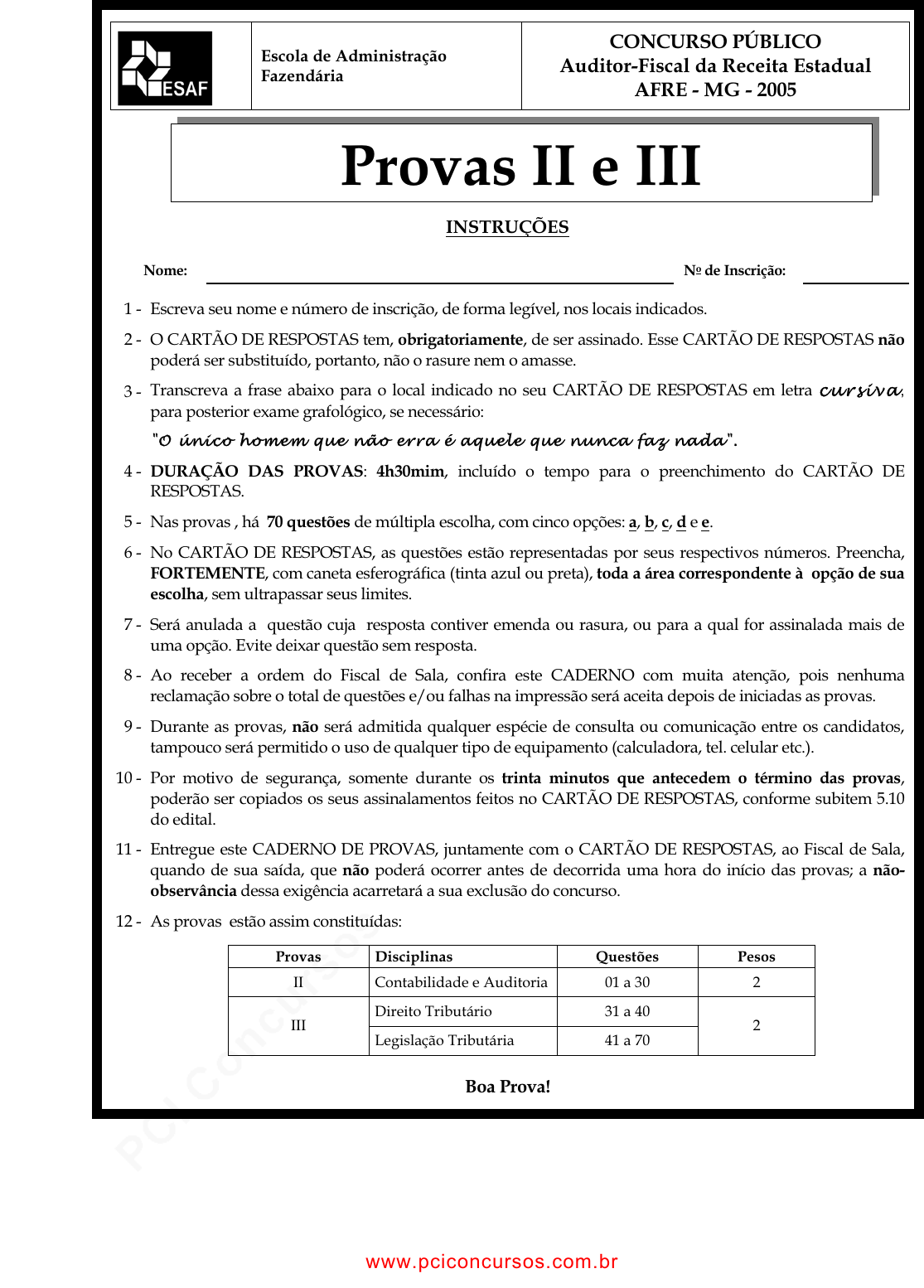 pcimarkpci MjgwNDo0NTAwOjExMzk6YmIwMDoxNWI3OmMzYzI6MTZiMjo0ZDM2:V2VkLCAyOSBOb3YgMjAyMyAxOTozMzoxNiAtMDMwMA== www.pciconcursos.com.br Escola de Administração Fazendária CONCURSO PÚBLICO Auditor-Fiscal da Receita Estadual AFRE - MG - 2005 INSTRUÇÕES Nome: No de Inscrição: 1 - Escreva seu nome e número de inscrição, de forma legível, nos locais indicados. 2 - O CARTÃO DE RESPOSTAS tem, obrigatoriamente, de ser assinado. Esse CARTÃO DE RESPOSTAS não poderá ser substituído, portanto, não o rasure nem o amasse. 3 - Transcreva a frase abaixo para o local indicado no seu CARTÃO DE RESPOSTAS em letra cursiva , para posterior exame grafológico, se necessário: "O único homem que não erra é aquele que nunca faz nada". 4 - DURAÇÃO DAS PROVAS: 4h30mim, incluído o tempo para o preenchimento do CARTÃO DE RESPOSTAS. 5 - Nas provas , há 70 questões de múltipla escolha, com cinco opções: a, b, c, d e e. 6 - No CARTÃO DE RESPOSTAS, as questões estão representadas por seus respectivos números. Preencha, FORTEMENTE, com caneta esferográfica (tinta azul ou preta), toda a área correspondente à opção de sua escolha, sem ultrapassar seus limites. 7 - Será anulada a questão cuja resposta contiver emenda ou rasura, ou para a qual for assinalada mais de uma opção. Evite deixar questão sem resposta. 8 - Ao receber a ordem do Fiscal de Sala, confira este CADERNO com muita atenção, pois nenhuma reclamação sobre o total de questões e/ou falhas na impressão será aceita depois de iniciadas as provas. 9 - Durante as provas, não será admitida qualquer espécie de consulta ou comunicação entre os candidatos, tampouco será permitido o uso de qualquer tipo de equipamento (calculadora, tel. celular etc.). 10 - Por motivo de segurança, somente durante os trinta minutos que antecedem o término das provas, poderão ser copiados os seus assinalamentos feitos no CARTÃO DE RESPOSTAS, conforme subitem 5.10 do edital. 11 - Entregue este CADERNO DE PROVAS, juntamente com o CARTÃO DE RESPOSTAS, ao Fiscal de Sala, quando de sua saída, que não poderá ocorrer antes de decorrida uma hora do início das provas; a não- observância dessa exigência acarretará a sua exclusão do concurso. 12 - As provas estão assim constituídas: Provas Disciplinas Questões Pesos II Contabilidade e Auditoria 01 a 30 2 Direito Tributário 31 a 40 III Legislação Tributária 41 a 70 2 Boa Prova! Provas II e III www.pciconcursos.com.br pcimarkpci MjgwNDo0NTAwOjExMzk6YmIwMDoxNWI3OmMzYzI6MTZiMjo0ZDM2:V2VkLCAyOSBOb3YgMjAyMyAxOTozMzoxNiAtMDMwMA== www.pciconcursos.com.br Auditor-Fiscal da Receita Estadual - AFRE - MG - 2005 Provas II e III 2 CONTABILIDADE: GERAL 01- Assinale a opção que contém afirmativa correta sobre princípios fundamentais de contabilidade. a) Quando se apresentarem opções igualmente aceitá- veis, o princípio da competência impõe a escolha da hipótese de que resulte menor patrimônio líquido. b) Diante de alternativas igualmente válidas, o princípio da competência impõe a adoção do menor valor para o ativo e do maior valor para o passivo. c) As receitas e as despesas devem ser incluídas na apuração do resultado do período em que ocorrerem, segundo afirma o princípio da prudência. d) O reconhecimento simultâneo das receitas e despesas correlatas é conseqüência natural do respeito ao período em que ocorrer sua geração, mas não atende ao princípio da continuidade. e) O princípio da entidade reconhece o patrimônio como objeto da contabilidade e afirma a autonomia patrimonial diferenciando o patrimônio particular no universo dos patrimônios existentes. 02- A listagem de saldos para elaboração dos balanços da Companhia Gama S/A apresentou as contas patrimoniais e de resultado abaixo mencionadas. A eventual diferença aritmética existente decorre da conta corrente de ICMS, cujo encerramento ainda não havia sido contabilizado. Caixa R$ 28.000,00 Capital Social R$ 16.000,00 Compras de Mercadorias R$ 96.000,00 Contas a Receber R$ 39.200,00 COFINS R$ 152,00 Fornecedores R$ 32.000,00 ICMS sobre Vendas R$ 40.800,00 Impostos e Taxas R$ 1.840,00 Juros Ativos R$ 880,00 Mercadorias R$ 36.000,00 Móveis e Utensílios R$ 48.000,00 PIS sobre Faturamento R$ 168,00 Prêmio de Seguros R$ 2.880,00 Reserva Legal R$ 800,00 Salários e Encargos R$ 6.400,00 Salários e Encargos a Pagar R$ 960,00 Vendas de Mercadorias R$240.000,00 Veículos R$ 32.000,00 Observações: 1. O estoque atual de mercadorias está avaliado em R$ 1.600,00. 2. As compras e as vendas são tributadas à mesma alíquota de ICMS. 3. Não houve nenhuma distribuição de lucros no período. As demonstrações contábeis elaboradas a partir das informações anteriormente citadas, certamente, vão evidenciar: a) R$ 130.400,00 de Custo das Mercadorias Vendidas (CMV). b) R$ 85.680,00 de Lucro Operacional Bruto. c) R$ 147.200,00 de Ativo total. d) R$ 32.960,00 de Passivo Circulante. e) R$ 91.360,00 de Patrimônio Líquido. 03- Ao registrar a proposta de destinação dos resultados do exercício, o setor de Contabilidade da empresa deverá contabilizar: a) a formação da reserva legal, a débito da conta de Apuração do Resultado do Exercício. b) a formação da reserva legal, a crédito da conta de Lucros ou Prejuízos Acumulados. c) a distribuição de dividendos, a débito da conta de Lucros ou Prejuízos Acumulados. d) a distribuição de dividendos, a crédito de conta do Patrimônio Líquido. e) a distribuição de dividendos, a débito de conta do Passivo Circulante. 04- Ao efetuar, diretamente da fábrica, uma compra, a prazo, de 200 latas de tinta, de 18 litros cada uma, ao preço unitário de R$ 35,00, sofrendo incidência de IPI a 8% e ICMS a 12%, destinando essa tinta para revender ao preço de R$ 54,00 cada unidade, a empresa deverá lançar a débito da conta estoques de mercadorias o valor de a) R$ 7.560,00 b) R$ 7.000,00 c) R$ 6.720,00 d) R$ 6.652,80 e) R$ 6.160,00 www.pciconcursos.com