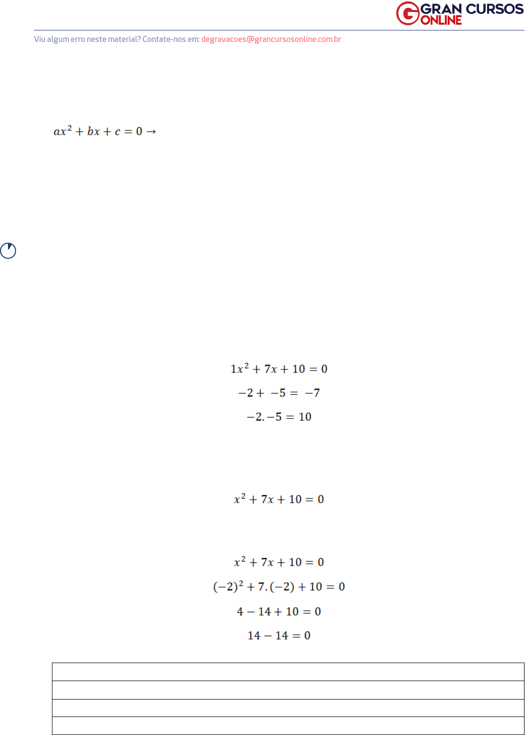 1www.grancursosonline.com.br Viu algum erro neste material? Contate-nos em: degravacoes@grancursosonline.com.br A N O TA ÇÕ E S Álgebra – Equações e Sistemas de Equações do 2º Grau MATEMÁTICA ÁLGEBRA – EQUAÇÕES E SISTEMAS DE EQUAÇÕES DO 2º GRAU EQUAÇÃO DO 2º GRAU condição a ≠≠0 a, b, c = coeficientes. Se o coeficiente ‘a’ for 0, será uma equação do 1º grau. A equação é considerada do 2º grau pois um dos seus termos obrigatoriamente será ele- vado ao quadrado. Obs.: a princípio, a equação do 2º grau tem duas raízes (X’, X’’), que são responsáveis por fazer com que a questão se torne 0. O grau da equação determina a quantidade de raízes. Exemplo: 1x2 + 7x + 10 = 0 em que a =1; b =7; c =10 Os valores que fazem com que x se iguale a 0 são chamados de raízes da equação. Utilizando o exemplo acima, deve-se encontrar dois números que somados sejam iguais a -7 e que multiplicados sejam iguais a 10. A finalidade de X’ e X” é igualar a equação a 0, por meio da substituição do X por um coe- ficiente na equação: Ao substituir X por (-2) fica: 5m www.grancursosonline.com.br 2www.grancursosonline.com.br Viu algum erro neste material? Contate-nos em: degravacoes@grancursosonline.com.br A N O TA ÇÕ E S Álgebra – Equações e Sistemas de Equações do 2º Grau MATEMÁTICA Do mesmo modo ocorre com (-5): Para encontrar as raízes da equação também, é possível utilizar a fórmula de Bhaskara: A princípio, é necessário encontrar o determinante ∆ (delta). Em relação ao discriminante, é possível perceber que há influência nas raízes: Se for positivo, então X’ ≠≠X”. Se , então X’ = X”. Se for negativo, então X’ e X” Uma vez que as raízes podem ser iguais, diferentes e, por vezes, não existirem dentro do conjunto de números reais. Soma e Produto A soma das raízes é A multiplicação das raízes é 10m 15m www.grancursosonline.com.br 3www.grancursosonline.com.br Viu algum erro neste material? Contate-nos em: degravacoes@grancursosonline.com.br A N O TA ÇÕ E S Álgebra – Equações e Sistemas de Equações do 2º Grau MATEMÁTICA DIRETO DO CONCURSO 1. (2021/FUNDATEC/PREFEITURA DE VACARIA-RS/TÉCNICO EM ENFERMAGEM) A soma e o produto das raízes da equação do segundo grau são, res- pectivamente: a. -2 e -3. b. -3 e -2. c. 2 e 3. d. 3 e 2. e. 2 e -6. COMENTÁRIO A questão busca a soma e o produtos de uma determinada equação: Sabe-se que a soma é e o produto é Os coeficientes são a = 2, b = 4 e c = -6 Para achar soma, deve-se substituir: E para achar o produto: 20m www.grancursosonline.com.br 4www.grancursosonline.com.br Viu algum erro neste material? Contate-nos em: degravacoes@grancursosonline.com.br A N O TA ÇÕ E S Álgebra – Equações e Sistemas de Equações do 2º Grau MATEMÁTICA 2. (2021/FAUEL/PREFEITURA DE RIO AZUL-PR/ASSISTENTE ADMINISTRATIVO) A equação tem duas raízes reais. Qual é o valor da soma dessas duas raízes? a. -5 b. 5 c. -9 d. 9 COMENTÁRIO Deve-se procurar dois números que somados sejam iguais a: De modo que a = 1, b = 9 e c = 14: Quando “a” for igual a 1, a soma dos números que resulta em “b” terá o mesmo número com sinal trocado e “c” com mesmo sinal. Somando as duas raízes . Exemplos: 1. x² – x + 6 = 0 a = 1; b = -1; e c = 6 25m www.grancursosonline.com.br 5www.grancursosonline.com.br Viu algum erro neste material? Contate-nos em: degravacoes@grancursosonline.com.br A N O TA ÇÕ E S Álgebra – Equações e Sistemas de Equações do 2º Grau MATEMÁTICA Se “a” é igual 1, pode-se utilizar o método direto. De modo que somados dois números resulte em “b” com o sinal trocado e “c” com o mesmo sinal: Assim, a solução é igual a 2. x² – 5x + 4 = 0 a = 1; b = -5; e c = 4 Verificar quais os números que possam resultar em “b” com o sinal trocado e “c” com o mesmo sinal: Solução igual a Obs.: em quaisquer dessas funções, é possível usar Bhaskara e o método de soma e produto. 3. 2x² + 7x + 5 = 0 a = 2; b = 7; e c = 5 30m www.grancursosonline.com.br 6www.grancursosonline.com.br Viu algum erro neste material? Contate-nos em: degravacoes@grancursosonline.com.br A N O TA ÇÕ E S Álgebra – Equações e Sistemas de Equações do 2º Grau MATEMÁTICA Para ser possível utilizar o método direto em uma equação em que a2 não for igual a 1, nesse caso em que a2 é igual a dois, multiplica 2 por “c”. Agora que a = 1; b = 7; e c = 10, é possível utilizar o método direto. Procuram-se os números que resultam em “b” com o sinal trocado e “c” com o mesmo sinal: Solução igual a Como no início houve a multiplicação do coeficiente de “a” (2) pelo coeficiente de “c” (5), ao final, deve-se dividir a solução também por (2) que resultará em GABARITO 1. a 2. c ��Este material foi elaborado pela equipe pedagógica do Gran Cursos Online, de acordo com a aula preparada e ministrada pelo professor Josimar Padilha Alves De Araújo. A presente degravação tem como objetivo auxiliar no acompanhamento e na revisão do conteúdo ministrado na videoaula. Não recomendamos a substituição do estudo em vídeo pela leitura exclu- siva deste material. www.grancursosonline.com.br