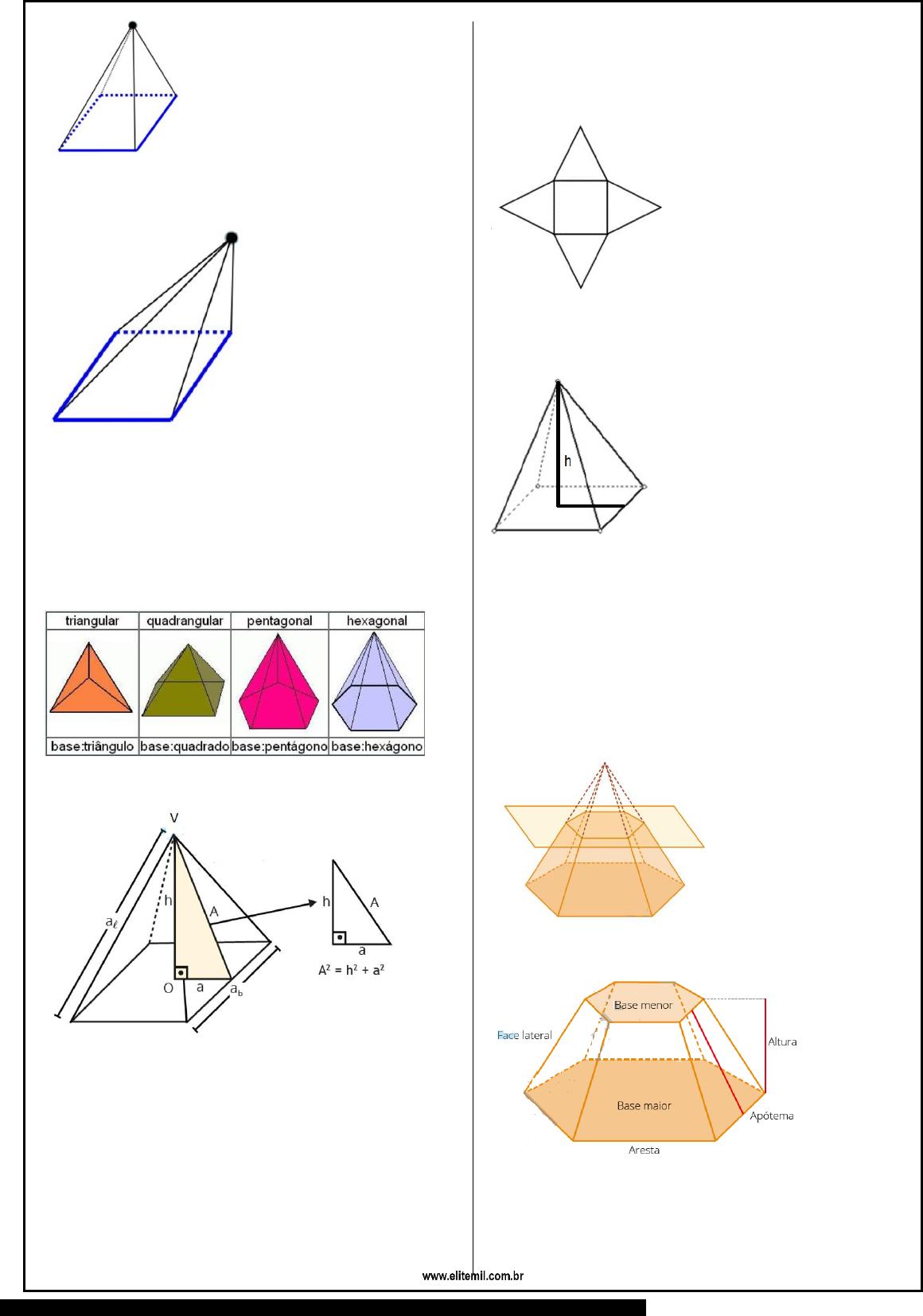 80 Oblíqua – Quando esse segmento não por perpendicular ao plano da base Classificação das Pirâmides: Uma pirâmide é dita regular quando sua base é um polígono regular e a projeção ortogonal do vértice coincide com o centro da base. Quanto ao número de lados as pirâmides são classificadas em: Elementos das Pirâmides: a → apótema da base h → altura da pirâmide A → apótema da pirâmide ou altura da face O → centro da base V → vértice 𝒂𝒍 → aresta lateral 𝒂𝒃 → aresta da base Área e volume da Pirâmide: Área: At=Al+Ab Volume: 𝑉=13A𝑏⋅h GEOMETRIA ESPACIAL – TRONCO DE PIRÂMIDES Tronco de pirâmide: O tronco da pirâmide é um sólido formado por um corte feito por um plano paralelo à base da pirâmide, como mostra a imagem. Elementos do Tronco da pirâmide: http://www.elitemil.com.br/ 81 Área do tronco da pirâmide: A área de um tronco de pirâmide é igual a soma das áreas de todos os polígonos que o formam. As bases menor e maior podem ser qualquer polígono, enquanto as faces laterais são trapézios. At=AB+Ab+ Al Volume do tronco da pirâmide: Para calcular o volume do tronco de uma pirâmide, devemos subtrair do volume da pirâmide original o volume da pirâmide menor formada pela secção transversal. 𝑉=h3𝐵+𝐵⋅𝑏+𝑏 ATIVIDADES 01) (EEAR – 2004 B1) Um prisma regular de base triangular tem altura igual ao lado da base e volume igual a 16 3 cm3. A área lateral desse prisma, em cm2, é A) 24 B) 8 C) 4 D) 48 02) (EEAR-2001 A1) – A base de um prisma quadrangular regular está inscrita numa circunferência cujo círculo tem 100 cm2 de área. Se a altura do prisma mede 1,5 cm, então o volume desse prisma, em cm3, é de: A) 200 B) 300 C) 400 D) 800 03) Um reservatório em forma de tronco de pirâmide regular de base quadrada e dimensões indicadas na figura deverá ter suas paredes laterais externas cobertas por uma tinta impermeável, cujo rendimento é de 11m² por galão. O número mínimo de galões que devem ser adquiridos para tal operação é: A) 6 B) 7 C) 9 D) 10 E) 11 04) Uma pirâmide está inscrita num cubo, como mostra a figura anterior. Sabendo-se que o volume da pirâmide é de 6 𝑚3, então, o volume do cubo, em 𝑚2, é igual a: A) 9 B) 12 C) 15 http://www.elitemil.com.br/ 82 D) 18 E) 21 05) (EEAR – 2000 A2) Um alpinista deseja escalar uma pedra com a forma de um cubo, de 50 m de aresta. Desta forma, de acordo com a figura, partindo do ponto A e desejando colocar sua bandeira em B, caminhando pelas faces da pedra, o caminho mais curto que ele pode percorrer mede (em metros) A) 503+2 B) 503 C) 505 D) 5050+5 GEOMETRIA ESPACIAL - Cilindro; - Tronco de cilindro. GEOMETRIA ESPACIAL - CILINDRO Cilindro: Considere dois planos 𝜶 𝒆 𝜷, paralelos e distintos, um círculo de centro O e raio r contido em 𝜶 e um segmento de reta 𝑨𝑩, com 𝑨∈𝜷 e 𝑩∈𝜶. Cilindro é o conjunto de todos os segmentos paralelos e congruentes ao segmento 𝑨𝑩 com uma das extremidades no círculo de centro O e outro no plano 𝜷. Cilindro reto, também chamado cilindro de revolução, é o sólido gelado pela rotação complete de um retângulo em torno de um eixo que contém um de seus lados. Elementos do Cilindro: h – Altura (eixo) g – Geratriz r – Raio Secção meridiana: É a região obtida na intersecção do cilindro e o plano que contém o seu eixo Observação: Todo cilindro cuja secção meridiana é um quadrado (altura igual ao diâmetro da base) é chamado cilindro equilátero. http://www.elitemil.com.br/