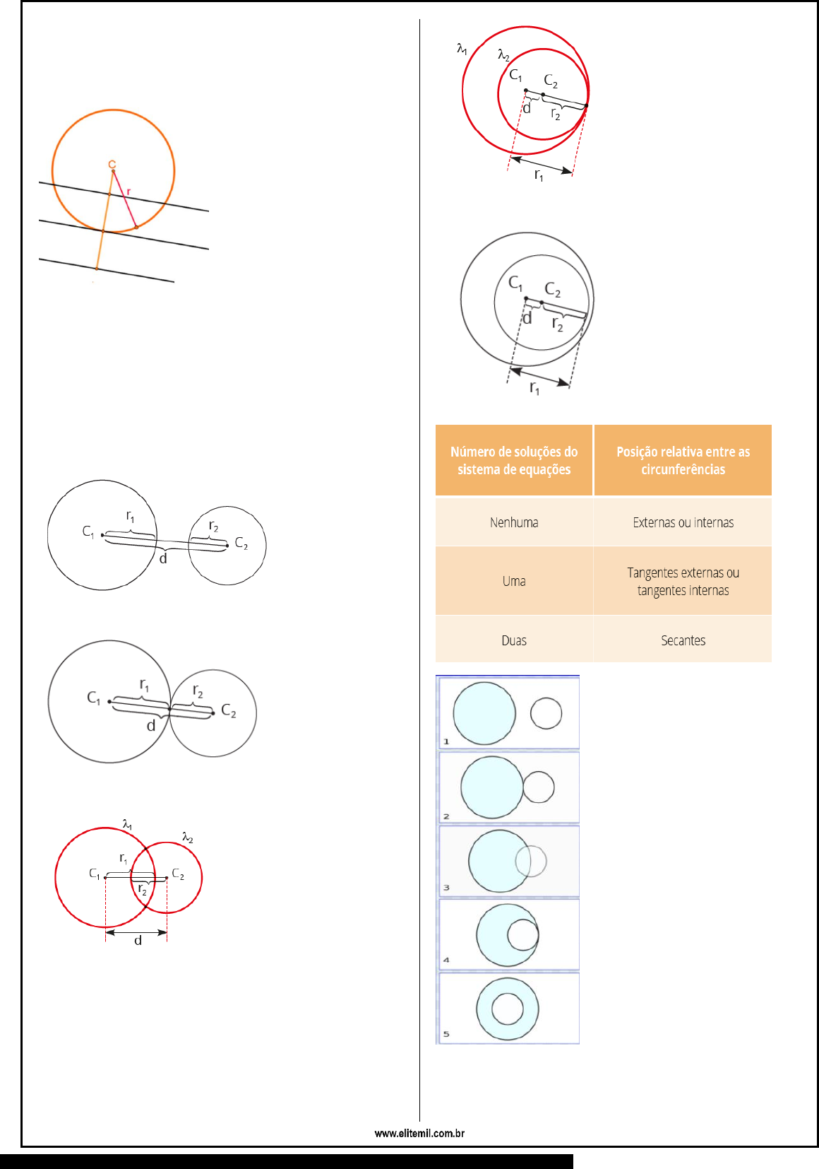 95 3) O sistema tem duas soluções - isso ocorre quando t for secante à 𝜆. Nesse caso, as soluções são representadas pelas coordenadas dos dois pontos de interseção entre t e 𝜆. Posições relativas entre duas circunferências Considere uma circunferência 𝜆1, de raio 𝑟1 e 𝑐1, e outra 𝜆2, de raio 𝑟2 e 𝑐2. Considere, também, a distância d entre essas duas circunferências 𝜆1 e 𝜆2 são possíveis as seguintes posições relativas: Externas Tangentes externas Circunferências secantes Circunferências tangentes internas Circunferência de raio menor interna à de raio maior ’ ATIVIDADES http://www.elitemil.com.br/ 96 01) Dados os pontos A(-1,2) e B(0,4), pertencentes a um sistema de eixos ortogonais num plano, podemos afirmar que: I. A distância entre esses pontos é 5. II. A equação da reta que passa por esse ponto é 2x – y = -4. III. A equação da circunferência que tem centro em A e passa por B -e (x + 1)2 + (y - 2)2 = 5. Das afirmativas anteriores, é(são) verdadeira(s) a) apenas I. b) apenas II. c) apenas III. d) I e II. e) II e III. 02) Em qual das alternativas a seguir, o ponto p pertence ‘a circunferência β? a) P(5, 6); β: (x - 2)2 + (y - 6)2 = b) P(1, 2); β: (x - 2)2 + (y- 2)2 = c) P (1, 5); β: x2 + y2 - 8x + 6 = 0 d) P (1, 3); β: (x + 1)2 + (y - 2)2 = 0 e) P (3, 1); β: x2 + y2 - 4x + 2y + 2 = 0 03) No plano cartesiano, a reta de equação 3x + 4y = 17 tangencia uma circunferência de centro no ponto (1,1). A equação dessa circunferência é: a) x2 + y – 2x – 2y – 4 = 0 b) x2 + y2 – 2x – 2y – 2 = 0 c) x2 + y2 – 2x – 2y – 5 = 0 d) x2 + y2 – 2x – 2y – 3 = 0 e) x2 + y2 – 2x – 2y – 1 = 0 GEOMETRIA ANALÍTICA - Elipse. GEOMETRIA ANALÍTICA Elise (origem) Seccionando um cone reto com um plano não paralelo ao plano da base desse cone, a figura obtida é uma elipse. Definição: Sejam F1 e F2 dois pontos distintos de um plano, tais que d(F1, F2) = 2c ≠ 0. Chamamos de elipse o lugar geométrico dos pontos desse plano, cuja soma das distâncias aos dois pontos F1 e F2 é uma constante 2a ( > 2c). Elementos da elipse Pontos principais: 𝐴1, 𝐴2 e 𝐵1,𝐵2 - Vértices 𝐹1, e 𝐹2 - Focos C – Centro Segmentos: A1𝐴2 Eixo maior m(𝐴1,𝐴2 ) = 2a B1𝐵2 Eixo menor m(𝐵1,𝐵2 ) = 2b A1𝐴2 Distância focal m(𝐹1,𝐹2 ) = 2c Excentricidade: ⅇ=𝒄𝒂 (𝟎<ⅇ<𝟏) http://www.elitemil.com.br/ 97 Relação importante: 𝒂𝟐=𝒃𝟐+𝒄𝟐 Equação reduzida: I - Quando o centro da elipse se encontra na origem do plano cartesiano e os focos no eixo das abscissas temos: 𝐱𝟐𝒂𝟐+𝐲𝟐𝒃𝟐= 1 Exemplo: Dada uma elipse cuja medida do eixo maior é igual a 10 e a distância entre os focos vale 6, com os focos no eixo das abcissas e o centro na origem, determine a equação dessa elipse. Equação reduzida: II - Quando o centro da elipse se encontra na origem do plano cartesiano e os focos no eixo das ordenadas temos: 𝐱𝟐𝒃𝟐+𝐲𝟐𝒂𝟐= 1 Exemplo: Dada uma elipse cuja medida do eixo maior é igual a 10 e a distância entre os focos vale 8, com os focos no eixo das ordenadas e o centro na origem, determine a equação e a excentricidade dessa elipse. Equação reduzida: III - Quando o centro da elipse não se encontra na origem do plano cartesiano temos: (𝐱 −𝒙𝟎)𝟐𝒂𝟐+(𝐲 −𝒚𝟎)𝟐𝒃𝟐= 1 (𝐱 −𝒙𝟎)𝟐𝒃𝟐+(𝐲 −𝒚𝟎)𝟐𝒂𝟐= 1 Exemplo: Determine a equação da elipse que tem centro no ponto O(6, 8), semieixo maior a = 10, semieixo menor b = 8 e eixo maior paralelo ao eixo x? Equação geral: A equação geral é obtida pelo desenvolvimento das formas reduzidas. Considere a elipse x − m2𝐸1+y − n2𝐸2=1, com 𝐸1 ≠ 𝐸2, com ambos positivos. Ao desenvolver e ordenar, obtemos 𝑬𝟐𝒙𝟐+𝑬𝟏𝒚𝟐−𝟐𝑬𝟐𝒎𝒙−𝟐𝑬𝟏𝒏𝒚+𝑬𝟐𝒎𝟐+𝑬𝟏𝒏𝟐−𝑬𝟏𝑬𝟐= 𝟎 Observação: Quando a equação da elipse se apresentar em sua forma geral é recomendável transforma essa equação para sua forma reduzida, conforme exemplos a seguir: Exemplos: Dada as seguintes equações das elipses representadas em suas formas gerais. Determine suas formas reduzidas: 01) 4𝑥2+9𝑦2=36 02) 4𝑥2−24𝑥+25𝑦2−64=0 03) 9𝑥2+4𝑦2−18𝑥+16𝑦−11=0 http://www.elitemil.com.br/