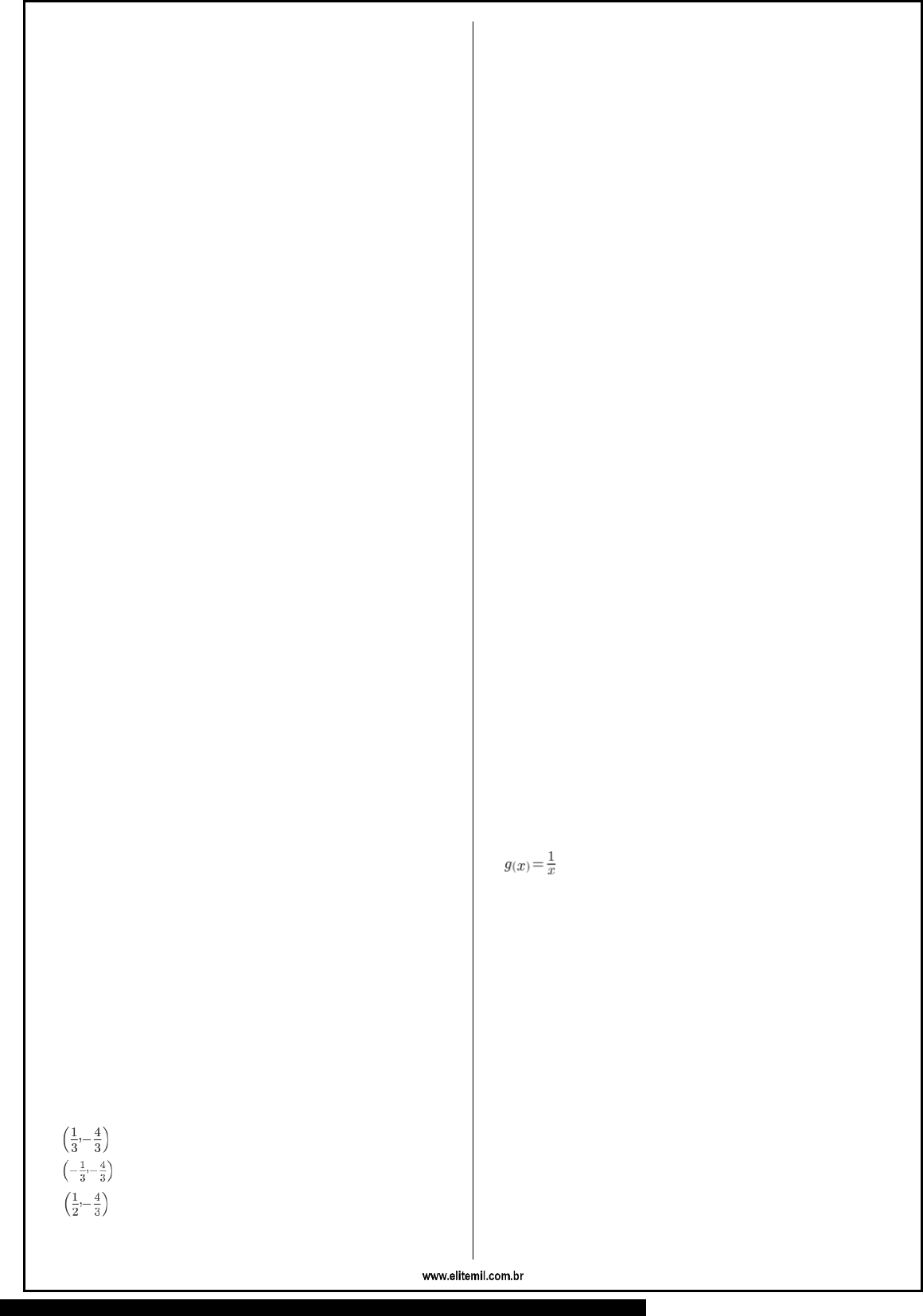 140 a) [-20, 20]. b) [0, 20]. c) [80,100]. d) [80,120]. e) [100,120]. 17) (EEAR) (FUNÇÃO MODULAR) Seja f(x) = |x - 3| uma função. A soma dos valores de x para os quais a função assume o valor 2 é a) 3 b) 4 c) 6 d) 7 18) (FUNÇÃO MODULAR) Se f : R→R é definida por f (x) =1− x2 − |x2− 2| , então a) o gráfico de f é uma parábola. b) o conjunto imagem de f é ] −∞, −1] . c) f é uma função injetora. d) f é uma função sobrejetora. e) f é crescente para x ≤ 0, e, decrescente para x >0 =. 19) Se f é uma função inversível com f(2)=0 e g(x) = x/(x+1), então (fog)-1(0) é igual a a) − 4 b) − 3 c) − 2 d) − 1 e) 0 20) (LOGARITMO) Seja R+ o conjunto dos números reais positivos e f: R → R+ a função definida por f(x) = 2x . Esta função é invertível. Se f-1 : R+ → R é sua inversa, então, o valor de f-1 (16) – f -1 (2) – f -1 (1) é a) 3. b) 8. c) 7. d) 5. Exercícios – Função quadrática 1) Considere a função y = 3x2 - 2x - 1para todos os valores reais de x. Qual é o vértice da parábola? a) b) c) d) (3,-4) 2) (REGRA DE 3) A gestão municipal de uma cidade aplica R$ 24,00 em Educação para cada R$ 14,00 em Saúde. Se, em dois meses, foram aplicados R$ 224.000,00 em Saúde, qual é o valor aplicado em Educação nesses dois meses? a) R$ 584.000,00 b) R$ 434.000,00 c) R$ 384.000,00 d) R$ 296.000,00 e) R$ 248.000,00 3) Após perder o emprego, Edileusa decidiu iniciar um negócio próprio. Como ela sempre teve uma boa desenvoltura para cozinhar, decidiu que iria fazer bolos para vender. Depois de certo tempo, com o crescimento das encomendas, Edileusa conseguiu calcular o lucro obtido por meio de uma função matemática que relaciona a quantidade de bolos produzidos e vendidos. A função é f(x) = – x 2 + 60x, em que f(x) representa o lucro obtido, em reais, e x a quantidade de bolos produzidos e vendidos. Porém, com o passar do tempo, Edileusa percebeu que, para atingir o lucro máximo, ela só poderá produzir certa quantidade máxima de bolos, pois, caso contrário, com uma produção muito grande, o lucro começaria a diminuir devido aos crescentes custos. Portanto, para que Edileusa consiga um lucro máximo, ela deverá produzir e vender Obs.: Considere que todos os bolos que são produzidos são vendidos. a) 20 bolos b) 30 bolos. c) 40 bolos. d) 50 bolos. e) 60 bolos 4) Sejam as funções reais definidas por f(x) = x2 - 1 e . Então, f (g(-1)) é igual a: a) – 1. b) 0. c) 1. d) 2. http://www.elitemil.com.br/ 141 5) Um empresário do ramo farmacêutico que produz e comercializa antibióticos percebeu que a quantidade vendida variava de acordo com o preço de venda. Guiando-se pela lei da oferta e da procura, elaborou uma fórmula matemática que modela a Receita (y), em reais, em função da quantidade de antibióticos (x) vendidos pela empresa, sendo 0 ≤ x ≤ 150. Com base no gráfico, a receita máxima obtida com a venda de antibióticos é a) 5 040. b) 7 200. c) 9 320. d) 12 000. e) 13 680. 6) Sejam x e y valores que representam o número de funcionários alocados em diferentes setores de um hospital e o símbolo ⨂, uma relação entre esses valores, definida por: x ⨂ y = 2x + y2. Se a relação estabelece o gasto máximo mensal do hospital, em Reais, com brindes distribuídos aos seus funcionários, o gasto para 3 ⨂ (2 ⨂ 4) será de a) 406 Reais. b) 156 Reais. c) 70 Reais. d) 24 Reais. 7) Uma empresa produz diariamente x quilogramas de uma matéria prima, a um custo diário dado por C(x) = 0,1x2 + 40 x + 3000, em que x ≤ 400. Se o preço de venda por quilograma for de 80 reais, podemos afirmar que o lucro diário será positivo, para valores de x entre: a) 110 e 310 b) 90 e 290 c) 100 e 300 d) 80 e 280 e) 120 e 320 8) Qual das alternativas a seguir representa, conjuntamente, os esboços dos gráficos das funções reais f(x) = x² e g(x) = 4x-4? a) b) c) d) e) 9) Funções afins e quadráticas têm aplicações em alguns modelos simples, envolvendo os conceitos preço de venda e custo de produção de uma mercadoria, bem como a receita e o lucro obtidos com sua venda. Para uma empresa, é fundamental determinar o intervalo de produção em que a receita supera o custo de produção. http://www.elitemil.com.br/ 142 Suponha que o custo de produção de uma mercadoria de certa empresa, em função da quantidade produzida x ,seja dado pela função C(x) = 40x + 1400 (c0 = 1400 é denominado custo fixo de produção) e que o preço de venda seja p(x) = -2x + 200, em que x é a quantidade demandada (vendida). Nesse caso, a receita R obtida com as vendas é função de x, precisamente R(x) = x.p(x). As quantidades produzidas e vendidas x para as quais essa empresa tem lucro L(x) = R(x) - C(x) positivo (receita supera o custo de produção) é a) {x ∈ R | x > 40} b) {x ∈ R | 0 < x < 10} c) {x ∈ R | 10 < x < 70} d) {x ∈ R | 10 < x < 40} 10) Para produzir determinado tipo de tecido, uma fábrica gasta R$ 2,20 por metro. Além disso, há uma despesa fixa de R$ 2.500,00, independente da quantidade de metros produzidos. Se cada metro do tecido é vendido por R$ 4,00, o número mínimo de metros no qual a fábrica passa a ter lucro com a venda é a) 1388. b) 1389. c) 1390. d) 1391. e) 1392. Exercícios – Inequação do 2 grau 1) Um número N, inteiro e positivo, que satisfaz à inequação N2 − 17N + 16 > 0 é: a) 2 b) 7 c) 16 d)17 2) Considere a inequação x2 - 1 ≤ 3 . Está contido no conjunto solução dessa inequação o intervalo a) [–3, 0] b) [–1, 1] c) [1, 3] d) [3, 4] 3) Considere as funções reais dadas pelas leis f(x) = x – 1 e g(x) = x2 – 2x + 2. O conjunto solução da inequação f(x) > f(g(x)) é dado por a) {x ∈ IR| 0 < x < 1}. b) {x ∈ IR| 1 < x < 2}. c) {x ∈ IR| x < 0 ou x > 2}. d) {x ∈ IR| x > 2}. e) {x ∈ IR| x < 0}. 4) Os valores de m que tornam a desigualdade mx2 - 4x + m < 0 sempre verdadeira, são aqueles tais que: a) m < 0. b) -2 < m < 2. c) m < -2. d) m ≥ 1. 5) 