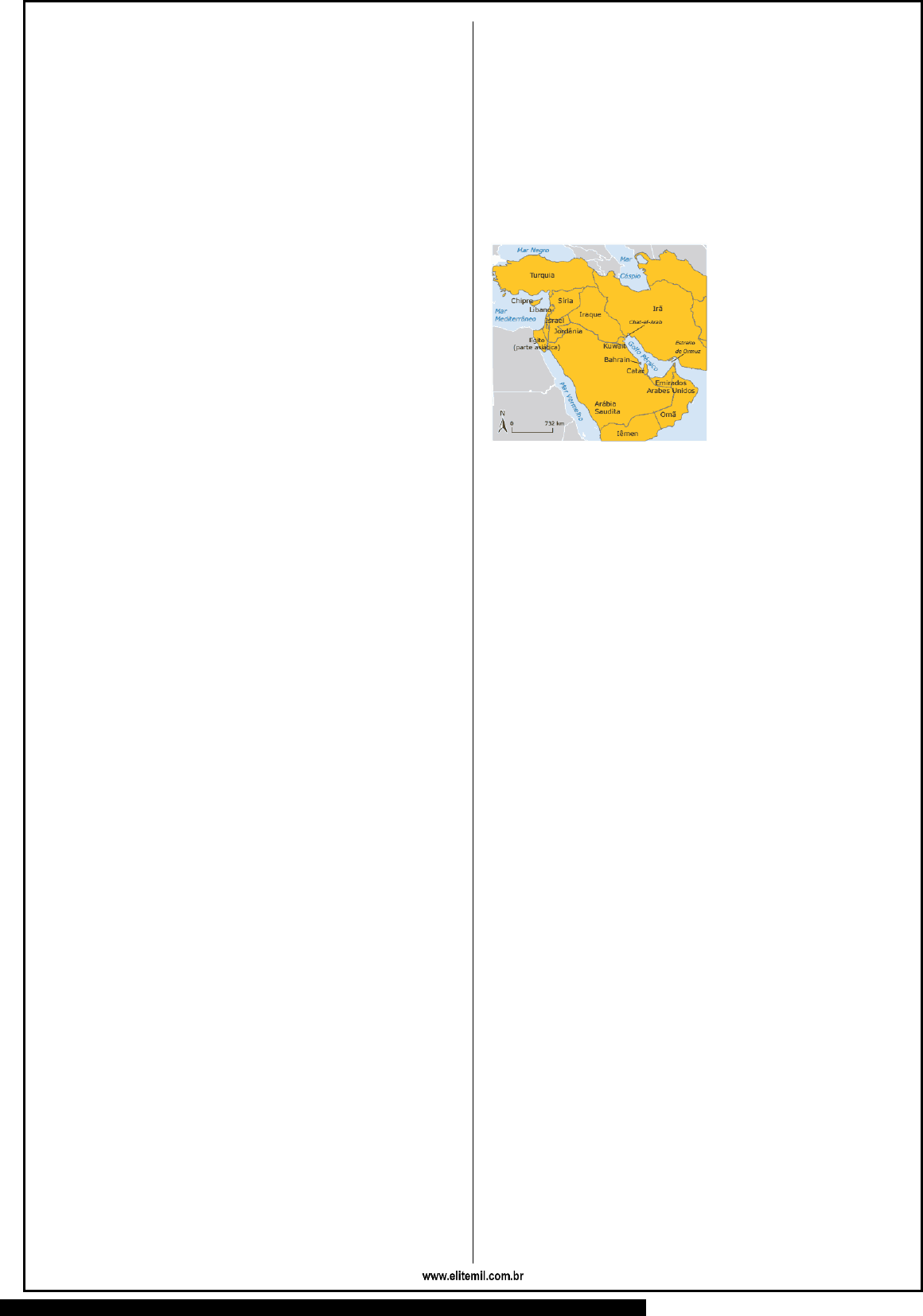 179 a Guerra do Golfo Pérsico de 1991, após o Iraque ter invadido e anexado o Kuwait. As alternativas seguintes descrevem uma etapa da Guerra do Golfo de 1991, EXCETO: A) Envio de tropas dos EUA para a região do Golfo Pérsico. B) Renúncia do Xá Reza Pahlevi, a pedido dos EUA, para evitar maiores constrangimentos. C) Decretação do boicote econômico ao Iraque pela ONU. D) Ataques a Israel e Arábia Saudita promovidos pelo Iraque. E) Rendição do Iraque. 4. Conflitos no Líbano, Irã e Iraque: (UDESC-SC–2011) O Irã é oficialmente uma República Islâmica, conhecido até a primeira metade do século XX apenas como Pérsia. Em 1979 houve uma revolução que fez aquele país sair da condição de Monarquia Autocrática para República Islâmica. Sobre o Irã e a condição de República Islâmica, é INCORRETO afirmar que: A) o aiatolá Khomeini foi o grande promotor da Revolução Islâmica, que visivelmente começava a se opor à ocidentalização pela qual o Irã passava. B) a Revolução Iraniana que derrubou o Xá Mohammad Reza Pahlevi contou com apoio de amplos setores sociais num primeiro momento, para em seguida fazer chegar ao poder os aiatolás. C) o Irã Persa é árabe e, por extensão, islâmico, pois todos os islâmicos são árabes e vice-versa. D) entre 1980 e 1988, o Irã entrou em sangrento conflito com o Iraque, pouco tempo depois de ter passado pela Revolução. E) recentemente o Irã foi acusado pela comunidade internacional de possuir armas nucleares. 5. Conflitos no Líbano, Irã e Iraque: (UDESC-SC–2011) Analise as proposições relacionadas aos conflitos envolvendo a região do Oriente Médio. I. Sendo pró-ocidente, Israel, mesmo situado naquela região, mantém uma tradicional política de neutralidade com o mundo árabe. II. Iraque (árabe) e Irã (persa) viveram um sangrento conflito entre 1980 e 1988. III. A Revolução Xiita no Irã, no final da década de 1970, ainda hoje tem forte repercussão entre as nações islâmicas. IV. Durante a Guerra do Golfo em 1991, não foram medidos esforços, dos dois lados, para que as jazidas de petróleo e o meio ambiente fossem preservados. Assinale a alternativa CORRETA: A) Somente as afirmativas III e IV são verdadeiras. B) Somente as afirmativas II e III são verdadeiras. C) Somente as afirmativas I e III são verdadeiras. D) Somente as afirmativas II e IV são verdadeiras. E) Todas as afirmativas são verdadeiras. 6. Conflitos no Líbano, Irã e Iraque: (UFBA–2008) Com base na análise do mapa e nos conhecimentos sobre os problemas socioeconômicos, políticos, culturais e religiosos do Oriente Médio, pode-se afirmar: Oriente Médio 01. A predominância do judaísmo e do islamismo no Oriente Médio, nos dias atuais, impede a organização e a sobrevivência das religiões cristãs – católica, ortodoxa e protestante – naquela região. 02. Há muitos grupos religiosos, étnicos e políticos no Iraque, sendo que a grande maioria da população é constituída pelos árabes e está dividida em sunitas e xiitas, ramos da religião islâmica. 04. Os curdos que habitam o norte do Iraque, cristãos grego-ortodoxos, são contra a presença militar estrangeira no país. 08. Os Estados Unidos e a União Europeia, temendo a construção de armas nucleares pelo Irã, incluíram esse país no Eixo do Mal, acentuando a rivalidade existente entre eles, decorrente do fundamentalismo islâmico. 16. A retirada dos colonos judeus da Faixa de Gaza e de alguns assentamentos da Cisjordânia, finalizada em agosto de 2005, foi uma operação realizada sem resistência, promovendo a paz duradoura entre a Jihad Islâmica e os israelenses. 32. As Colinas de Golã, nas quais são encontradas várias fontes de água, inclusive o Rio Jordão, foram ocupadas por Israel desde a Guerra dos Seis Dias e constituem área de discórdia entre o Estado judeu e a Síria. Soma ( ) 7. (UFMG) Observe este mapa: Oriente Médio http://www.elitemil.com.br/ 180 Fonte: IBGE. Atlas Geográfico Escolar. Rio de Janeiro: IBGE, 2002. p. 55 (Adaptação). A partir da interpretação desse mapa e considerando outros conhecimentos sobre o assunto, é INCORRETO afirmar que: A) a proximidade entre várias capitais nacionais – sobretudo Beirute, Tel Aviv, Amã e Damasco – as torna mais vulneráveis em situações de conflitos bélicos, frequentes na região. B) o Oriente Médio, por sua posição latitudinal e relativa à circulação atmosférica geral, tem clima mediterrâneo, com tendência à semiaridez ou à aridez, responsável pelo impacto nos recursos hídricos, um dos maiores problemas regionais. C) a região, situada no “fundo” do Mar Mediterrâneo, na junção de três continentes, foi rota de grandes exércitos conquistadores e esteve sob domínio sucessivo de inúmeros grandes impérios. D) as fronteiras nacionais, definidas há muitos anos, resultaram da existência de obstáculos de natureza física, que impediam o traçado de limites correspondentes ao quadro geopolítico. 8. Conflitos no Líbano, Irã e Iraque: (UFES) Aproveite a crítica do flme Tempo de embebedar cavalos e observe a situação política e os desdobramentos geográficos para os quais ela aponta. Tempo de embebedar cavalos O filme faz uma abordagem lírica do tema: fome e falta de perspectiva de um povo. A história se passa em um pequeno vilarejo, na fronteira entre o Iraque e o Irã, e apresenta ao mundo um recorte do cotidiano da maior nação sem Estado do planeta. Aponta muitos dos problemas enfrentados pelo seu povo, que se encontra espalhado por alguns países, como a Turquia, o Irã, a Síria […] Com língua e cultura próprias, ele vem sendo rechaçado da região, principalmente quando o seu país deixou de existir nos mapas. Praticamente, o único trabalho disponível em certas regiões é o de contrabando de mercadorias entre o Irã e o Iraque. Além dos riscos dessa atividade ilegal, os habitantes sofrem com a enorme quantidade de minas enterradas nos