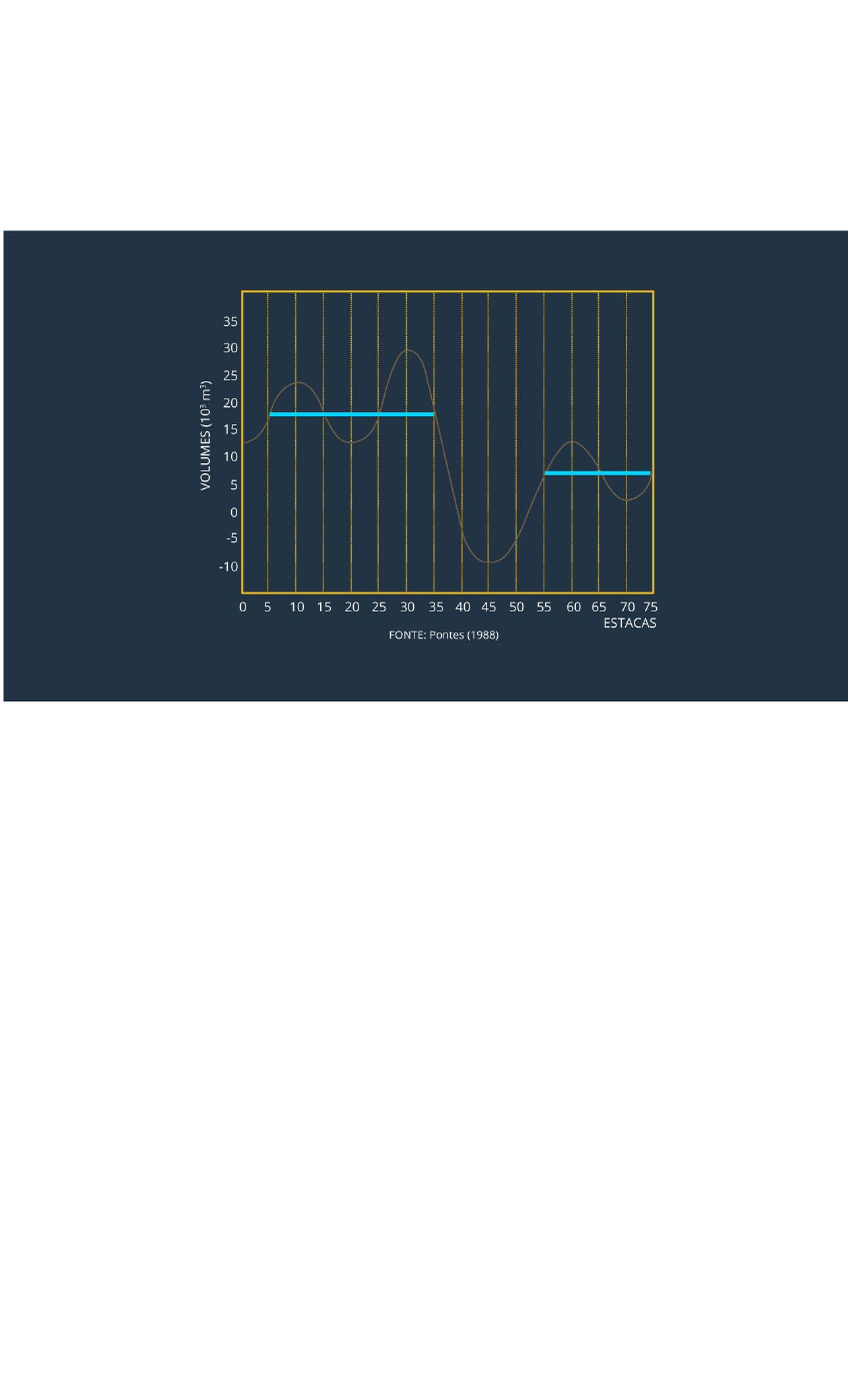 Você, como Engenheiro Rodoviário, em um projeto com 75 estacas e estaqueamento de 20 m, para ajustar a compensação de volumes e distâncias de transporte, não abriu mão do Diagrama de Bruckner — ferramenta que mais facilita esse tipo de análise. Sobre o diagrama elaborado por você, foram traçadas três linhas de compensação, conforme anexo. Com base no seu diagrama e nessas linhas de compensação indicadas, estime os seguintes dados (em m3 ou m): 1) A distância média de transporte característica do projeto. A distância média de transporte (dm) de cada distribuição pode ser considerada como a base de um retângulo de área equivalente a do segmento compensado e de altura igual à máxima ordenada desse segmento. 2) O volume de empréstimo. Vol = (20-0)10³ = Vol. de empréstimo = 20.000m 3) O volume de bota-fora. Vol = [(20-15)+(10-0)]10³ Vol=15.000 m² 4) O volume do maior corte. Vol corte = [ 15 - (-5)]10³ Volume do maior corte = 20.000 m³ 5) O volume do maior aterro. Vol aterro = [30-(-5)]10³ Volume do maior aterro = 35.000 m³