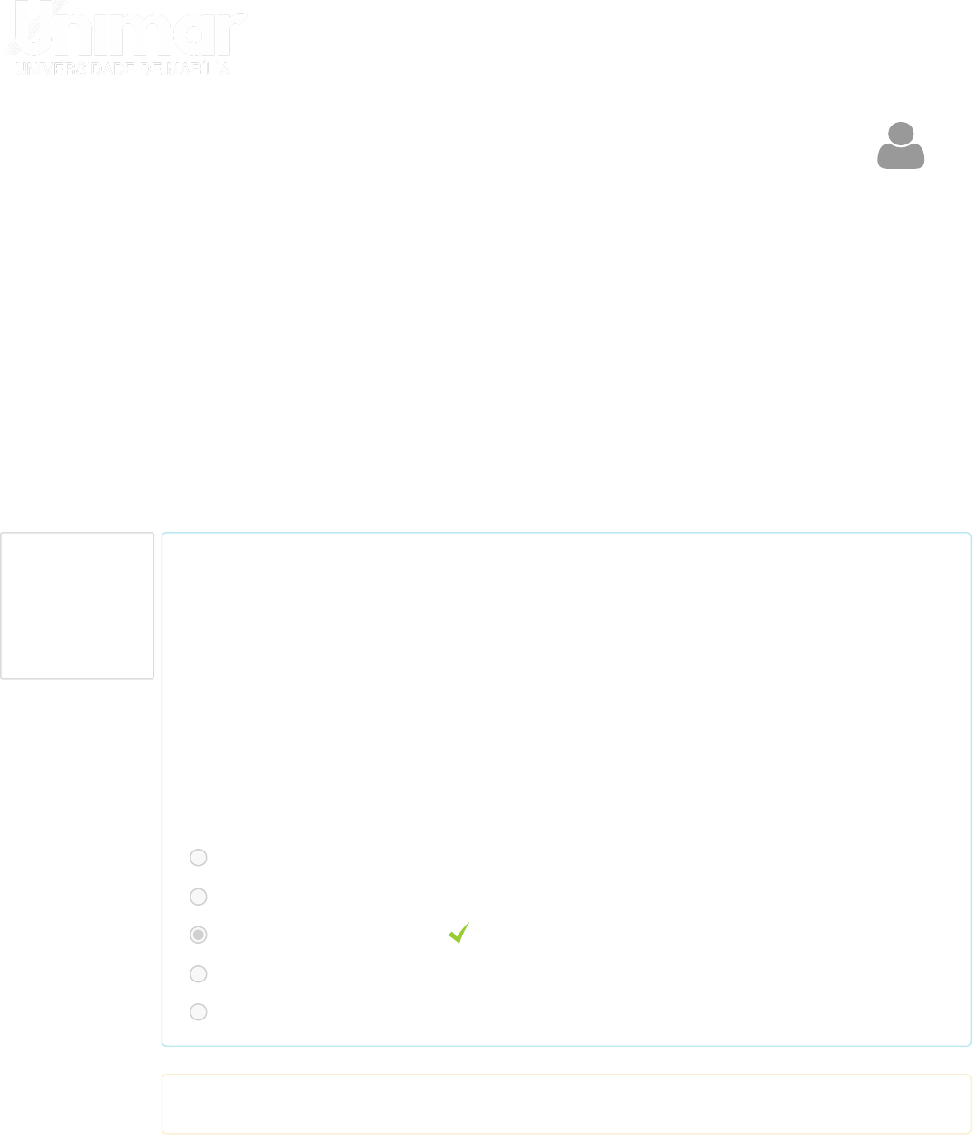 RODOLFO FRANCISCO DA SILVA (RODOLFO FRANCISCO DA SILVA) Painel Gestão M4.23 | Matemática II Atividade de Estudo 4 AE4 - Atividade de Estudo 4 Questão 1 Correto Atingiu 1,00 de 1,00 Iniciado em quinta, 30 Nov 2023, 09:21 Estado Finalizada Concluída em quinta, 30 Nov 2023, 09:25 Tempo empregado 3 minutos 47 segundos Avaliar 5,00 de um máximo de 5,00(100%) Assinale a alternativa em que os itens abaixo estão corretos: I - O tempo é o período de juros. Pode ser expresso somente em dias, meses e anos. II - Capital é com a determinação conforme a unidade de tempo, que vem sempre definida com a seguinte terminologia III - O juro também pode ser o valor que você pagará em relação a alguma dívida que tenha adquirido. Em caso de atraso de pagamento, pagará juros pela inadimplência. Escolha uma opção: a. I e III são corretas. b. I e II são corretas. c. Somente a III é correta. d. Somente a II é correta. e. II e III são corretas. Sua resposta está correta. https://digital.unimar.br/areadoaluno/curso/matriculado https://lms.unimar.agencianx.com.br/my/ https://lms.unimar.agencianx.com.br/course/index.php?categoryid=13 https://lms.unimar.agencianx.com.br/course/view.php?id=3669 https://lms.unimar.agencianx.com.br/mod/quiz/view.php?id=114737 Questão 2 Correto Atingiu 1,00 de 1,00 “Desconto e juros são dois critérios diferentes, cada qual com sua característica. Desta forma, sabe-se que para calcular juros, a taxa é referente ao período da operação sobre o capital inicial. Quando se trata de desconto à taxa do período é referente ao montante ou valor futuro.” Desta forma, assinale a alternativa em que descreve corretamente o conceito de desconto comercial simples. Escolha uma opção: a. é aquele em que a taxa de desconto incide sempre sobre o montante ou valor futuro. Também chamado de Bancário ou “por fora” é o desconto normalmente utilizado pelos bancos e pelo comércio em geral. É o tipo que resulta no maior valor de desconto b. Desconto comercial simples é composto pelo período do tempo em referência varia exponencialmente em função do tempo. Sendo assim, para desenvolver o montante no juro composto, é necessário conhecer o período da aplicação. c. Desconto comercial simples tem uma importante função nas capitalizações simples e compostas. É com a determinação conforme a unidade de tempo, que vem sempre definida com a seguinte terminologia d. É ganho que se tem quando uma quantia de dinheiro é emprestada. Já a taxa desses juros é calculada mediante a diversos fatores, que podem ser: inflação, valor emprestado, risco, número de parcelas, entre outros. e. Desconto comercial simples ocorre quando se tem um valor a pagar e este não é pago na data de vencimento, visto que esse atraso gerará juros, de modo que, no momento do pagamento, terá de ser quitado o valor principal mais os juros correspondentes ao período de atraso, gerando um montante maior que o valor principal. Sua resposta está correta. Questão 3 Correto Atingiu 1,00 de 1,00 Questão 4 Correto Atingiu 1,00 de 1,00 Assinale a alternativa em que os itens abaixo estão corretos: I - Assim como no desconto simples, também existem dois tipos de desconto composto. II - O desconto “por dentro” ou desconto real, conhecido como desconto racional simples, sendo como base o valor atual. III - Desconto e juros são dois critérios diferentes, cada qual com sua característica. Escolha uma opção: a. I e II são corretas. b. Somente a III é correta. c. I, II e III são corretas. d. II e III são corretas. e. Somente a II é correta. Sua resposta está correta. Escolha uma opção: a. I e III são corretas b. Somente a II é correta c. II e III, apenas. d. Somente a III é correta e. I, II, III e IV Sua resposta está correta. Questão 5 Correto Atingiu 1,00 de 1,00 Escolha uma opção: a. 38 b. 26 c. -31 d. 45 e. -38 Sua resposta está correta. Siga-nos Contato Avenida Hygino Muzzy Filho, 1001 - Marília - SP, Cep 17525-902 Telefone: (14) 2105-4000 Copyright © 2015 - Desenvolvido por Nephzat.com. Fornecido por Moodle https://lms.unimar.agencianx.com.br/ https://www.facebook.com/unimaread http://www.nephzat.com/ https://moodle.org/