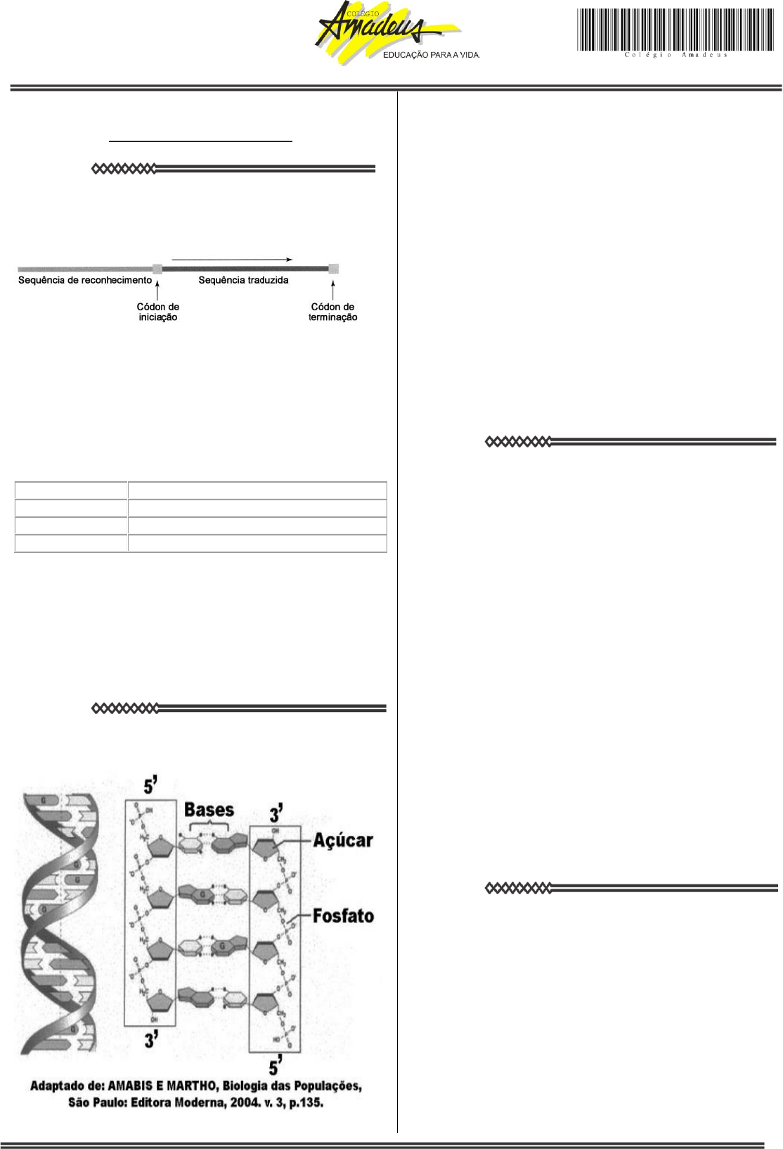 APOSTILA DE BIOLOGIA MILENA MAIA Prof. Milena Página 1 Biologia ÁCIDOS NUCLÉICOS QUESTÃO 01 Alguns vírus, como o da poliomielite, contêm RNA de fita simples (+), que podem funcionar diretamente como mensageiros na célula infectada. Esses RNA possuem uma sequência nucleotídica necessária para que o códon de iniciação da síntese proteica seja identificado, como mostra o esquema a seguir: Considere, para um RNAm desse tipo, que sintetiza um peptídeo viral, as seguintes informações: – se a base nitrogenada adenina do códon de iniciação é a de número 1, a base uracila do códon de terminação será a de número 133, seguindo- se o sentido da tradução; – o códon UGG aparece duas vezes na porção desse RNA que codifica o peptídeo. Observe, na tabela abaixo, a identificação de alguns códons: CÓDON AMINOÁCIDO CODIFICADO OU FUNÇÃO AUG metionina – iniciação UAA, UAG, UGA terminação UGG triptofano O aminoácido metionina, introduzido no peptídeo pelo códon iniciador, é imediatamente removido após o término da tradução. A percentagem de triptofano na composição da molécula desse peptídio é de: A) 1,48%. B) 1,55% C) 4,44% D) 4,65%. QUESTÃO 02 O segmento de molécula de DNA representado na figura a seguir ilustra o que preconiza o modelo da dupla hélice, idealizado pelos cientistas James D. Watson e Francis H. C. Crick. Com base nos conhecimentos sobre a estrutura da molécula de DNA e nas informações contidas na figura, é correto afirmar: A) A molécula de DNA apresenta fosfato, ribose e as bases nitrogenadas adenina, citosina, uracila e guanina, como moléculas formadoras de seus nucleotídeos. B) O modelo idealizado contradiz a relação de bases de Chargaff, que diz que a quantidade da base adenina será sempre igual à quantidade da timina e que a quantidade da citosina será sempre igual à da guanina (A/T=C/G=1). C) A molécula de DNA apresenta duas fitas ou cadeias que se mantêm unidas, através de pontes de hidrogênio estabelecidas entre bases complementares voltadas para o interior da estrutura helicoidal. D) As fitas ou cadeias da molécula de DNA são ditas complementares, devido à formação de pontes de hidrogênio entre o nucleotídeo que contém adenina de uma das cadeias e o nucleotídeo que contém guanina da outra cadeia. E) O modelo não é elucidativo quanto à composição química da molécula de DNA, uma vez que não consegue explicar por que o DNA é considerado um ácido nucleico. QUESTÃO 03 “Virtualmente, cada aspecto da vida de nossas células é regulado por seu DNA, incluindo sua própria morte. As últimas instruções do DNA, enviadas ao citoplasma, referem-se à morte da célula. Logo que essas instruções sejam recebidas e processadas, a célula começa a destruir todo o DNA de seu núcleo, partindo-o em milhares de pedaços que não mais conseguem enviar instruções úteis à célula. Esta, apesar de poder continuar exercendo determinadas funções durante certo tempo, está fadada a morrer, processo este decididamente irreversível.” (Traduzido e adaptado de: William R. Clark. SEX AND THE ORIGINS OF DEATH. New York: Oxford University Press, 1996. p. 32-5) Considere os seguintes fatos: I. Uma célula do miocárdio morta por falta de oxigênio durante um ataque cardíaco. II. Uma célula morta pelas toxinas produzidas por bactérias invasoras. III. Uma célula da camada germinativa da epiderme, que morre e sofre queratinização. A apoptose ou morte programada das células é verificada somente em A) I B) II C) III D) I e II E) I e III QUESTÃO 04 Os biólogos sabem que na evolução da vida antes da galinha veio o ovo amniótico e antes da origem do DNA houve o RNA: “(…) As propriedades mensageiras e catalíticas poderiam ter estado inicialmente combinadas numa única espécie molecular no chamado ‘mundo do RNA’ (Vieyra, A. e SouzaBarros, F., 2000. Teorias da origem da vida no século XX. Em ElHani, C.N. e Videira, A.A.P. (Orgs), 2000. O Que é Vida: para entender a biologia do século XXI. Editora Relume Dumará)”. Além dessa capacidade autocatalítica encontrada em RNAs específicos (chamados ribozimas), assinale abaixo a alternativa que contém mais duas diferenças comparativas entre RNA e DNA. A) Ribose e uracila. B) Adenina e guanina. https://djalmasantos.files.wordpress.com/2010/12/0110.jpg https://djalmasantos.files.wordpress.com/2010/12/024.jpg APOSTILA DE BIOLOGIA MILENA MAIA Profa. Milena Página 2 Biologia C) Citosina e timina. D) Timina e adenina. E) Ácido fosfórico e desoxirribose QUESTÃO 05 05. Na década de 1990 foram descobertas, no genoma de aves e mamíferos, inúmeras sequências de DNA que tinham grande similaridade com os retrovírus infecciosos e por isso foram denominadas retrovírus endógenos (RVEs). Sabemos hoje que esses estranhos elementos constituem 8% do genoma humano. (Fonte: Instituto Ciência Hoje – coluna Deriva Genética.) Sobre os retrovírus endógenos, considere as seguintes afirmativas: 1. Retrovírus endógenos surgem a partir da evolução de genes mutantes do próprio organismo. 2. Para que esses elementos surjam, é necessária a presença, em algum momento do processo, da enzima transcriptase reversa. 3. Os retrovírus endógenos são encontrados no citoplasma das células infectadas. 4. A origem de retrovírus endógeno pode se dar a partir da infecção de organismos por vírus que possuem RNA como material genético. Assinale a alternativa correta. A) Somente a afirmativa 2 é verdadeira. B) Somente as afirmativas 1 e 3 são verdadeiras. C) Somente as afirmativas 2, 3 e 4 são verdadeiras D) Somente as afirmativas 2 e 4 são verdadeiras. E) Somente as afirmativas 1 e 4 são verdadeiras. QUESTÃO 06 Sobre o DNA, assinale o que for correto. V F 0 0 – DNA é a sigla inglesa para o ácido desoxirribonucleico. É a substância que está nos cromossomos dos seres vivos, como pequenos filamentos presentes no núcleo das células. O DNA tra