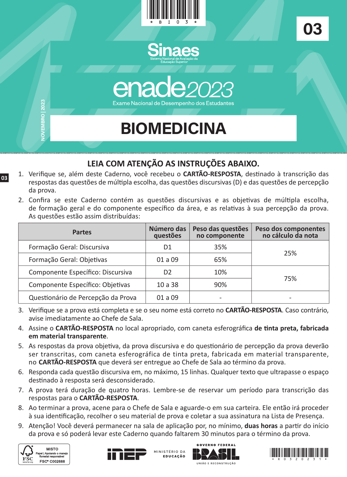 M I N I S T É R I O D A E D U C A Ç Ã O LEIA COM ATENÇÃO AS INSTRUÇÕES ABAIXO. 1. Verifi que se, além deste Caderno, você recebeu o CARTÃO-RESPOSTA, desti nado à transcrição das respostas das questões de múlti pla escolha, das questões discursivas (D) e das questões de percepção da prova. 2. Confi ra se este Caderno contém as questões discursivas e as objeti vas de múlti pla escolha, de formação geral e do componente específi co da área, e as relati vas à sua percepção da prova. As questões estão assim distribuídas: Partes Número das questões Peso das questões no componente Peso dos componentes no cálculo da nota Formação Geral: Discursiva D1 35% 25% Formação Geral: Objeti vas 01 a 09 65% Componente Específi co: Discursiva D2 10% 75% Componente Específi co: Objeti vas 10 a 38 90% Questi onário de Percepção da Prova 01 a 09 - - 3. Verifi que se a prova está completa e se o seu nome está correto no CARTÃO-RESPOSTA. Caso contrário, avise imediatamente ao Chefe de Sala. 4. Assine o CARTÃO-RESPOSTA no local apropriado, com caneta esferográfi ca de ti nta preta, fabricada em material transparente. 5. As respostas da prova objeti va, da prova discursiva e do questi onário de percepção da prova deverão ser transcritas, com caneta esferográfica de tinta preta, fabricada em material transparente, no CARTÃO-RESPOSTA que deverá ser entregue ao Chefe de Sala ao término da prova. 6. Responda cada questão discursiva em, no máximo, 15 linhas. Qualquer texto que ultrapasse o espaço desti nado à resposta será desconsiderado. 7. A prova terá duração de quatro horas. Lembre-se de reservar um período para transcrição das respostas para o CARTÃO-RESPOSTA. 8. Ao terminar a prova, acene para o Chefe de Sala e aguarde-o em sua carteira. Ele então irá proceder à sua identi fi cação, recolher o seu material de prova e coletar a sua assinatura na Lista de Presença. 9. Atenção! Você deverá permanecer na sala de aplicação por, no mínimo, duas horas a parti r do início da prova e só poderá levar este Caderno quando faltarem 30 minutos para o término da prova. 03 BIOMEDICINA N O VE M BR O | 20 23 VALIDINEP2023VALIDINEP2023VALIDINEP2023VALIDINEP2023VALIDIN3P2023VALIDINEP2023VALIDINEP2023VALIDINEP2023VALIDINEP2023VALIDINEP2023VALIDINEP2023VALIDINEP2023VALIDINEP2023VALIDINEP2023VALIDINEP2023VALIDINEP2023VALIDINEP2023VALIDINEP2023VALIDINEP2023VALIDINEP2023VALIDINEP2023VALIDINEP2023VALIDINEP2023VALIDINEEP2023VALIDINEP2023VALIDINEP2023VALIDINEP2023VALIDINEP2023VALIDINEP2023VALIDINEP2023VALIDINEP2023VALIDINEP2023VALIDDIN 03 *r0320231* 2 Biomedicina FORMAÇÃO GERAL LOGO 2 MATÉRIA QUESTÃO DISCURSIVA 01 Na publicação Síntese de Indicadores Sociais, divulgada pelo Insti tuto Brasileiro de Geografi a e Estatí sti ca (IBGE) em 2022, é sistemati zado um conjunto de informações sobre a realidade social brasileira. Os indicadores ilustram a heterogeneidade da sociedade sob a perspecti va das desigualdades sociais e, de modo geral, demonstram que todas as Grandes Regiões do Brasil registraram aumento da extrema pobreza em 2021. Pelos critérios do Banco Mundial, cerca de 29,4% da população do Brasil estavam em situação de pobreza e 8,4%, de extrema pobreza, sendo esses os maiores percentuais de ambos os grupos desde o início da série, em 2012. O índice de Gini, indicador que permite analisar o nível de igualdade ou desigualdade de uma região ou de um país, teve seu valor elevado e ati ngiu o segundo maior patamar da série. Com esses resultados, o Brasil permanece entre os países mais desiguais do mundo. Além disso, a urbanização desigual e acelerada resultou na expansão e no agravamento de diversos problemas socioambientais. São evidentes as desigualdades territoriais no acesso a áreas com infraestrutura adequada nas cidades brasileiras. É na periferia, marcada pela estrati fi cação e segregação socioespacial, que se consolida a exclusão da população vulnerabilizada socioeconomicamente. Disponível em: htt ps://agenciadenoti cias.ibge.gov.br/agencia-noti cias/2012-agencia-de-noti cias/noti cias/ 35687-em-2021-pobreza-tem-aumento-recorde-e-ati nge-62-5-milhoes-de-pessoas-maior-nivel-desde-2012. Acesso em: 9 jun. 2023 (adaptado). A parti r das ideias apresentadas no texto, faça o que se pede nos itens a seguir. a) Explique a relação entre o perfi l da população brasileira ati ngida pelas desigualdades sociais nas cidades e os fenômenos de risco socioambiental. (valor: 5,0 pontos) b) Apresente duas propostas que possam ser desenvolvidas em bairros periféricos com condições habitacionais precárias, de forma a serem minimizados os riscos socioambientais, e que envolvam ação governamental e parti cipação da comunidade. (valor: 5,0 pontos) RASCUNHO 1 2 3 4 5 6 7 8 9 10 11 12 13 14 15 FORMAÇÃO GERAL *2* LOGO MATÉRIA 3 QUESTÃO 01 A fome e a insegurança alimentar, anti gos problemas da sociedade, são agravados em regiões com elevados índices de desigualdade social. Propor soluções para esse quadro requer uma abordagem multi dimensional, que possibilite a interação entre as dimensões sociais, culturais, políti cas, econômicas e ambientais envolvidas na produção e na distribuição de alimentos. Foto: Unicef/Sayed Bidel. Impacto dos confl itos sobre pessoas mais vulneráveis. Foto: FAO/Anatolii Stepanov. Colheita de trigo perto da vila de Krasne, na Ucrânia. Foto: Unicef/Safi dy Andriananten. Secas em Madagascar colocam o país africano entre aqueles onde há mais fome. Disponível em: htt ps://news.un.org/pt/story/2022/05/1788102. Acesso em: 10 jun. 2023. Considerando o texto e as imagens apresentados, avalie as asserções a seguir e a relação proposta entre elas. I. A fome no mundo é um fenômeno biológico e sociológico inevitável. PORQUE II. A disponibilidade desigual de alimentos, o acirramento de confl itos geopolíti cos, a formação de cadeias agrícolas globais e o aumento das 