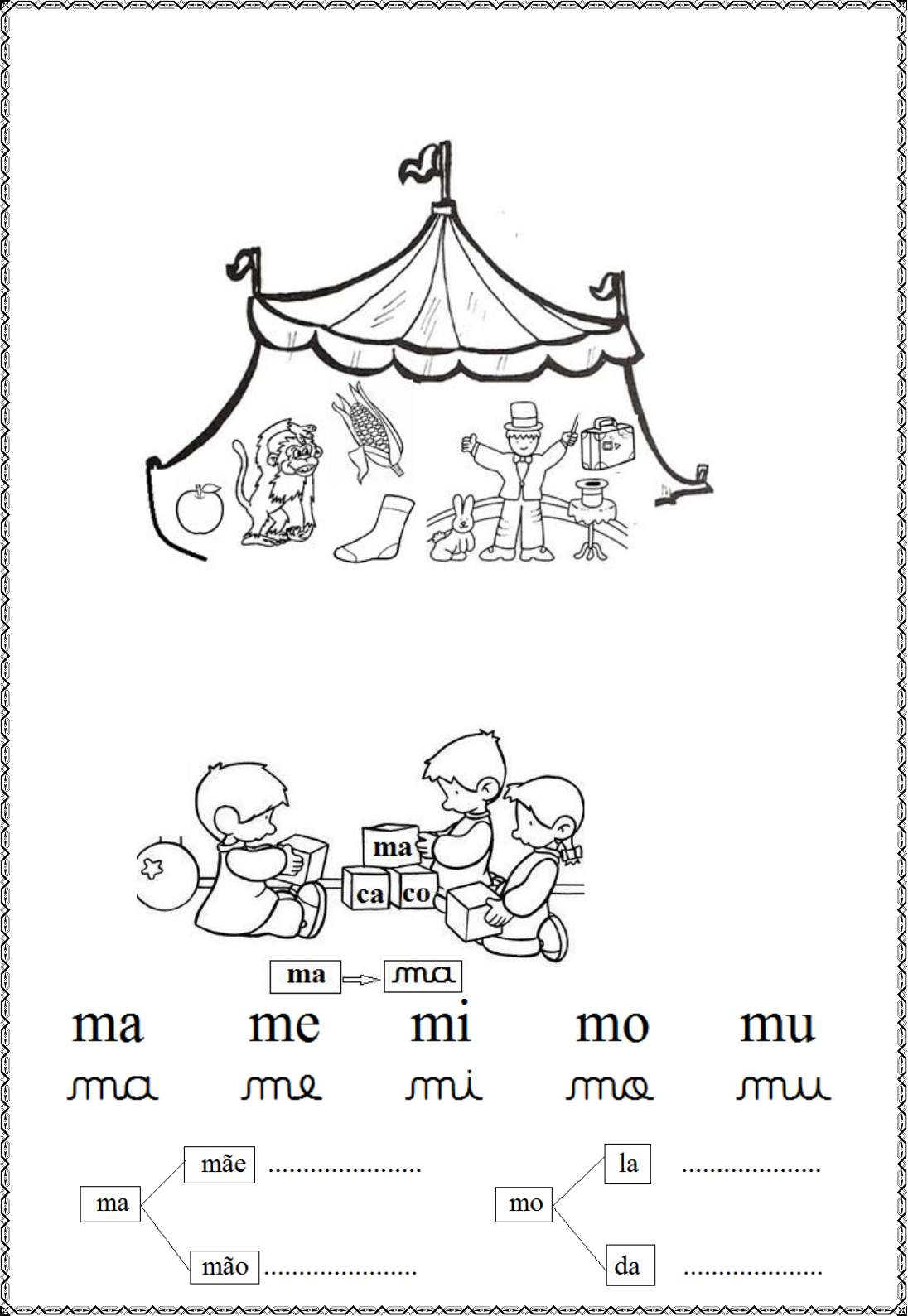 5) Mimo está encantado com o mágico do circo. Descubra ao lado do mágico várias figuras que têm nome começado com ma, me, mi, mo ou mu, circule e depois escreva o nome de dois deles. ................................... ................................. 6) Observe, copie e forme palavras: 7) Faça um círculo ao redor da sílaba ma: mala amado goma meia amiga lama miou mula mola cama dama medo 8) Ligue e forme palavras: 9) Forme palavras usando as sílabas que estão no quadro. Siga o modelo: 3, 2 e 6 → macaco 2 e 3 → .................................................. 3 e 4 → .................................................. 7 e 1 → .................................................. 4 e 3 → .................................................. 5, 9 e 6 → .............................................. 5 e 8 → .................................................. 7 e 4 → .................................................. 5, 4 e 8 → .............................................. 10 e 4 → ................................................