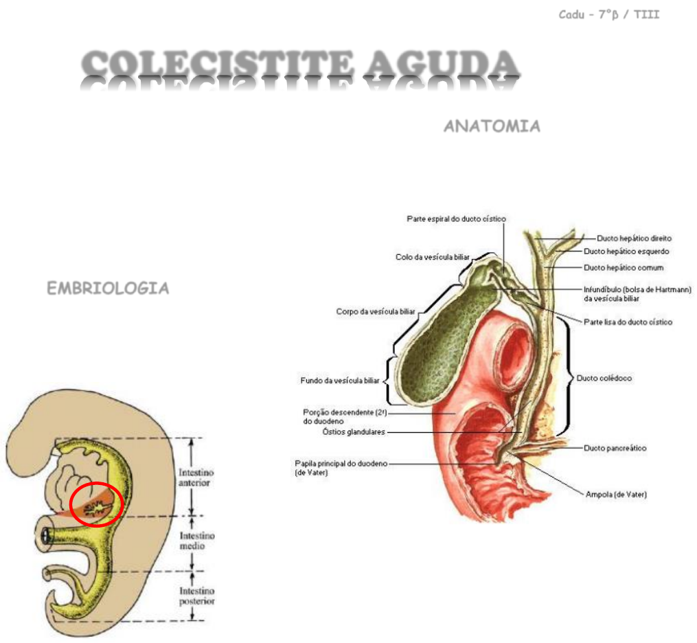 Cadu – 7°β / TIII • Processo inflamatório da vesícula biliar. • Litiásica ou alitiásica. • Pode haver resolução espontânea. - Regressão do quadro inflamatório em até 4 meses. EMBRIOLOGIA • O intestino primitivo embrionário é dividido em anterior, médio e posterior. - Se forma durante a quarta semana. VASCULARIZAÇÃO • Intestino anterior - Tronco celíaco. • Intestino médio - a. mesentérica superior. • Intestino posterior - a. mesentérica inferior. VESÍCULA BILIAR • Originada do intestino anterior. - Compreende a formação do fígado e de todo o sistema biliar (ductos hepáticos, vesícula biliar e ducto biliar). ANATOMIA SISTEMA BILIAR • Porções intra e extra – hepáticas. - EXTRA – HEPÁTICO • Ducto hepático esquerdo - Porção extra – hepática de 2cm. • Ducto hepático direito - Porção extra – hepática < esquerdo. • Ducto hepático comum - União dos ductos hepáticos direito e esquerdo. - Une ao ducto cístico para formar o colédoco. • Ducto cístico - Une o colo da vesícula biliar ao ducto hepático comum. - 1 – 5cm de comprimento. - 3 – 7mm de diâmetro. - Válvulas de Heister: impedem que cálculos migrem para o colédoco. COLECISTITE AGUDA Cadu – 7°β / TIII • Vesícula biliar - Fossa da vesícula biliar na face visceral do fígado. - 7 – 10cm de comprimento. - 3 – 5cm de diâmetro. - 30 – 60ml de volume. - Armazena e concentra a bile. - Válvulas de Heister. - Porções: fundo, corpo e colo. • Colédoco - União dos ductos cístico e hepático comum. - Termina na papila maior do duodeno. - 5 – 9cm de comprimento. - Porções: supra – duodenal, retroduodenal e intrapancreático. - VASCULARIZAÇÃO • a. aorta abdominal - Tronco celíaco. • Tronco celíaco - a. gástrica esquerda. - a. esplênica. - a. hepática comum. • a. hepática comum - a. gástrica direita. - a. gastroduodenal. - a. hepática própria. • a. gastroduodenal - Nutre o colédoco e o ducto hepático comum juntamente com as aa. retroduodenal e pancreatoduodenal. • a. hepática própria - a. hepática direita. - a. hepática esquerda. • a. hepática direita - a. cística. • a. cística - Pode ter origem variada (a. hepática comum, a. hepática esquerda, a. gastroduodenal, a. mesentérica superior...). - Nutre a vesícula biliar. TRIÂNGULO DE CALOT - Trígono cisto – hepático. - LIMITES • Ducto cístico. • Ducto hepático comum. • Borda inferior do fígado. - ESTRUTURAS • a. cística. Cadu – 7°β / TIII • a. hepática direita. • Linfonodo do ducto cístico. FISIOLOGIA BILE • Sintetizada pelos hepatócitos. - 600ml – 1L / dia. • Armazenada na vesícula biliar. - FUNÇÕES • Emulsificação de gorduras. • Auxílio na absorção de gorduras. • Excreção de Bb. • Excreção de colesterol. - COMPOSIÇÃO • Sais biliares. - Ação emulsificante. - Auxiliam na absorção de ác. graxos, monoglicerídeos e colesterol. - Secreção êntero – hepática: secretados na bile, atingem a circulação por absorção no intestino delgado e retornam ao fígado pela v. porta. • Água. • Cloreto. • Eletrólitos. • Bb. - Pigmento amarelado. - Hemocaterese no baço. - Circulação sanguínea ligada à albumina, sendo captada pelo fígado e excretada na bile. • Lecitinas. - Componentes: glicolipídeos, TG e fosfolipídeos. - Membranas celulares. • Colesterol. VESÍCULA BILIAR - ESVAZIAMENTO - Por contração. • O alimento na boca já inicia o processo de esvaziamento biliar. • Sua presença no duodeno gera grande secreção de bile. - Ação da colecistocinina produzida na primeira e na segunda porções do duodeno, especialmente pela presença de gordura no alimento, que gera feedback positivo para que ocorra grande secreção de bile. - Colecistocinina também atua relaxando a papila duodenal para que o conteúdo biliar possa chegar ao duodeno. COLELITÍASE FATORES DE RISCO • Mulher. - Estrogênio estimula a síntese de colesterol. - Progesterona reduz a contratilidade vesicular. • Gestações. • ACO. • > 40 anos. • Obesidade. - Hipersecreção de colesterol hipersatura a bile. Cadu – 7°β / TIII • HF. • Dismotilidade vesicular. - Estase. • Hipertrigliceridemia. - Causa estase biliar. • Dieta. - Carência de fibras. - Excesso de carboidratos e colesterol. • Cirrose. PATOGÊNESE - CÁLCULOS DE COLESTEROL - Mais comum. - FR: mulher, multiparidade, ACO e obesidade. • Supersaturação de colesterol na bile gera condensação e agregação dos cristais de colesterol. - Nucleação. • Em processo de redução do esvaziamento biliar, a formação dos cálculos é favorecida. - CÁLCULOS PIGMENTARES - Resultam da precipitação da Bb na bile. - FR: ambos sexos, cirrose, estase biliar, hemólise e infecções. • Pretos - Pequenos. - Firmes. - Formados pela associação ente Bb conjugada e Ca, formando o bilirrubinato de Ca. - Resultantes de processos hemolíticos. • Marrons - Moles. - Formados pela associação entre Bb não conjugada, colesterol e proteínas. - Resultantes de processos infeciosos. - Mais encontrados nos ductos biliares. - LAMA BILIAR - Fluido viscoso. - Formada por mucina, bilirrubinato de Ca e cristais de colesterol. • Ocorre desequilíbrio entre a síntese e a eliminação de mucina, o que persiste o processo de nucleação. FISIOPATOLOGIA • Obstrução do ducto cístico. • Inflamação da vesícula biliar. • Distensão. • Isquemia. • Necrose. • Perfuração. • Peritonite generalizada. • Sepse grave. ALTERAÇÕES HISTOPATOLÓGICAS • Edema subseroso. • Hemorragia subserosa. • Necrose de mucosa. • Leucócitos polimorfonucleares. • Fibrose. • Gangrena. • Perfuração. Cadu – 7°β / TIII APRESENTAÇÃO CLÍNICA • Dor abdominal em QSD. - Abaixo do gradil costal. • Dor referida em região infraescapular. • Febre. • Náusea. • Vômito. • Icterícia. - Obstrução do colédoco. - SD de Mirizzi: secundária