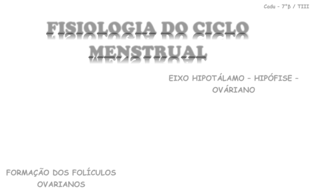 Cadu – 7°β / TIII • O ciclo objetiva a ocorrência de alterações endometriais para que fique preparado para a implantação do embrião. • Inicia no primeiro dia de menstruação e termina no dia anterior ao início da menstruação seguinte. • 24 – 38 dias. FORMAÇÃO DOS FOLÍCULOS OVARIANOS COMPONENTES DO FOLÍCULOS • Oócito. • Camada granulosa. - Interna. • Teca. - Externa. PERÍODO EMBRIONÁRIO • Oogônias, diploides, multiplicam por mitose para aumentar a população celular. • Células formadas sofrem meiose e são formadas as células germinativas femininas com 23 cromossomos. - Meiose fica estacionária até a fecundação. - Parte dessas células são perdidas durante a vida intrauterina. • Com a formação dos oócitos, as células da granulosa são inativadas, sendo formados os folículos primordiais. EIXO HIPOTÁLAMO – HIPÓFISE – OVÁRIANO - Responsável pelo ciclo. HORMÔNIOS HIPOTALÂMICOS • Liberador de gonadotrofina. - GnRH. • Liberador dor hormônio do crescimento. • Liberador de tireotrofina. • Liberador de corticotrofina. HORMÔNIOS HIPOFISÁRIOS - Adeno – hipófise. • Folículo estimulante. - FSH. • Luteinizante. - LH. • Tireoestimulante. • Adrenocorticotrófico. • GH. • Prolactina. GONADOTROFINAS - FSH e LH. • estimulam os folículos, a ovulação e a regulação da esteroidogênese ovariana. FISIOLOGIA DO CICLO MENSTRUAL Cadu – 7°β / TIII • Síntese dependente dos níveis de estrogênio, progesterona e inibina. CONTROLE DA SECREÇÃO DE GnRH - Feedback. • A secreção se dá de forma pulsátil / intermitente durante o ciclo, determinando a síntese de FSH e de LH. - Aumento da frequência e da amplitude da secreção na metade do ciclo aumenta o LH necessário para que ocorra a ovulação e para que a fase lútea comece na segunda fase do ciclo. - ALÇAS • Longa - Liberação de GnRH controlada pelos hormônios ovarianos. • Curta - Liberação de GnRH controlada pelos hormônios hipofisários LH e FSH. • Ultracurta - Liberação de GnRH controlada pelo próprio GnRH. - AÇÃO • Estimula a liberação de FSH e de LH pela hipófise anterior. FASE FOLICULAR / PROLIFERATIVA • Vai do primeiro dia de menstruação até o pico de LH. - Dura cerca de 14 dias. - Com o seu término ocorre a ovulação. • FSH age no recrutamento e no amadurecimento do folículo ovariano. INICIAL • No primeiro dia do ciclo os níveis de estrogênio e de progesterona estão baixos, o que resulta em pulsos de GnRH. - FSH aumenta: há recrutamento folicular e esteroidogênese. • Os folículos recrutados secretam estrogênio e se desenvolvem. - Folículo primordial se torna primário, visto diferenciação das células da granulosa. - O estágio secundário do folículo é atingido quando passa a ter duas camadas de células da granulosa, quando também as células tecais formam o estroma perifolicular. - Folículo fica mais sensível ao FSH, havendo mais proliferação das células da granulosa e entrada no estágio terciário. - No estágio pré – antral do folículo, quando a granulosa possui várias camadas, ocorre a síntese de estrogênio pelas células tecais estimuladas pelo LH. - Na fase antral o líquido folicular é rico em estrogênio e os folículos secretam estradiol. Além disso, o aumento do volume desse líquido em direção à superfície ovariana facilita a ovulação; • Com elevação do estrogênio, há feedback negativo sobre a secreção de FSH pela hipófise, mas também a aumento do estradiol. Cadu – 7°β / TIII • Dos folículos recrutados é selecionado o dominante, que inibe o crescimento dos outros, pela liberação de inibina, sendo regredidos. - Sétimo dia. - Fatores determinantes: maior quantidade de receptores de FSH e fluxo sanguíneo preferencial. - Inibina tem como ação impedir a síntese e a liberação de FSH. TARDIA - Metade do ciclo. • Aumento do estradiol gera feedback positivo que resulta no pico de LH. - LH proporciona o término da maturação do folículo, havendo expulsão do oócito / ovulação e formação do corpo lúteo. FASE LÚTEA • Inicia com a ovulação e termina no dia anterior ao início da menstruação. - Dura cerca de 14 dias, tempo em que o corpo lúteo permanece na superfície ovariana. • Caracterizada pela síntese de progesterona pelas células tecais. - Colesterol circulante é captado e convertido em progesterona. PROCESSO • Corpo lúteo inicia a síntese de progesterona e estradiol aumenta novamente. - Secreção de GnRH é mantida, de modo que a liberação de LH > fase folicular. - Níveis de progesterona aumentam subitamente, sendo um sinal positivo de que ocorreu ovulação. - Pico de progesterona ocorre 8 dias após o pico de LH. • A manutenção das taxas de estradiol e de inibina evitam o aumento do FSH. • Não havendo fecundação, o corpo lúteo regride. - Níveis de progesterona, estradiol e inibina diminuem. • Endométrio descama. • Perda do feedback negativo dobre o eixo hipotálamo – hipófise – ováriano com consequente aumento da frequência dos pulsos de GnRH e FSH. - Início do novo ciclo. Cadu – 7°β / TIII CICLO ENDOMETRIAL • As alterações endometriais são determinadas pelas diferentes [ estradiol e progesterona ] durante o ciclo menstrual. FASE FOLICULAR • Estrogênio estimula a proliferação endometrial. - Espessura do endométrio aumenta. FASE LÚTEA • Ocorre acúmulo de glicogênio. • Estrogênio diminui e a progesterona bloqueia os receptores endometriais de estrogênio. MENSTRUAÇÃO • Resulta de espasmo vascular, com consequente isquemia endometrial, devido à falta dos esteroides sexuais. • Camada endometrial proliferada é eliminada.