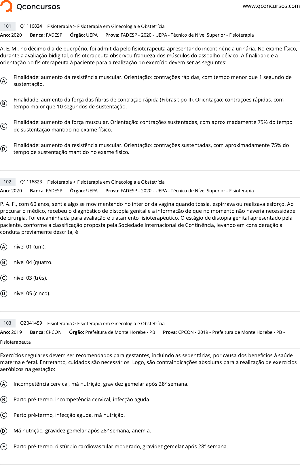 www.qconcursos.com Ano: 2020 Banca: FADESP Órgão: UEPA A. E. M., no décimo dia de puerpério, foi admitida pelo �sioterapeuta apresentando incontinência urinária. No exame físico, durante a avaliação bidigital, o �sioterapeuta observou fraqueza dos músculos do assoalho pélvico. A �nalidade e a orientação do �sioterapeuta à paciente para a realização do exercício devem ser as seguintes: A Finalidade: aumento da resistência muscular. Orientação: contrações rápidas, com tempo menor que 1 segundo de sustentação. B Finalidade: aumento da força das �bras de contração rápida (Fibras tipo II). Orientação: contrações rápidas, com tempo maior que 10 segundos de sustentação. C Finalidade: aumento da força muscular. Orientação: contrações sustentadas, com aproximadamente 75% do tempo de sustentação mantido no exame físico. D Finalidade: aumento da resistência muscular. Orientação: contrações sustentadas, com aproximadamente 75% do tempo de sustentação mantido no exame físico. Ano: 2020 Banca: FADESP Órgão: UEPA P. A. F., com 60 anos, sentia algo se movimentando no interior da vagina quando tossia, espirrava ou realizava esforço. Ao procurar o médico, recebeu o diagnóstico de distopia genital e a informação de que no momento não haveria necessidade de cirurgia. Foi encaminhada para avaliação e tratamento �sioterapêutico. O estágio de distopia genital apresentado pela paciente, conforme a classi�cação proposta pela Sociedade Internacional de Continência, levando em consideração a conduta previamente descrita, é A nível 01 (um). B nível 04 (quatro. C nível 03 (três). D nível 05 (cinco). Ano: 2019 Banca: CPCON Órgão: Prefeitura de Monte Horebe - PB Exercícios regulares devem ser recomendados para gestantes, incluindo as sedentárias, por causa dos benefícios à saúde materna e fetal. Entretanto, cuidados são necessários. Logo, são contraindicações absolutas para a realização de exercícios aeróbicos na gestação: A Incompetência cervical, má nutrição, gravidez gemelar após 28º semana. B Parto pré-termo, incompetência cervical, infecção aguda. C Parto pré-termo, infecção aguda, má nutrição. D Má nutrição, gravidez gemelar após 28º semana, anemia. E Parto pré-termo, distúrbio cardiovascular moderado, gravidez gemelar após 28º semana. 101 Q1116824 >Fisioterapia Fisioterapia em Ginecologia e Obstetrícia Prova: FADESP - 2020 - UEPA - Técnico de Nível Superior - Fisioterapia 102 Q1116823 >Fisioterapia Fisioterapia em Ginecologia e Obstetrícia Prova: FADESP - 2020 - UEPA - Técnico de Nível Superior - Fisioterapia 103 Q2041459 >Fisioterapia Fisioterapia em Ginecologia e Obstetrícia Prova: CPCON - 2019 - Prefeitura de Monte Horebe - PB - Fisioterapeuta https://www.qconcursos.com/ https://www.qconcursos.com/questoes-de-concursos/bancas/fadesp https://www.qconcursos.com/questoes-de-concursos/institutos/uepa https://www.qconcursos.com/questoes-de-concursos/bancas/fadesp https://www.qconcursos.com/questoes-de-concursos/institutos/uepa https://www.qconcursos.com/questoes-de-concursos/bancas/cpcon https://www.qconcursos.com/questoes-de-concursos/institutos/prefeitura-de-monte-horebe-pb https://www.qconcursos.com/questoes-de-concursos/questoes/18d022d6-42 https://www.qconcursos.com/questoes-de-concursos/disciplinas/fisioterapia-fisioterapia https://www.qconcursos.com/questoes-de-concursos/disciplinas/fisioterapia-fisioterapia/fisioterapia-em-ginecologia-e-obstetricia https://www.qconcursos.com/questoes-de-concursos/provas/fadesp-2020-uepa-tecnico-de-nivel-superior-fisioterapia https://www.qconcursos.com/questoes-de-concursos/questoes/18ca8cab-42 https://www.qconcursos.com/questoes-de-concursos/disciplinas/fisioterapia-fisioterapia https://www.qconcursos.com/questoes-de-concursos/disciplinas/fisioterapia-fisioterapia/fisioterapia-em-ginecologia-e-obstetricia https://www.qconcursos.com/questoes-de-concursos/provas/fadesp-2020-uepa-tecnico-de-nivel-superior-fisioterapia https://www.qconcursos.com/questoes-de-concursos/questoes/5db96a1d-96 https://www.qconcursos.com/questoes-de-concursos/disciplinas/fisioterapia-fisioterapia https://www.qconcursos.com/questoes-de-concursos/disciplinas/fisioterapia-fisioterapia/fisioterapia-em-ginecologia-e-obstetricia https://www.qconcursos.com/questoes-de-concursos/provas/cpcon-2019-prefeitura-de-monte-horebe-pb-fisioterapeuta https://www.qconcursos.com/questoes-de-concursos/provas/cpcon-2019-prefeitura-de-monte-horebe-pb-fisioterapeuta Ano: 2019 Banca: CETREDE Órgão: Prefeitura de Juazeiro do Norte - CE A cintura pélvica é composta pela articulação sacroilíaca, pela sín�se púbica e pela articulação coxofemoral. Esta última corresponde à articulação do quadril. O exame físico deve ser realizado buscando-se dados relativos à inspeção, palpação, mobilidade articular, realização de alguns testes especiais e breve exame neurológico (motor e sensitivo). Sobre os testes especiais usados nessa articulação, marque a alternativa correta. A O teste de Trendelenburg é empregado para determinar a integridade da função dos músculos estensores do quadril. B O teste de Ortolani destina-se a detectar tanto as patologias do quadril, como as da articulação sacroilíaca. Com o paciente em decúbito dorsal, colocamos o calcanhar do membro inferior em questão sobre o joelho do lado oposto; o examinador aplica então uma força sobre o joelho �etido e outra sobre a espinha ilíaca anterossuperior oposta, como se estivesse abrindo um livro.Se a dor for referida na região inguinal,pode haver patologia na articulação do quadril; caso a dor seja referida na região posterior, pode haver patologia na articulação sacroilíaca. C O teste de Patrick é utilizado para o diagnóstico da instabilidade do quadril. Consiste em colocar a criança em decúbito dorsal, segurando os membros inferiores pelos joelhos e �etindo os quadris em 90 graus; o p