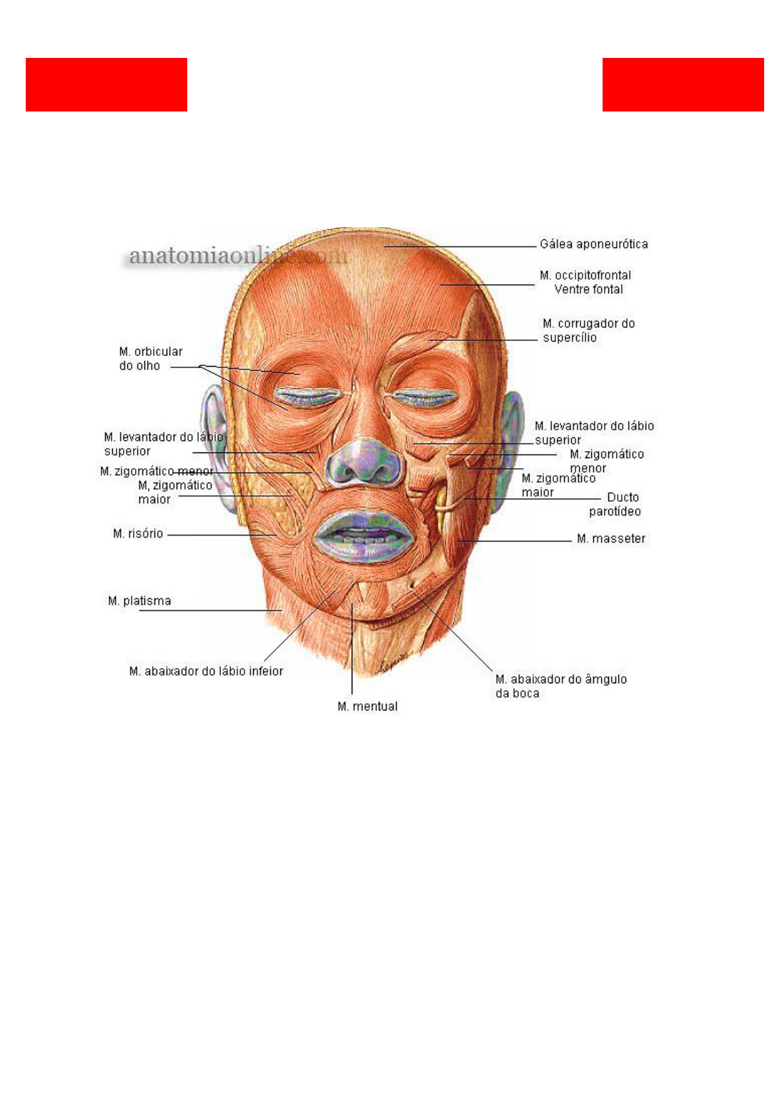 Músculos craniofaciais Os Músculos Craniofaciais agem na formação de expressões da face e como esfíncteres dos orifícios faciais, sendo todos inervados por ramos do Nervo facial (NC VII). Dividem-se em quatro grupos: • Epicranianos: composto pelos músculos occipitofrontal e temporoparietal • Circum-orbitais e Palpebrais: composto pelos músculos orbicular do olho e corrugador do supercílio; • Nasais: composto pelos músculos prócero, nasal, levantador da asa do nariz e do lábio superior e abaixador do septo nasal; • Bucolabiais: composto pelos músculos orbicular da boca, levantador do lábio superior, abaixador do lábio inferior, levantador e abaixador do ângulo da boca, zigomáticos maior e menor, bucinador, risório e mentual.